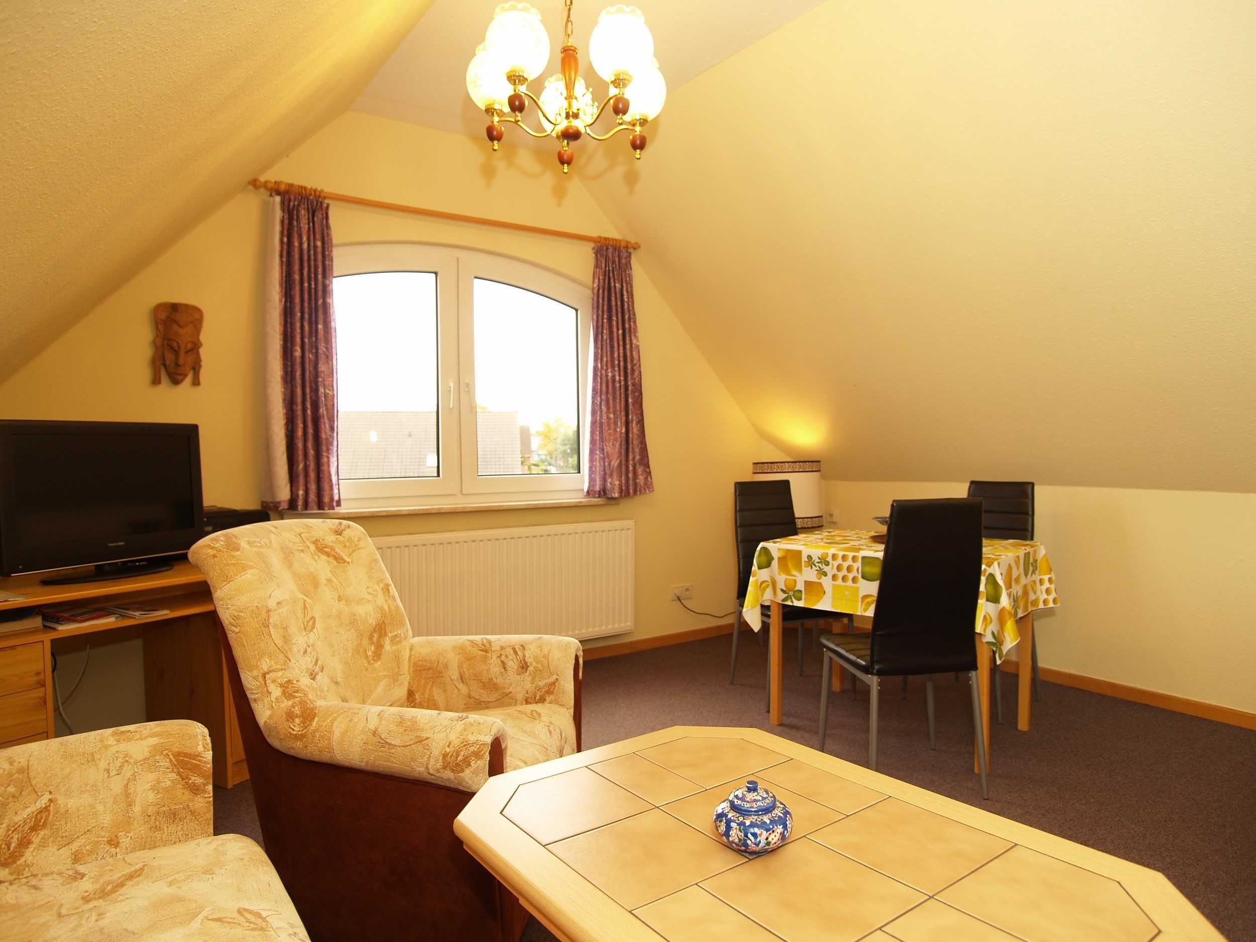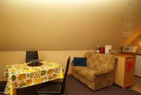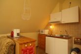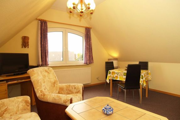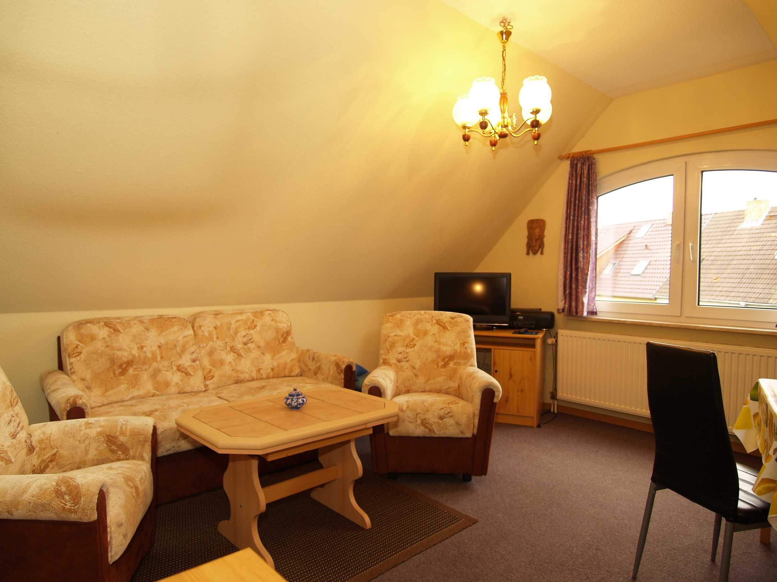 Sie wohnen in einer 52 m² großen 2-Raum-FeWo, die sich in der 1. Etage eines Wohnhauses befindet. Die Wohnung ist über einen separaten Eingang zu erreichen und verfügt über einen Wohnraum mit Polstermöbeln und Schlafcouch, Kabel-TV, Radio, Essplatz, Pantryküche mit 2 Kochplatten, Kühlschrank, Kaffeemaschine, Toaster, Mikrowelle, Schlafraum mit Doppelbett und Kleiderschrank sowie einem Bad mit DU/WC. Neben dem Haus befindet sich eine Sitzecke im Garten. Zum Strand und zum Yachthafen laufen Sie ca. 5 Minuten.