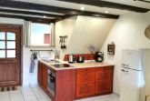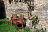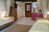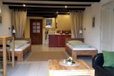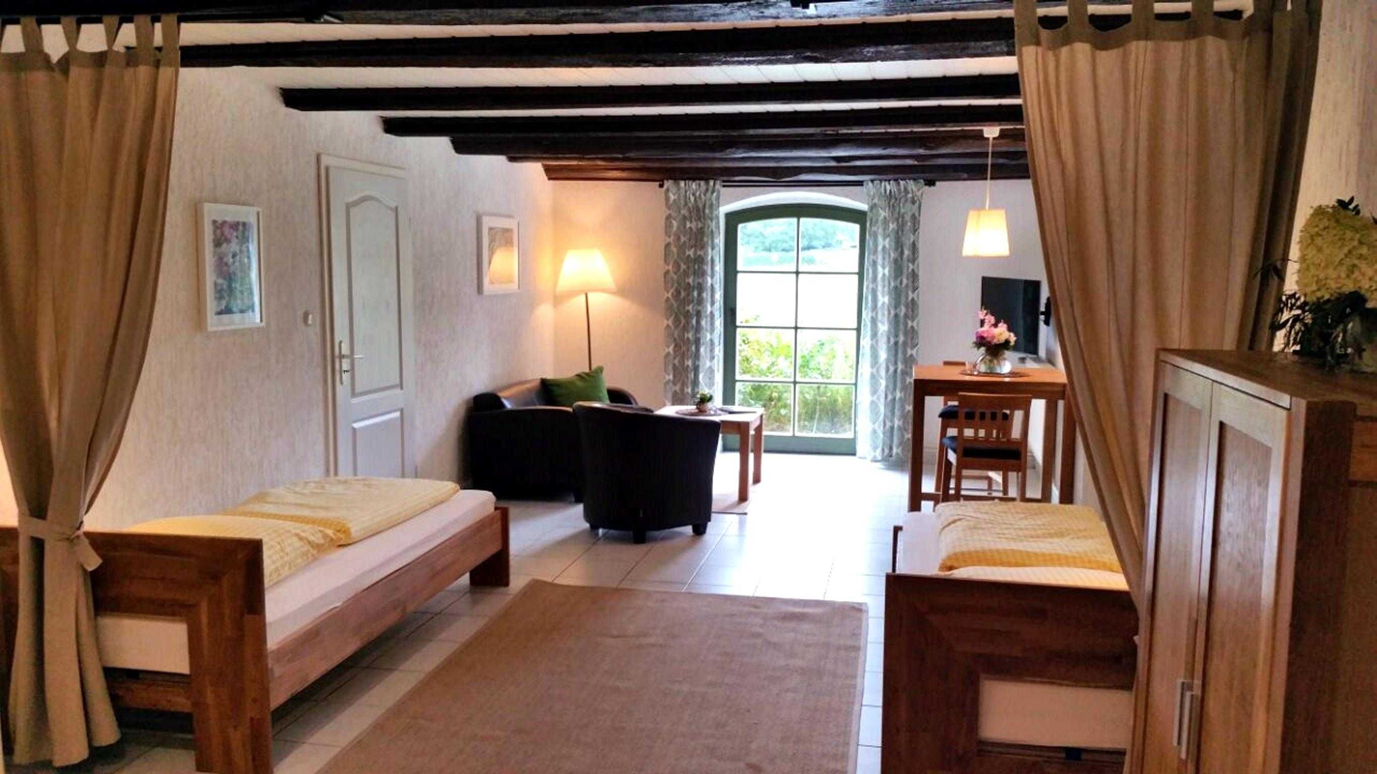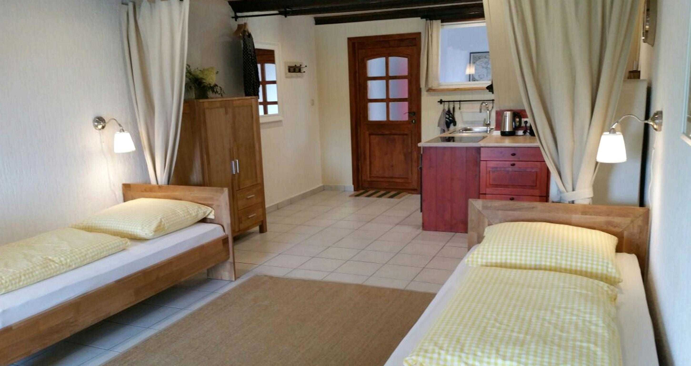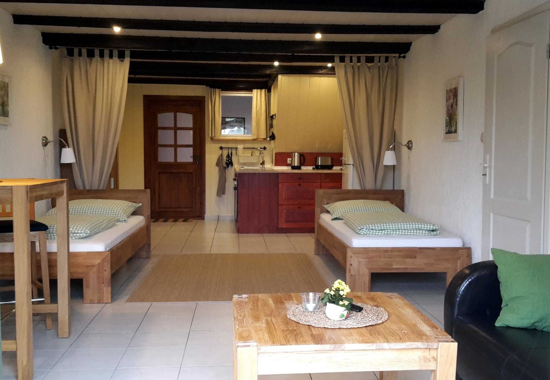 In dem Wohnraum sind Küche, Essplatz, Schlafzimmer und Sitzecke integriert. Die Wohnung ist mit schönem, massivem Holz- und Ledermobiliar eingerichtet. Sie schlafen in Einzelbetten, die bei Bedarf zusammenschiebbar sind. Aus der Terrassentür hat man einen direkten Zugang in den Garten, der direkt an den Feldrand grenzt.