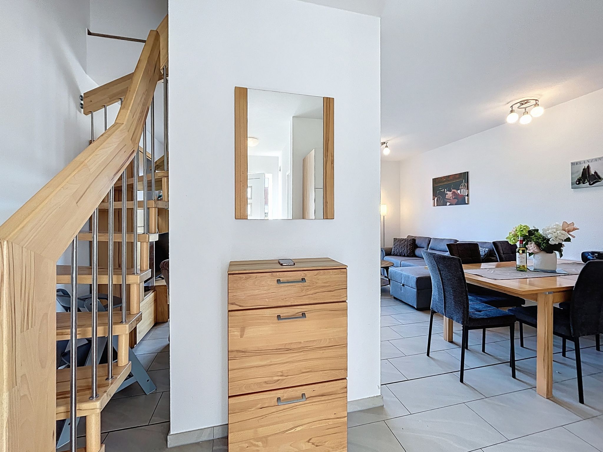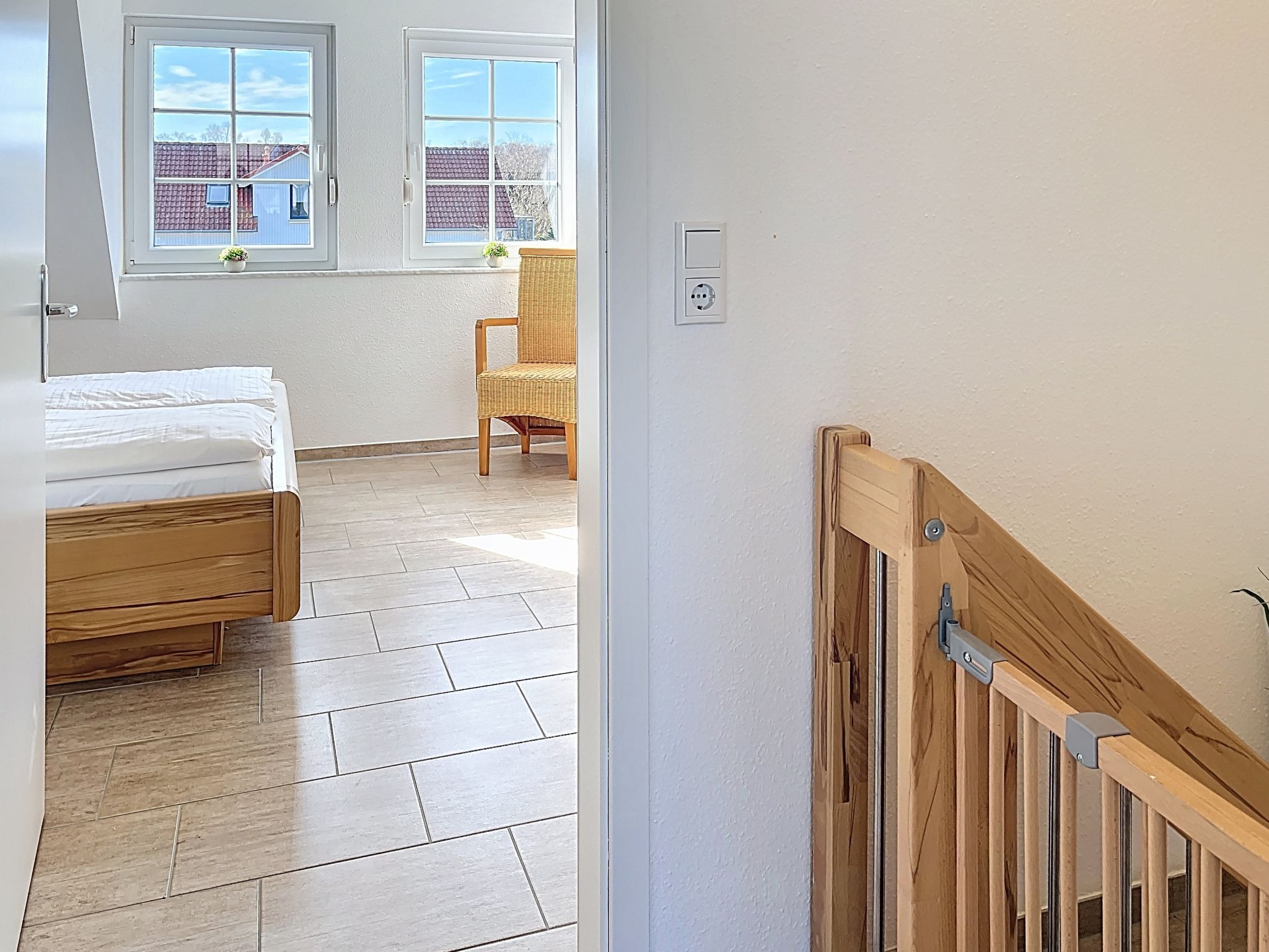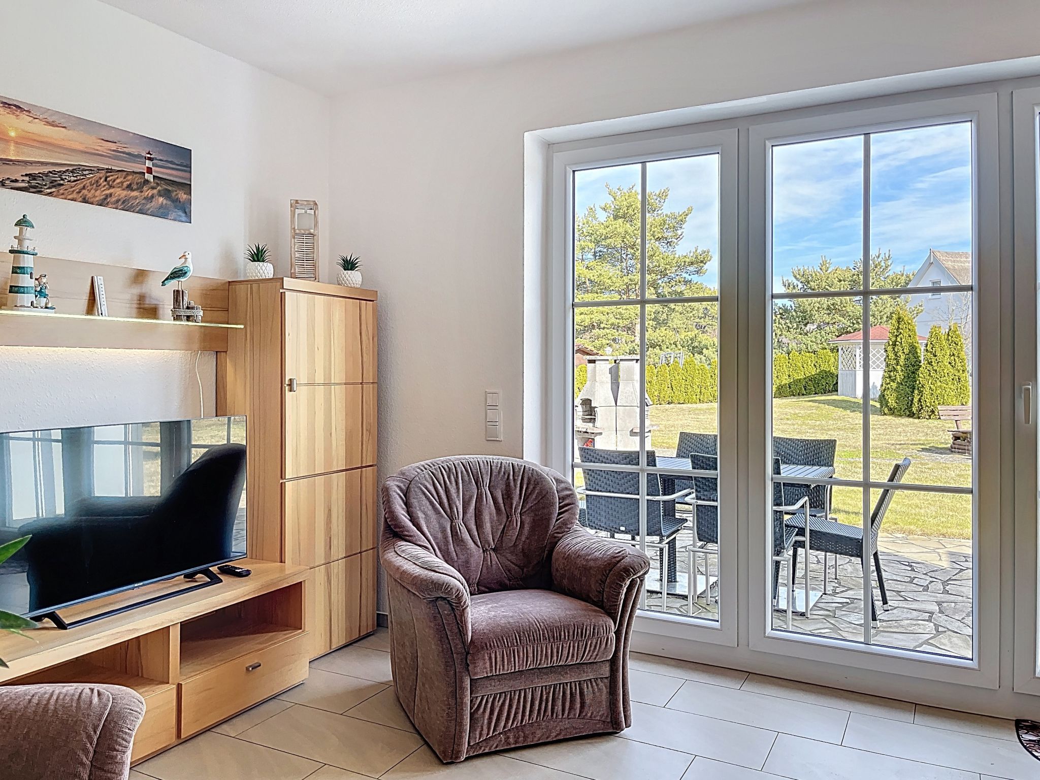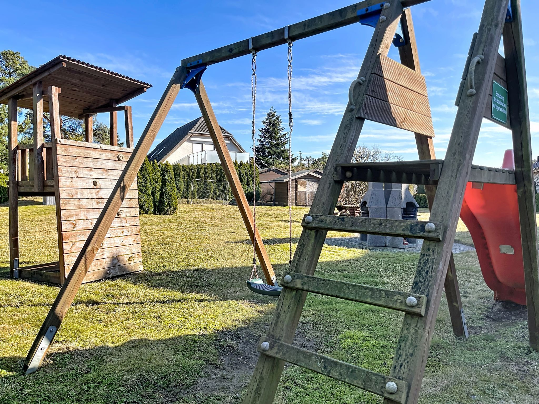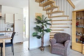 Ferienhaus Nordstern, 3-Zimmer-Reihenhaus 75 m2 auf 2 Stockwerken. Objekt geeignet für 5 Erwachsene. Geräumig und hell: offenes Wohn-/Esszimmer mit Esstisch und Kabel-TV (Flachbildschirm), Radio und CD. Ausgang zum Garten, zur Terrasse. Offene Küche (Backofen, Geschirrspüler, 4 Glaskeramikplatten, Toaster, Wasserkocher, Mikrowelle, elektrische Kaffeemaschine). Dusche/WC. Obergeschoss: 1 Zimmer mit 1 Diwanbett (140 cm, Länge 200 cm), 1 Doppelbett (180 cm, Länge 200 cm). 1 Zimmer mit 2 Betten (90 cm, Länge 200 cm). Sep. WC. Terrasse, grosser Garten. Terrassenmöbel, Gartengrill. Zur Verfügung: Waschmaschine, Kinderhochstuhl, Babybett, Haartrockner. Internet (WLAN, gratis). Parkplatz (1 Auto). Bitte beachten: geeignet für Familien. Nichtraucher-Haus. Rauchmelder. Markise am Haus. Grillplatz und Außenpavillion im Garten.