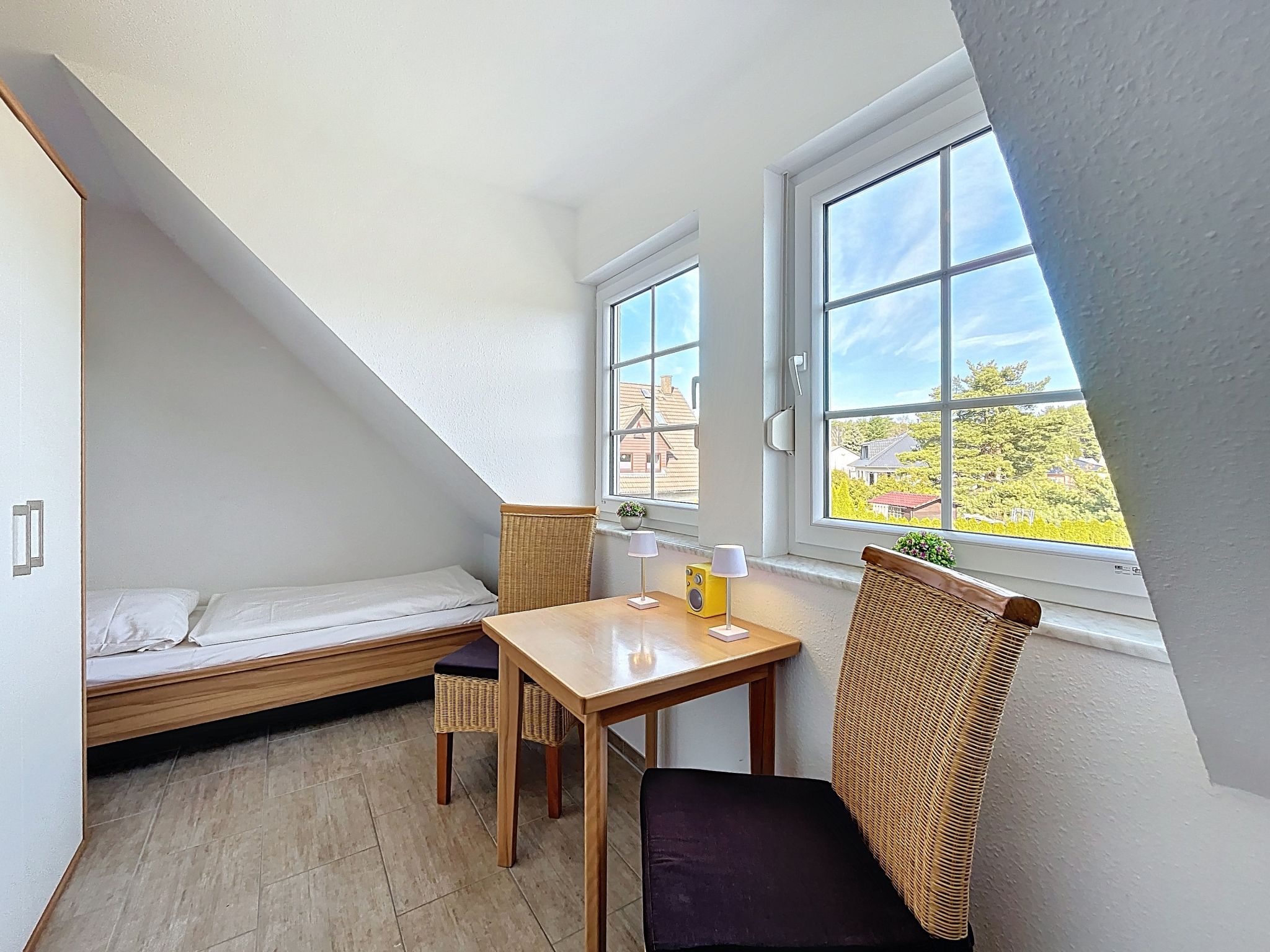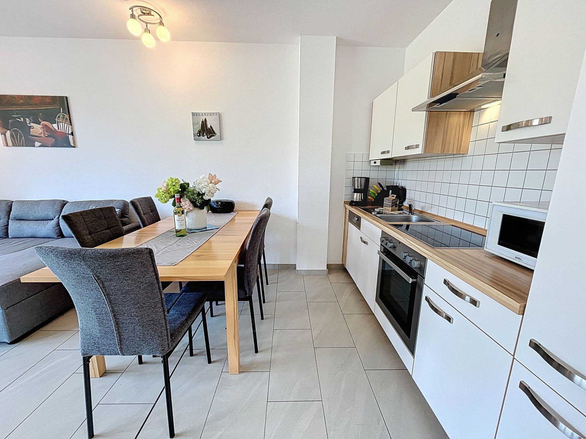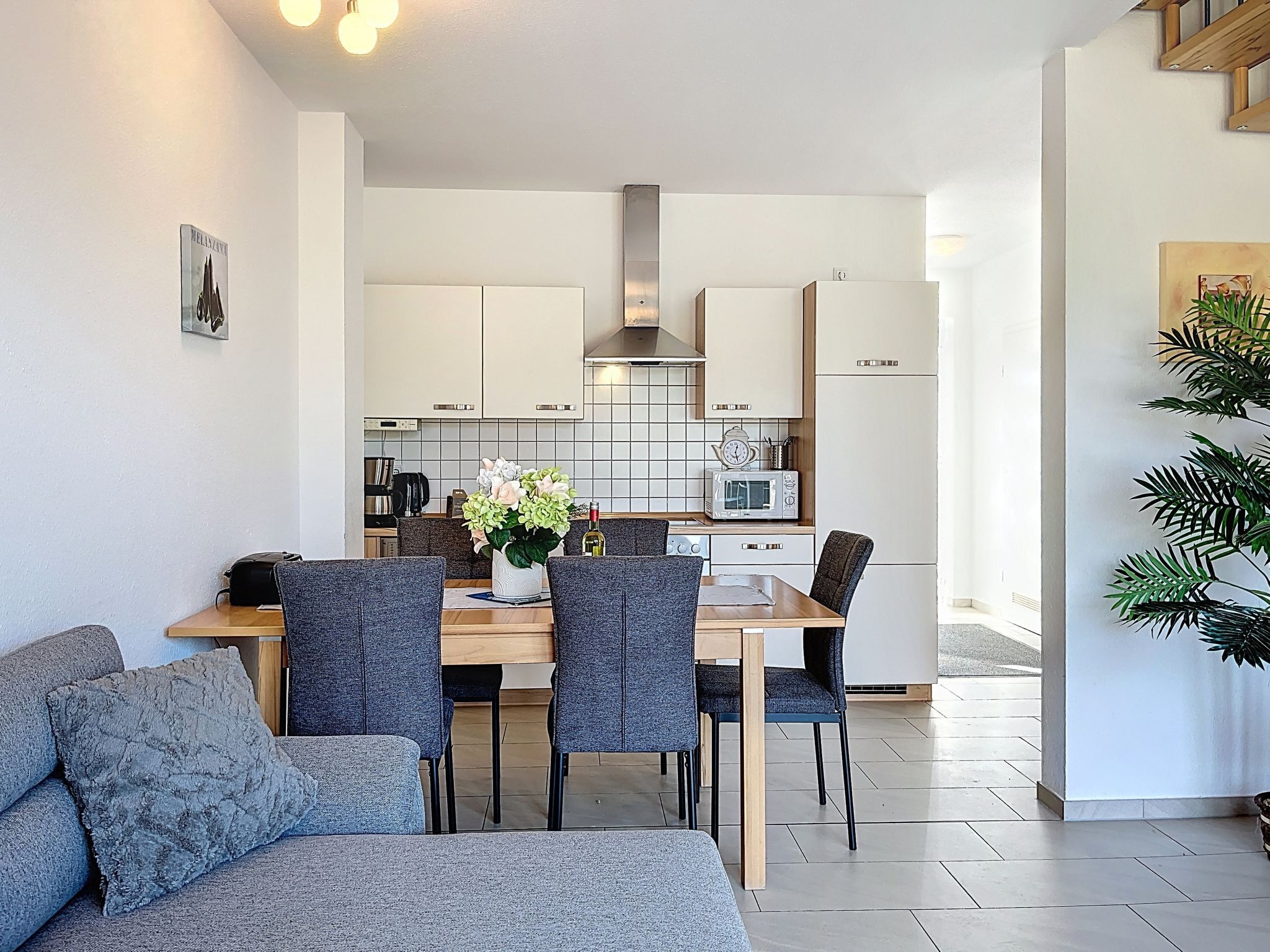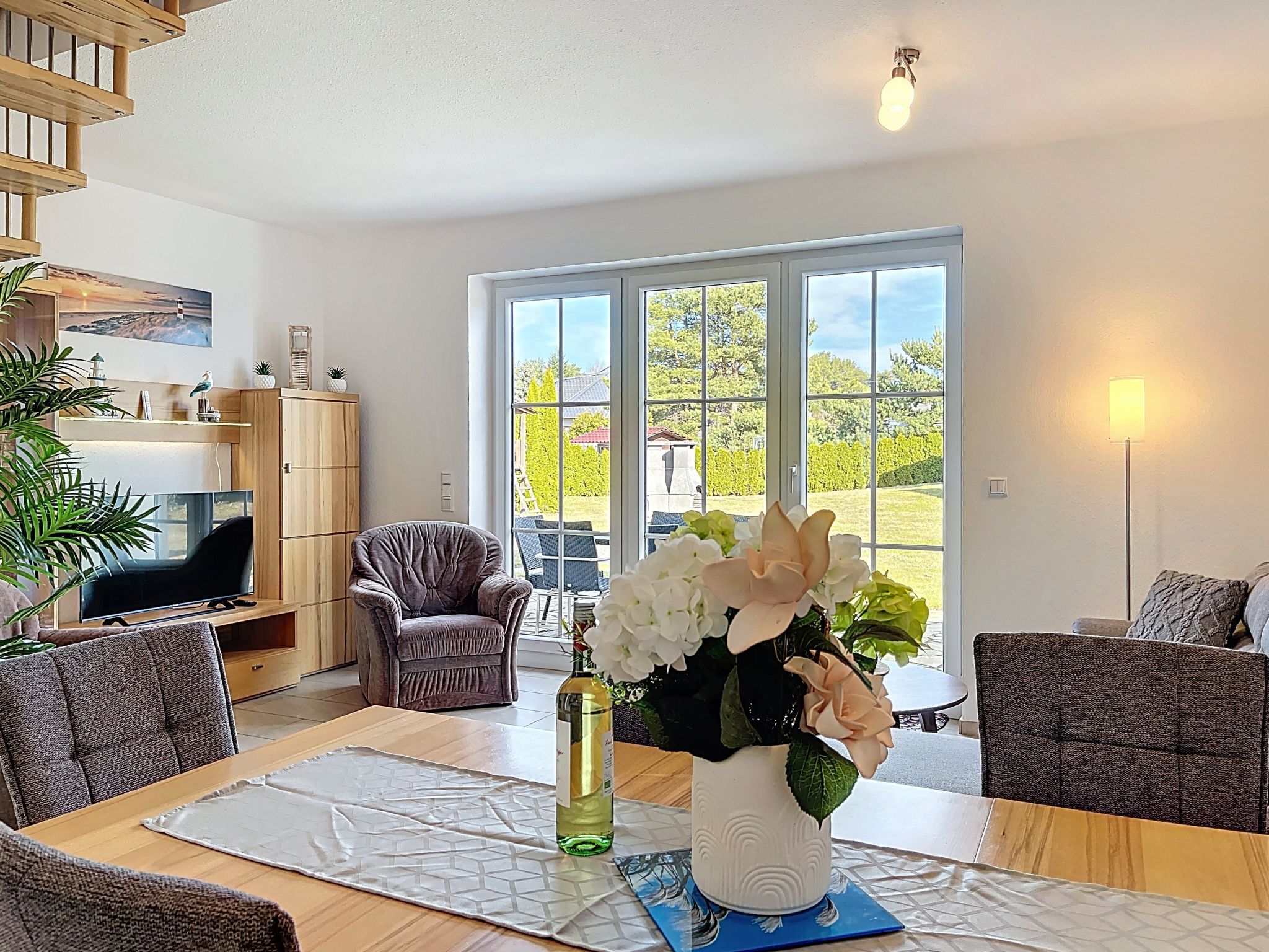 Ferienhaus Nordstern, 3-Zimmer-Reihenhaus 75 m2 auf 2 Stockwerken. Objekt geeignet für 5 Erwachsene. Geräumig und hell: offenes Wohn-/Esszimmer mit Esstisch und Kabel-TV (Flachbildschirm), Radio und CD. Ausgang zum Garten, zur Terrasse. Offene Küche (Backofen, Geschirrspüler, 4 Glaskeramikplatten, Toaster, Wasserkocher, Mikrowelle, elektrische Kaffeemaschine). Dusche/WC. Obergeschoss: 1 Zimmer mit 1 Diwanbett (140 cm, Länge 200 cm), 1 Doppelbett (180 cm, Länge 200 cm). 1 Zimmer mit 2 Betten (90 cm, Länge 200 cm). Sep. WC. Terrasse, grosser Garten. Terrassenmöbel, Gartengrill. Zur Verfügung: Waschmaschine, Kinderhochstuhl, Babybett, Haartrockner. Internet (WLAN, gratis). Parkplatz (1 Auto). Bitte beachten: geeignet für Familien. Nichtraucher-Haus. Rauchmelder. Markise am Haus. Grillplatz und Außenpavillion im Garten.