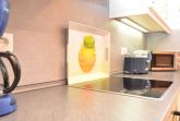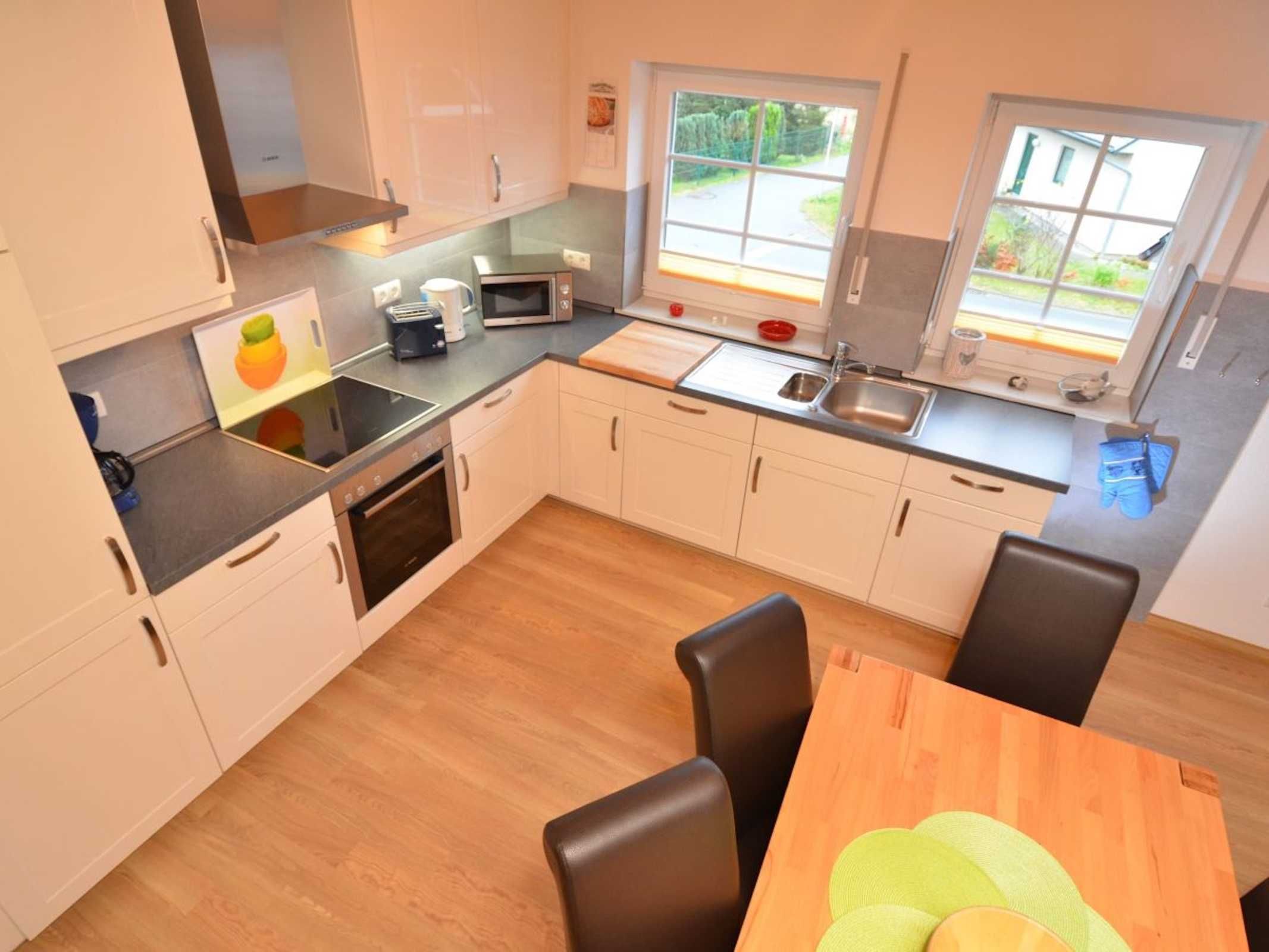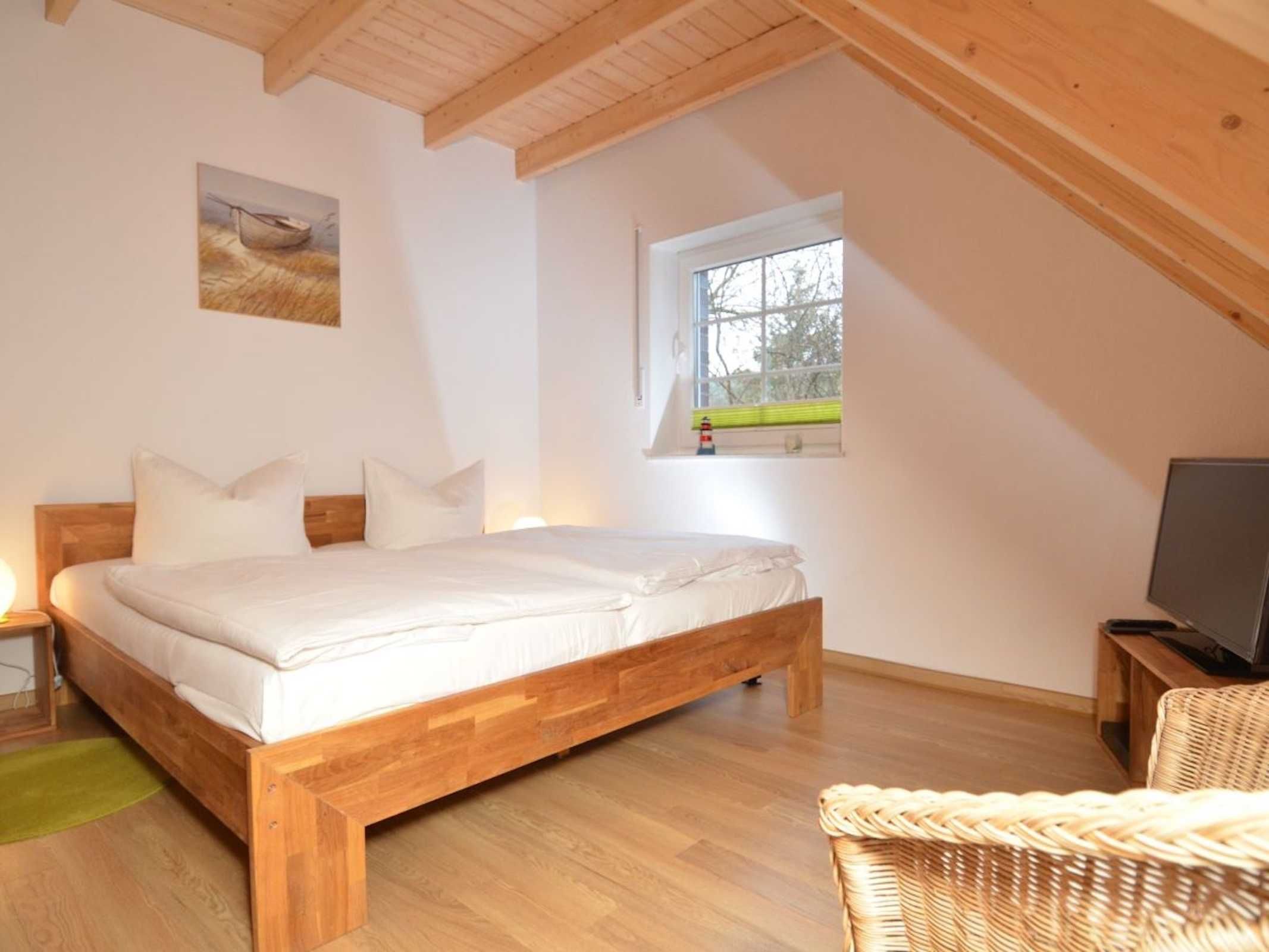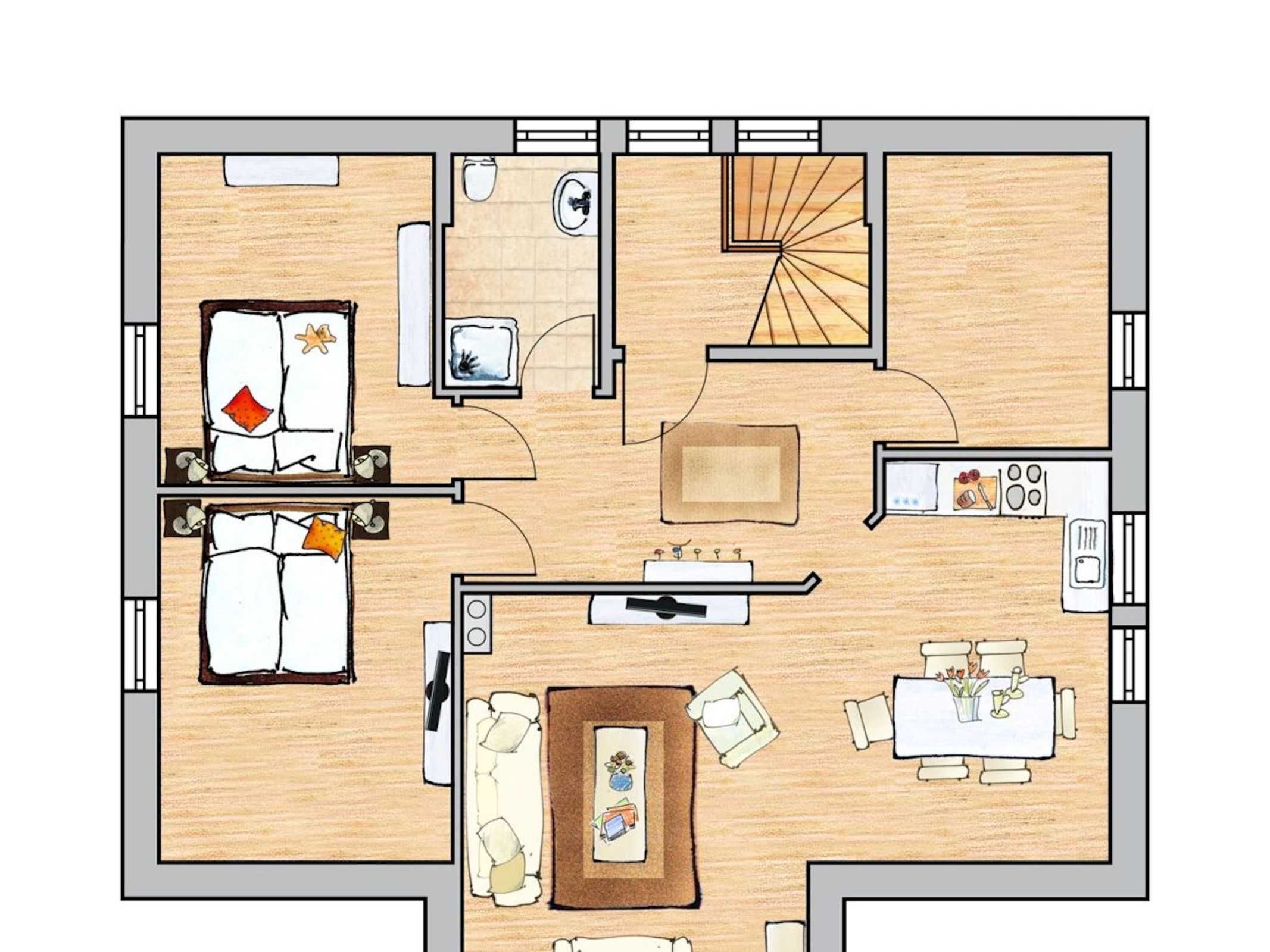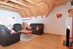 Das 3-Raum-Appartement mit ca. 80 qm Wohnfläche befindet sich im OG des Hauses. Der große, offene Wohn-/Essbereich ist ausgestattet mit einer gemütlichen Couchgarnitur, LCD-TV, Bluray-Player und einer Stereoanlage. Die im Wohnbereich harmonisch integrierte Küchenzeile verfügt über einen Kühl-/Gefrierschrank, Cerankochfeld, Backofen, Spülmaschine, Mikrowelle, Kaffeemaschine, Wasserkocher, Toaster, Handmixer und div. Kleinutensilien. 2 Schlafzimmer mit je 1 Doppelbett bieten ausreichend Stauraum für Ihre Garderobe. Eines der Schlafzimmer verfügt über einen LCD-TV. Alle Räume haben leichte Dachschrägen. Die sichtbaren Holzbalken im Wohn-/Essbereich reichen bis in die Giebelspitze, wo sie für eine besondere, gemütliche Wohnatmosphäre sorgen. Das Bad ist mit einer bodengleichen Dusche ausgestattet. Der bestuhlte, überdachte Balkon ist zur Südseite ausgerichtet. Eine eigene bestuhlte Grillterrasse befindet sich im Garten. Das Nichtraucherappartement ist für 1-4 Personen geeignet.