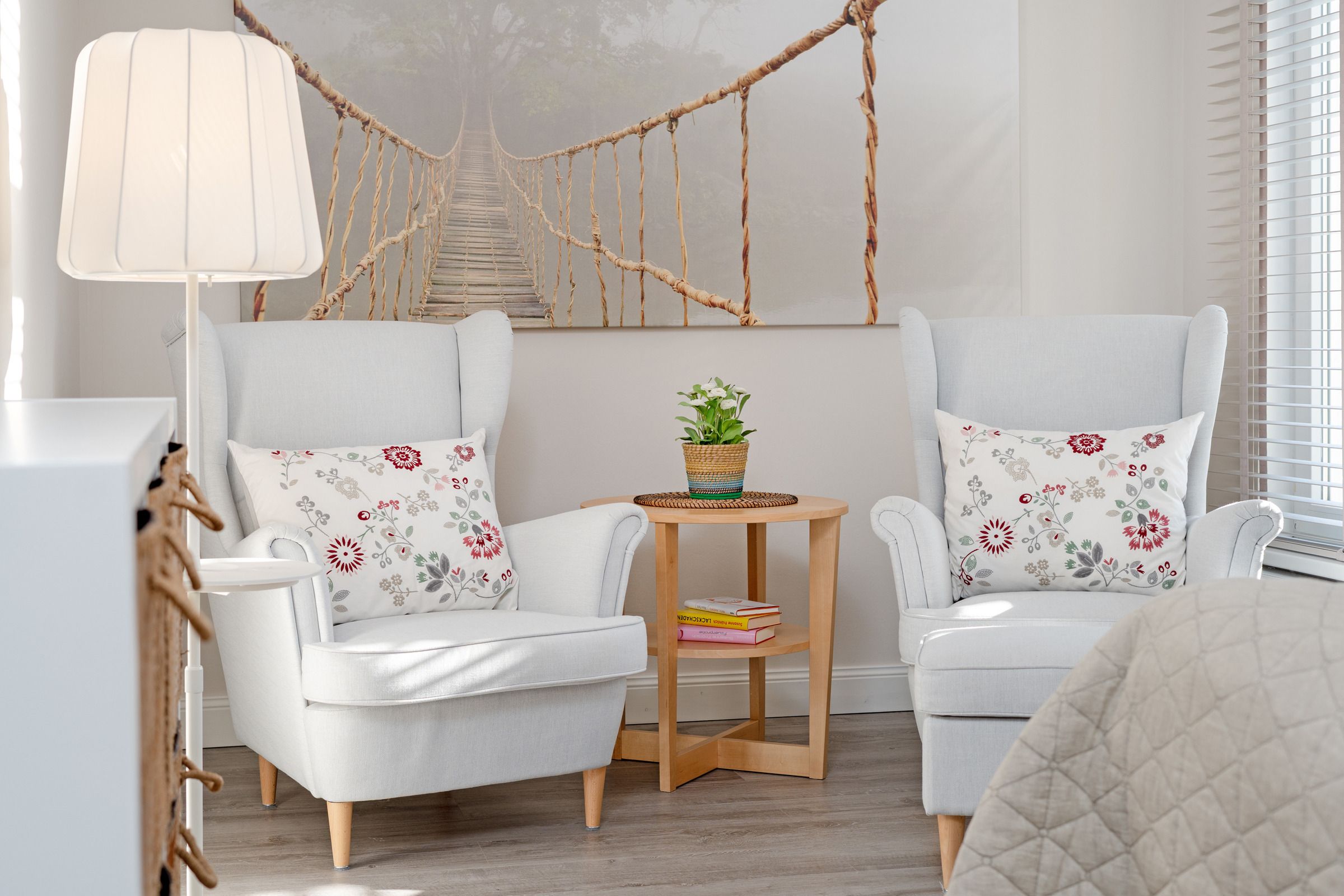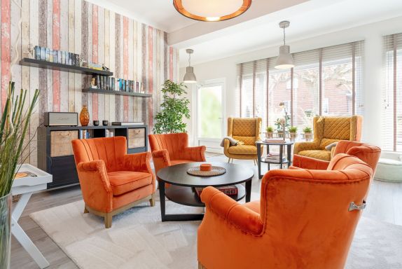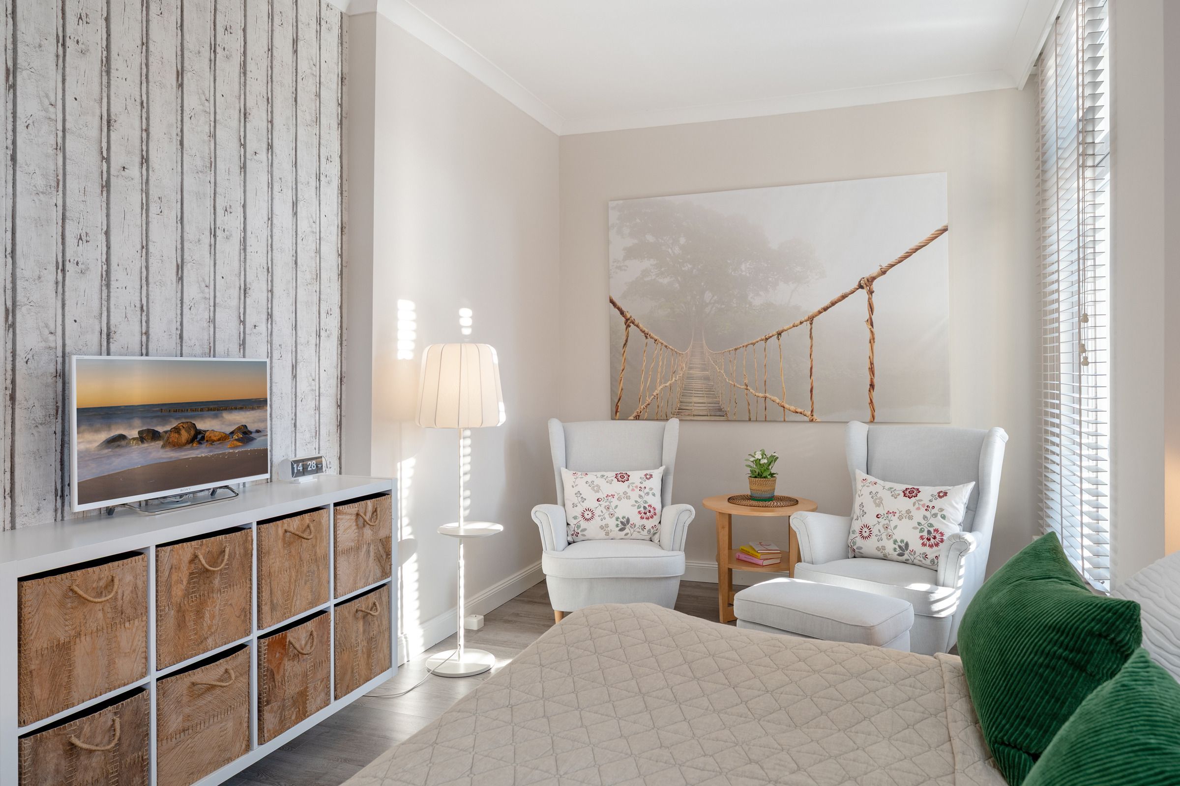 Beim Eintreten empfängt Sie der helle und weitläufige Wohnbereich mit gemütlicher Sofaecke, TV und viel Platz zum Entspannen. Große Fenster sorgen für eine freundliche Atmosphäre und lassen viel Tageslicht herein – perfekt, um gemeinsame Stunden zu verbringen oder den Urlaubstag entspannt ausklingen zu lassen. Vom Wohnbereich aus gelangen Sie auf die großzügige Terrasse mit ca. 25 m², die nach Süd-Osten ausgerichtet ist. Hier laden Gartenmöbel und Sonnenschirm zu ausgedehnten Frühstücken, sonnigen Nachmittagen oder lauen Abenden an der frischen Ostseeluft ein.