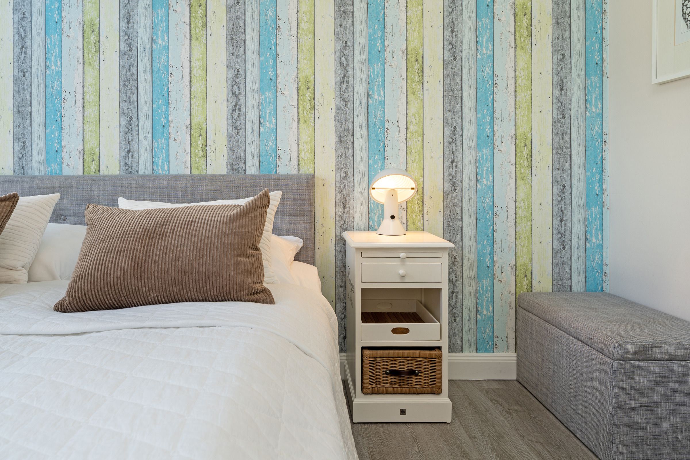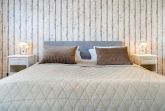 Schlafzimmer 2: 1 Boxspring-Doppelbett (180 x 200 cm) mit durchgehendem Topper, Kleiderschrank, TV, Verdunkelung: Jalousien, kein Platz für ein Babybett vorhanden