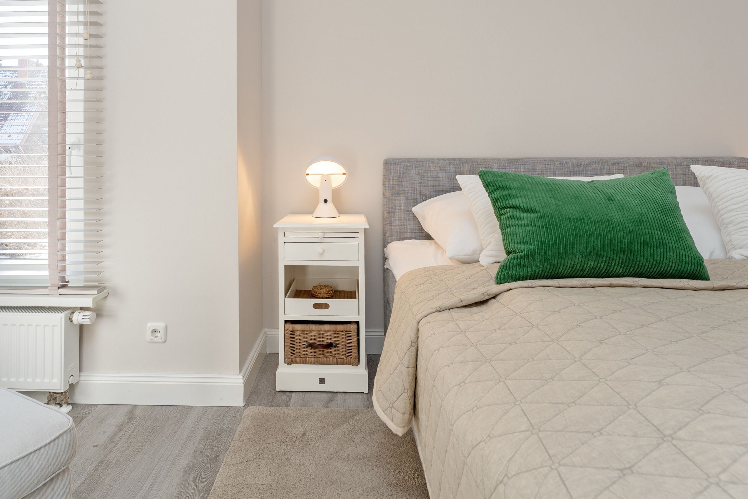 Schlafzimmer 1: 1 Boxspring-Doppelbett (180 x 200 cm) mit durchgehendem Topper, Kleiderschrank, TV, Verdunkelung: Jalousien, Platz für ein Babybett vorhanden