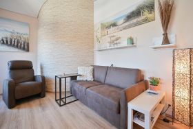 Der Wohn-Schlafraum ist mit einem Schlafsofa, Lesesessel, Couchtisch, Flachbild-TV, und integrierter Küche eingerichtet, sowie einen Esstisch für 2 Personen.