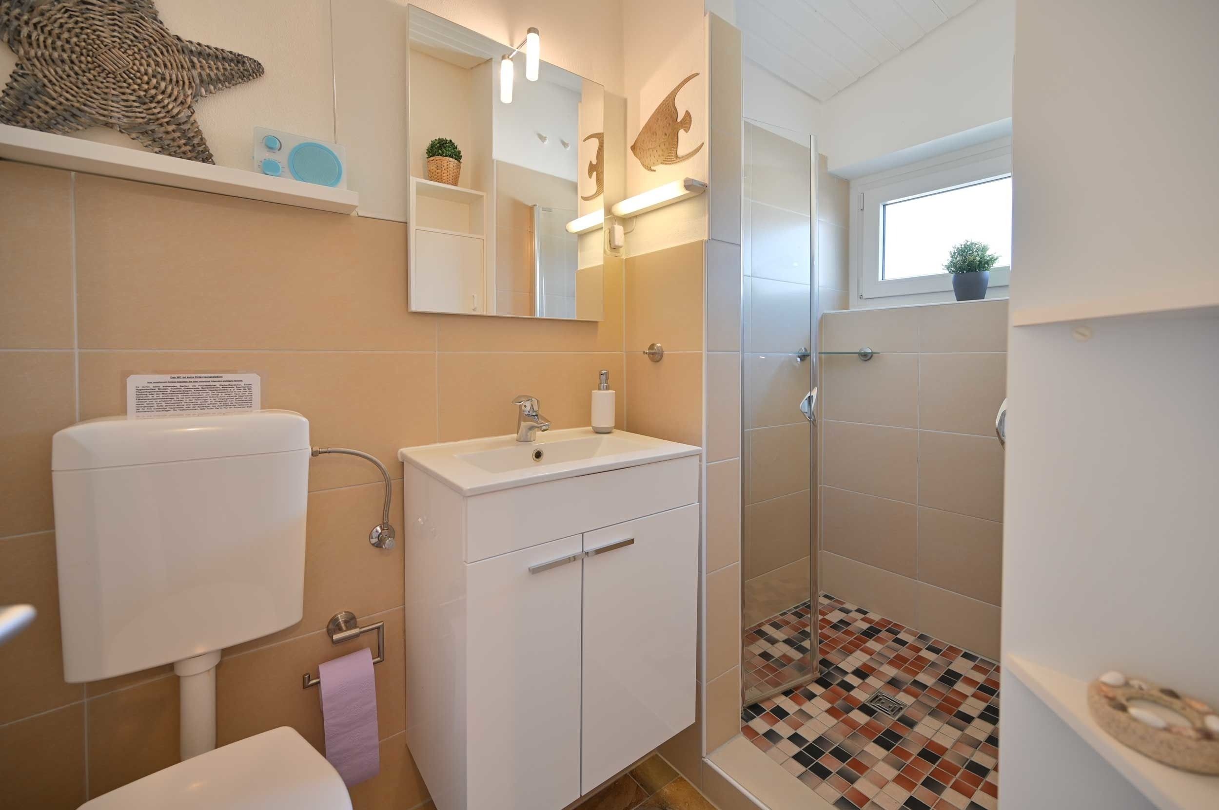 Das Badezimmer ist mit Dusche, WC und Waschbecken eingerichtet.
