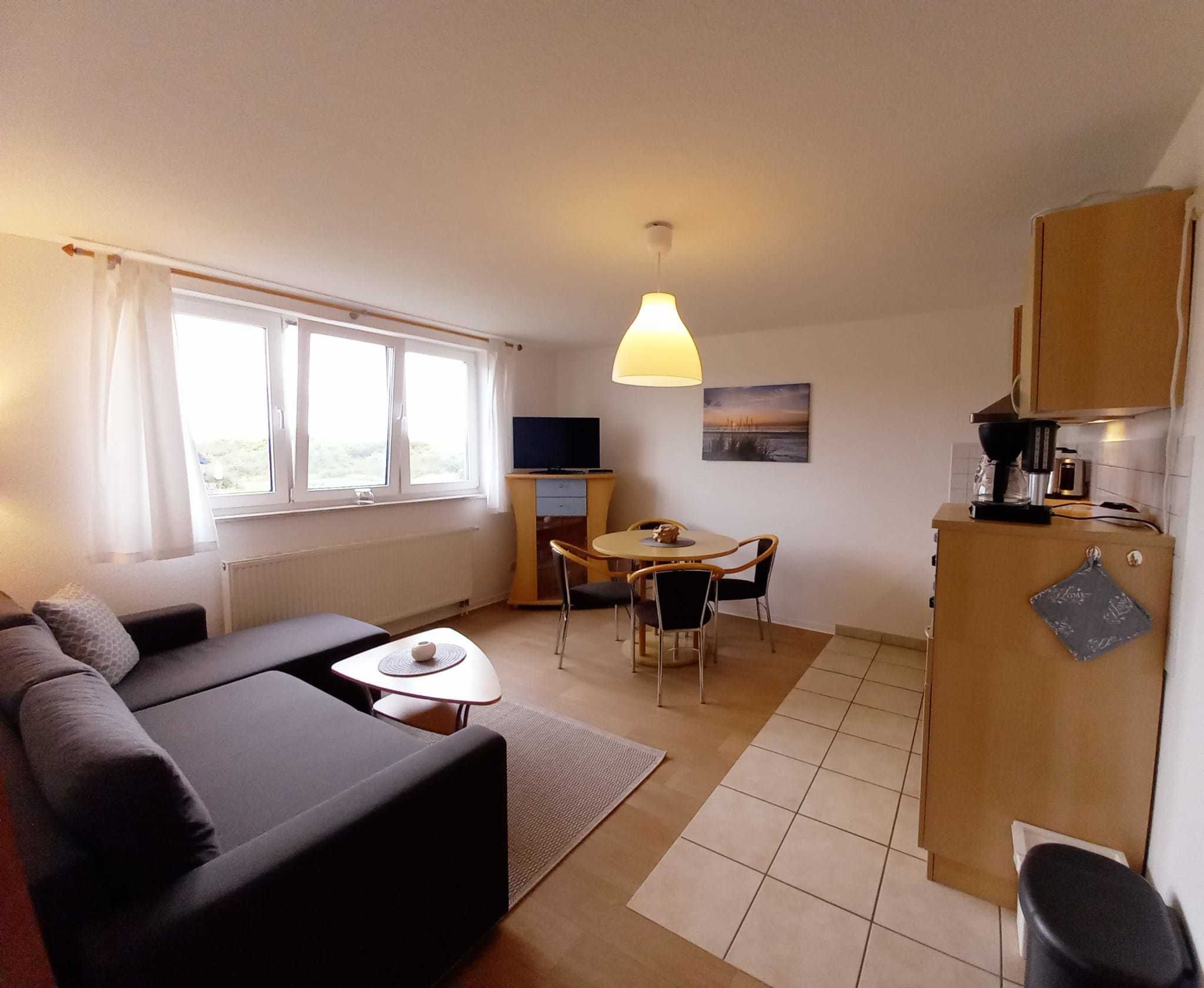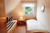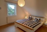 Die ca. 50 m² große Ferienwohnung im Obergeschoss verfügt über eine behagliche Ausstattung für Platz bis zu 6 Personen. Zwei Schlafräume mit einem Doppelbett, zwei Einzelbetten und im Wohnzimmer mit Platz für zwei Personen auf dem Schlafsofa. Im Wohnzimmer befindet sich außerdem eine vollausgestattete Küchenzeile mit Backofen, zwei Herdplatten, Kaffeemaschine, Toaster, Wasserkocher und Kühlschrank mit TK-Fach, sowie einem Esstisch mit sechs gemütlichen Stühlen. Im Garten stehen für Sie Gartenmöbel und eine Grillmöglichkeit zur Verfügung.