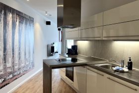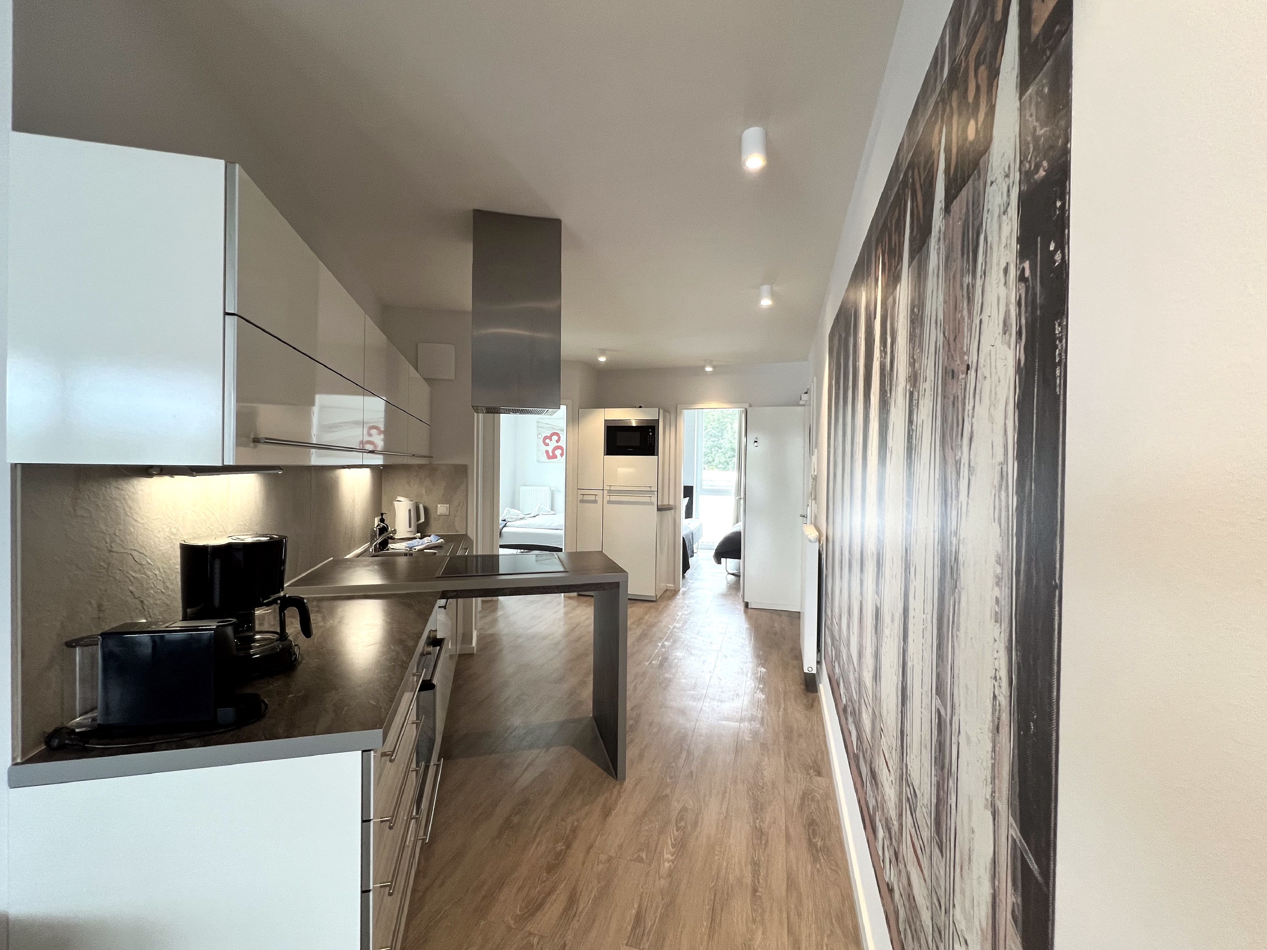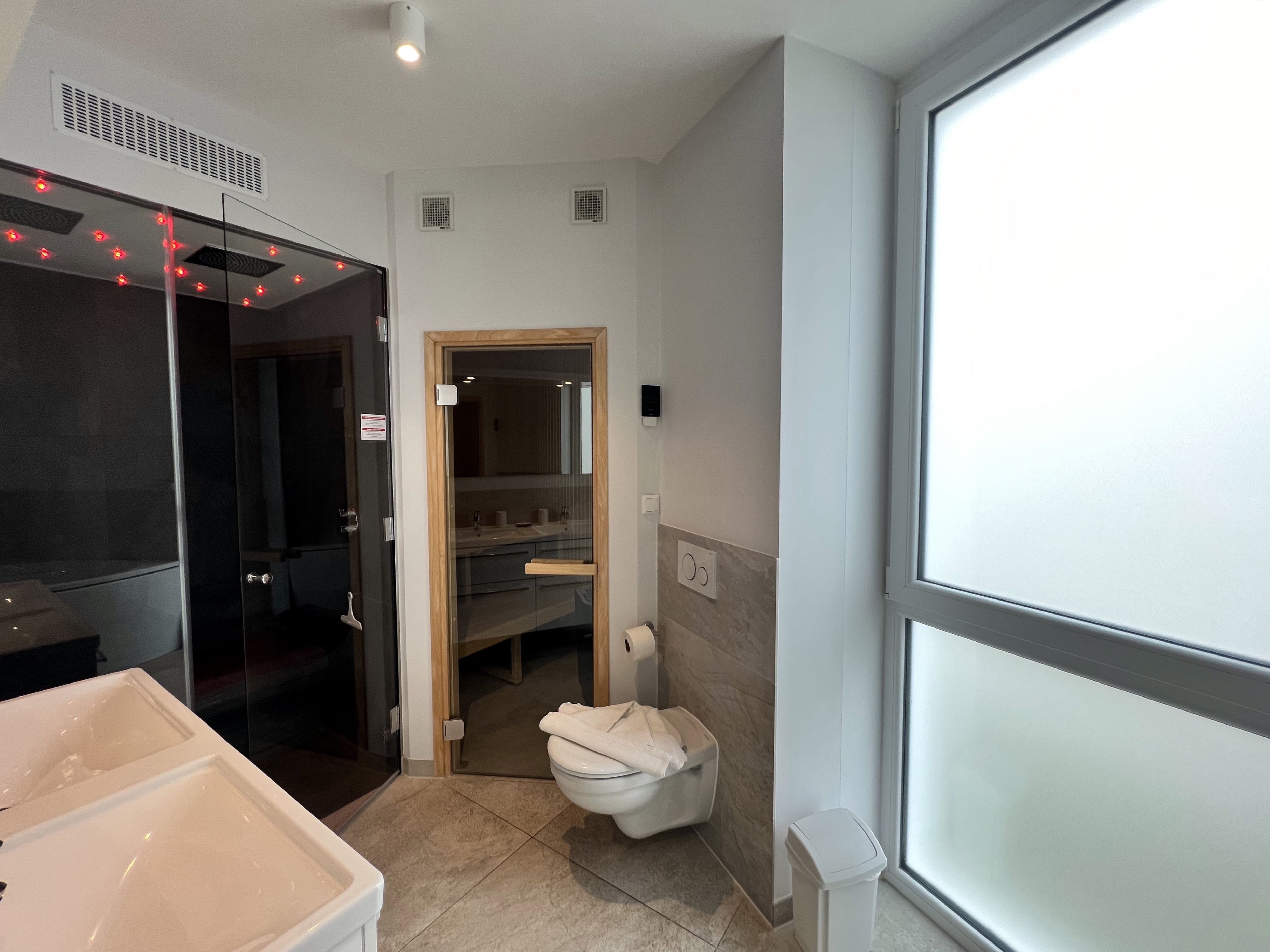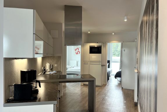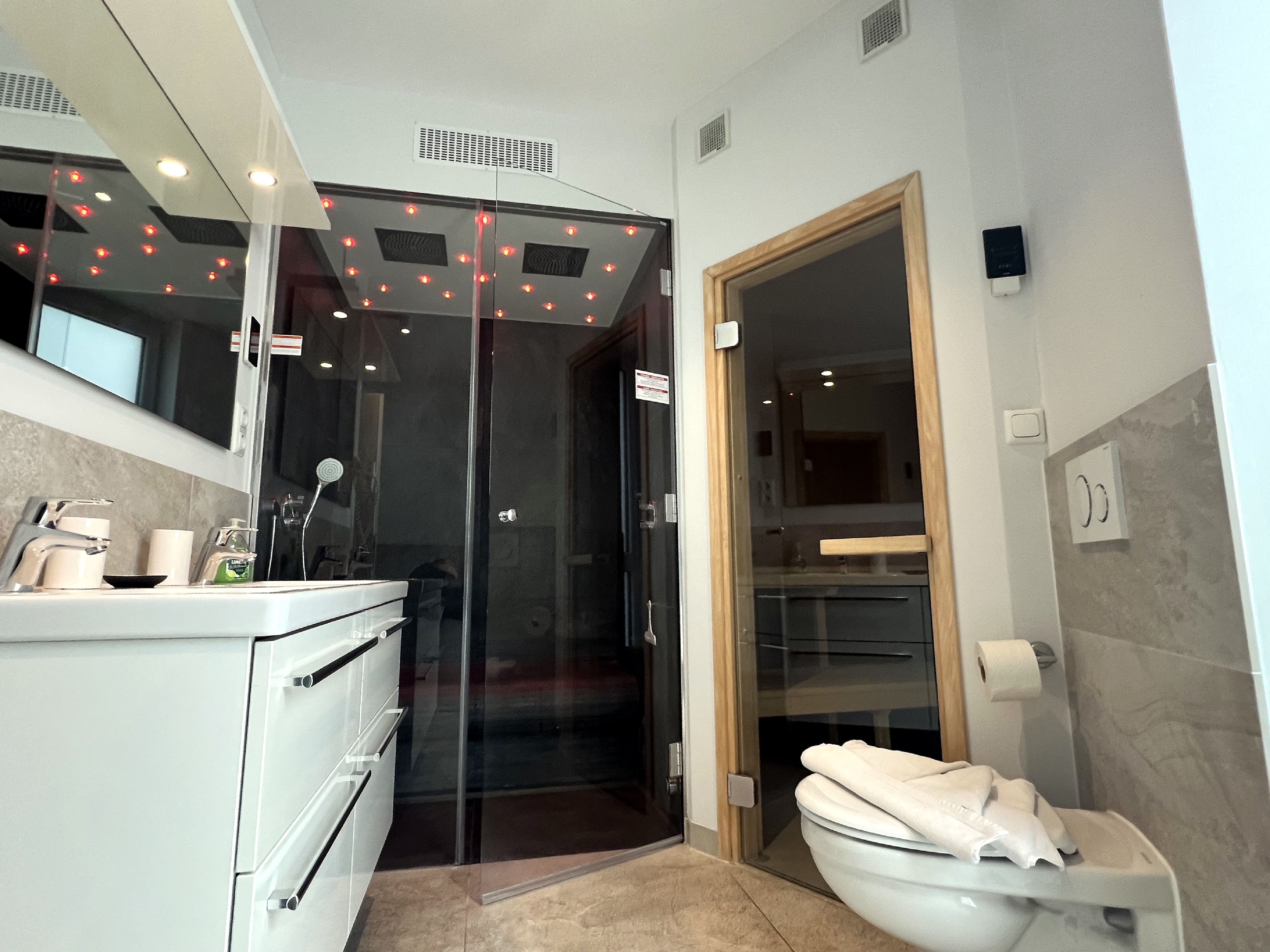 Die Wohnung ist stilvoll, hochwertig und modern eingerichtet. Ein besonderes Highlight ist ihr persönlicher Wellnessbereich mit Sauna, Whirlpool und Dampfbad mit integrierter Doppel-