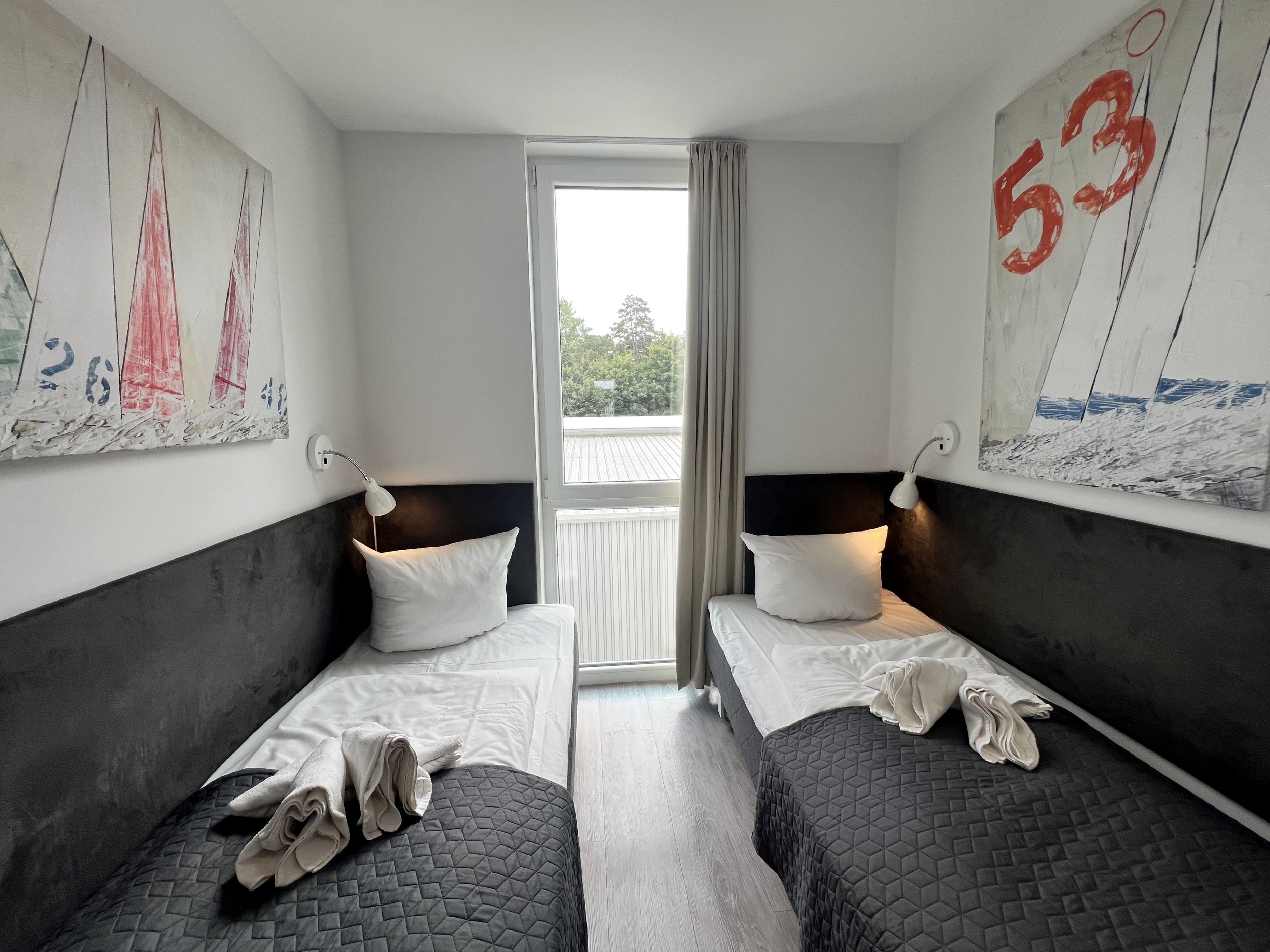 Die Wohnung verfügt über zwei komfortable Schlafzimmer – eines mit gemütlichem Doppelbett, das andere mit zwei Einzelbetten – ideal für Paare, Familien oder Freunde.