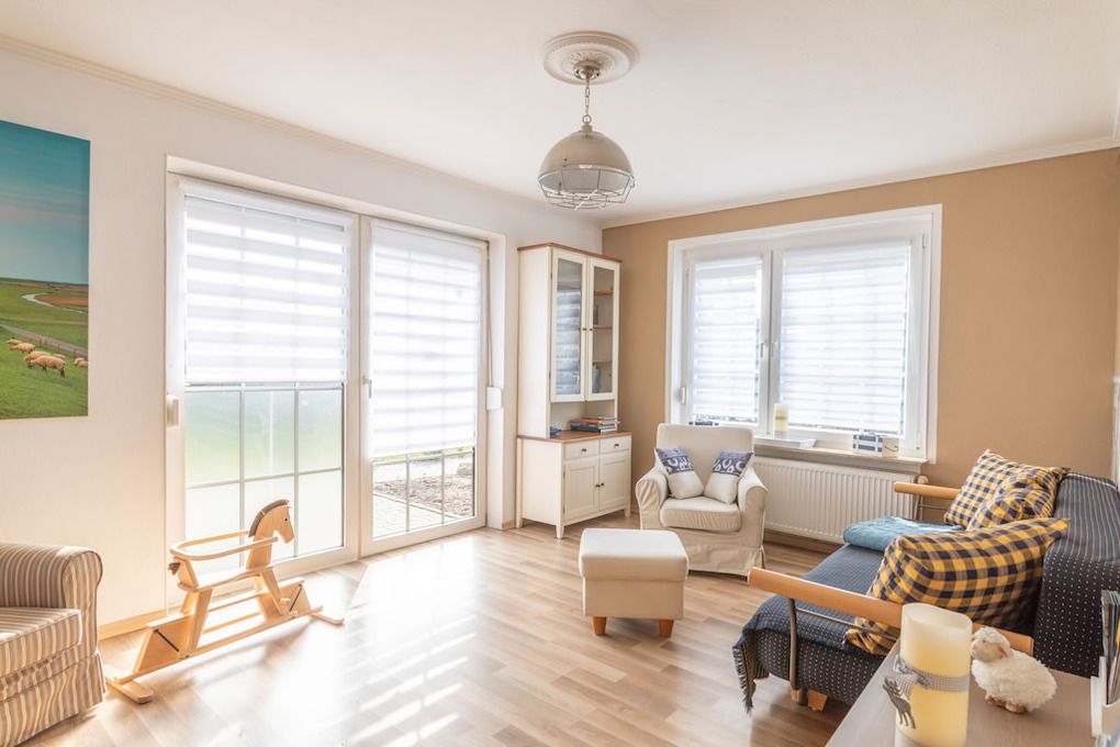 Schöne Ferienhaus-Hälfte mit eigenem Eingang, Terrasse, komplett umzäunten, ruhig gelegenem Garten hinter dem Haus und PKW-Stellplatz, im ruhigen Küstenort Dornum und nicht weit vom UNESCO Weltnaturerbe ostfriesischen Wattenmeer/Nordseeküste entfernt.