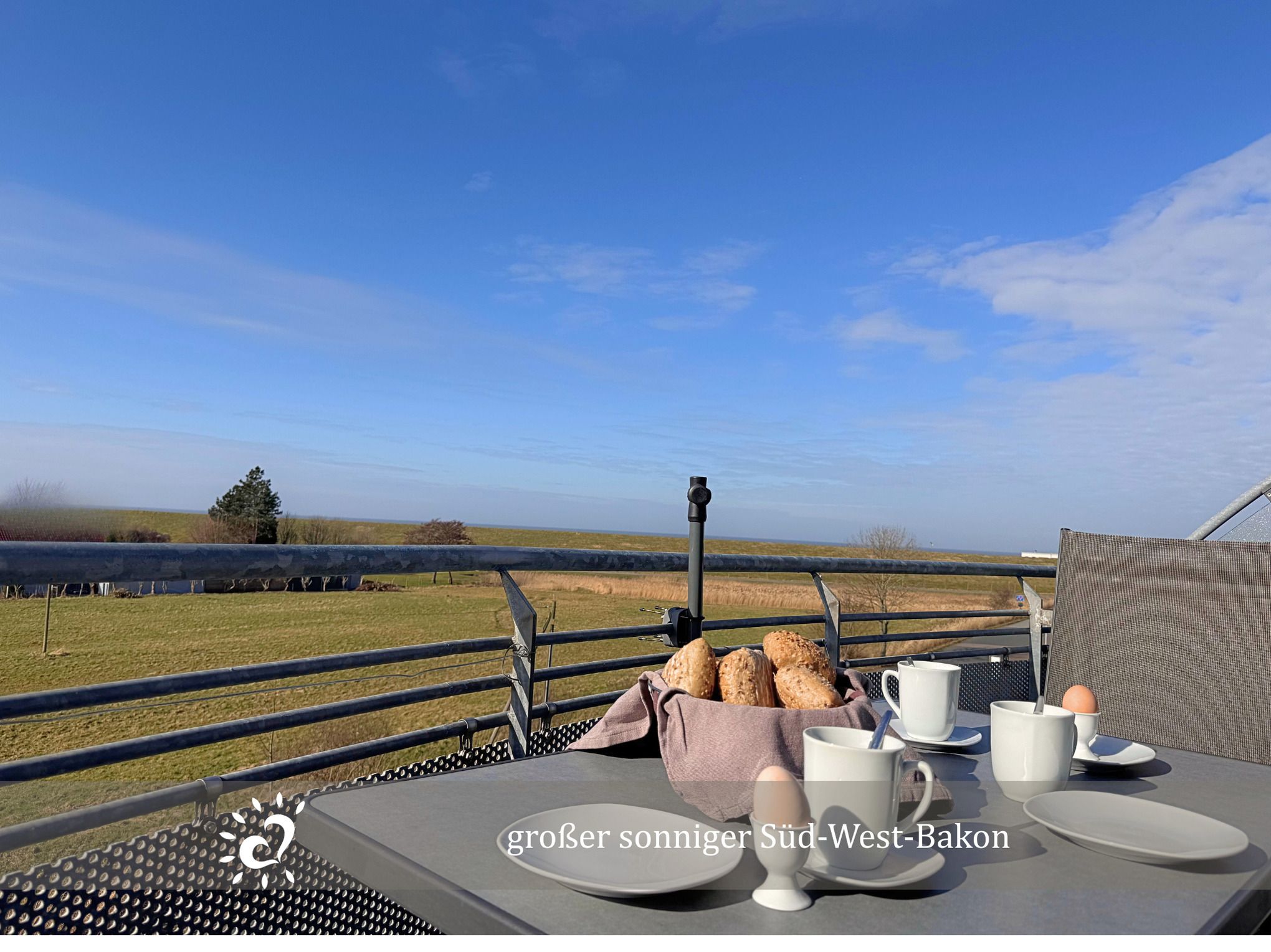 Beginne den Urlaubstag mit einem Frühstück auf dem großen Balkon. Umgeben von der gesunden und salzigen Nordseeluft mit warmen Sonnenstrahlen auf der Haut. WOW! …Dieser unverbaute Blick auf die Weite und das Wattenmeer ist einmalig.