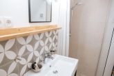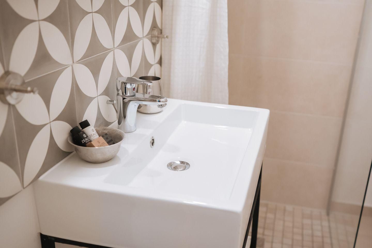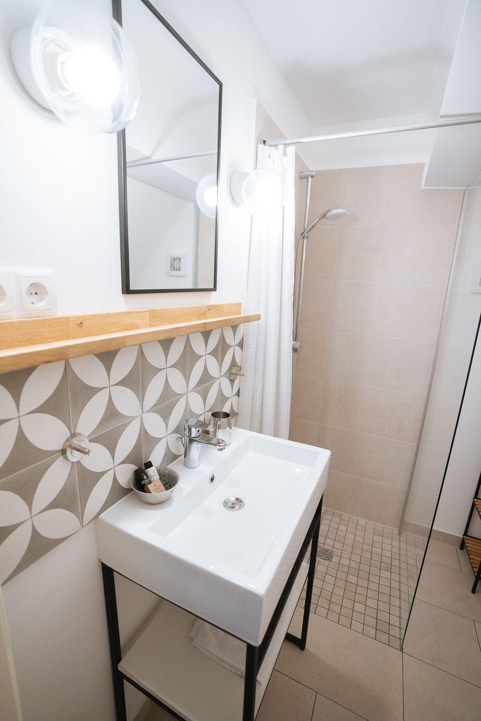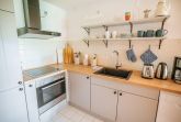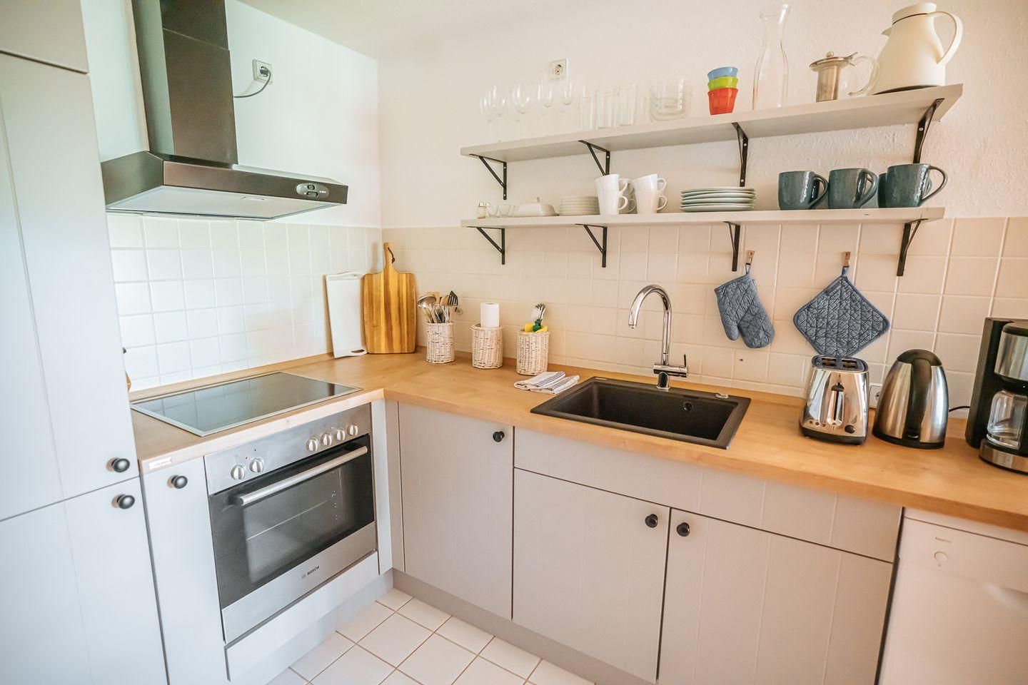 Die offene Küche zum Wohnzimmer ist funktional ausgestattet und eignet sich bestens für die Selbstversorgung: Ceranherd, Backofen, Kühlschrank mit Gefrierfach, Spülmaschine, Kaffeemaschine, Wasserkocher, Toaster, Mixer und umfassende Küchenutensilien runden die Ausstattung ab. Das Badezimmer bietet eine bodengleiche Dusche, WC, Waschbecken, Spiegel und Haartrockner.