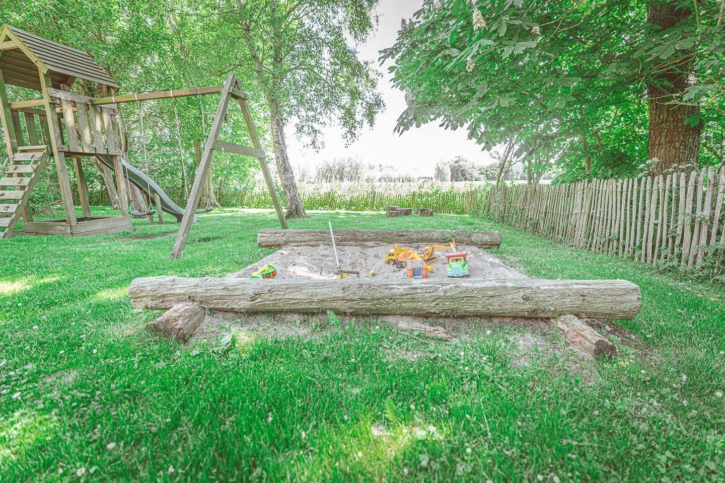 Es erwartet Sie ein Garten mit Liegewiese, Terrassen mit Gartenmöbeln, und Sonnenschirm. Zahlreiche Spielmöglichkeiten wie Schaukel, Rutsche, Sandkasten, Fußballtor, Basketballkorb, und ein Trampolin sind ebenfalls vorhanden.
