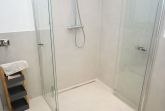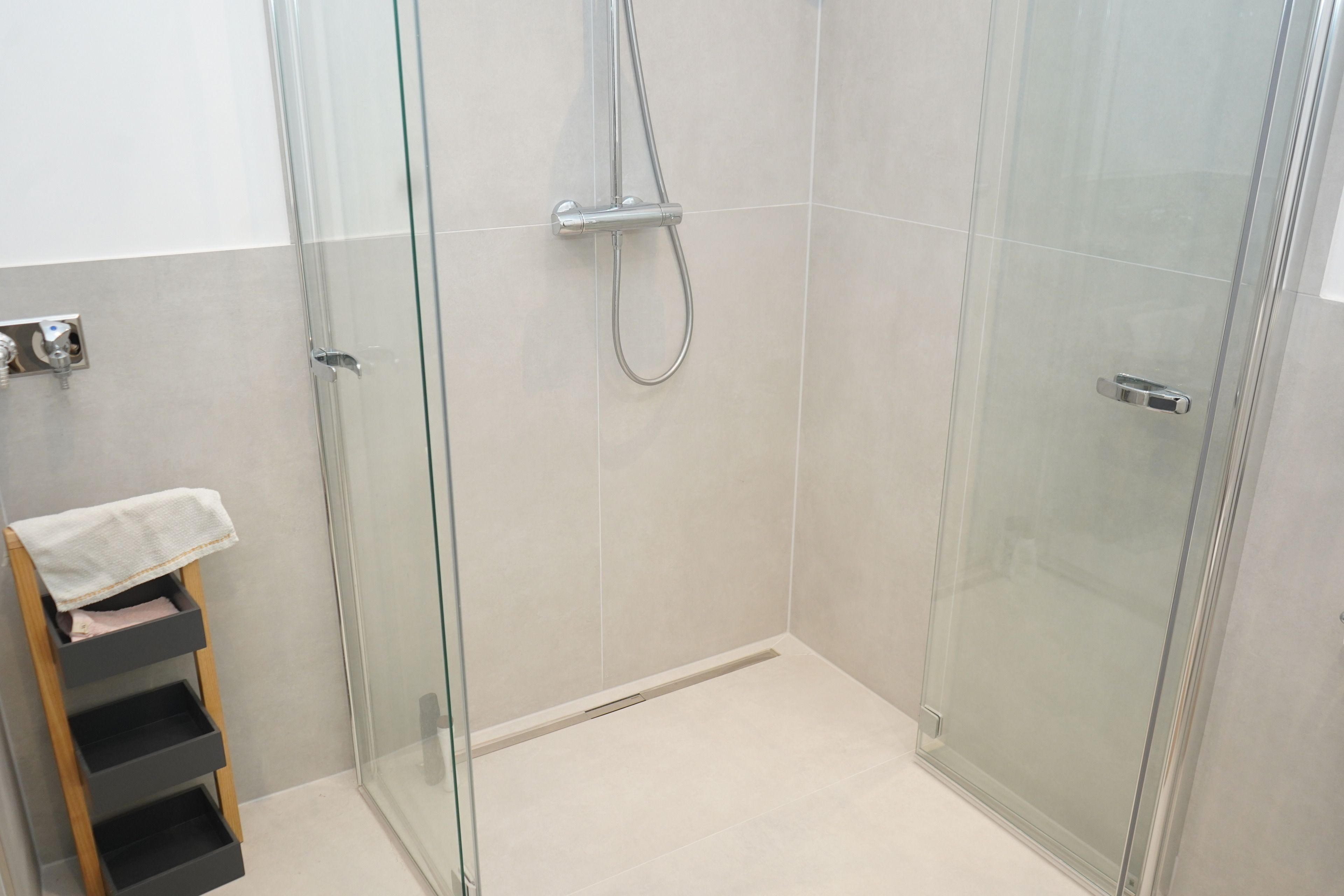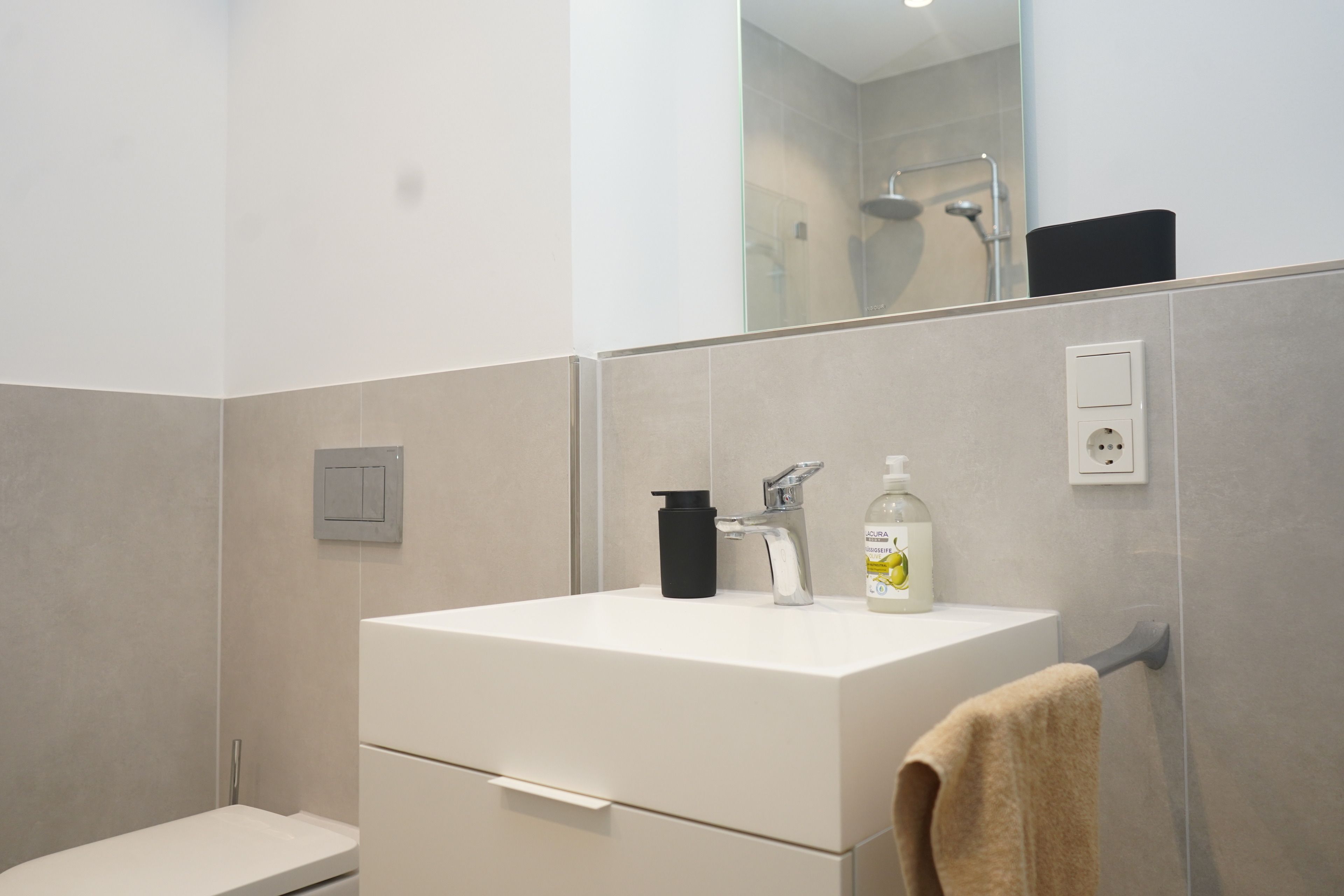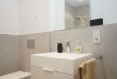 Das moderne Badezimmer mit bodengleicher Dusche und hochwertiger Ausstattung rundet den Wohnkomfort ab.