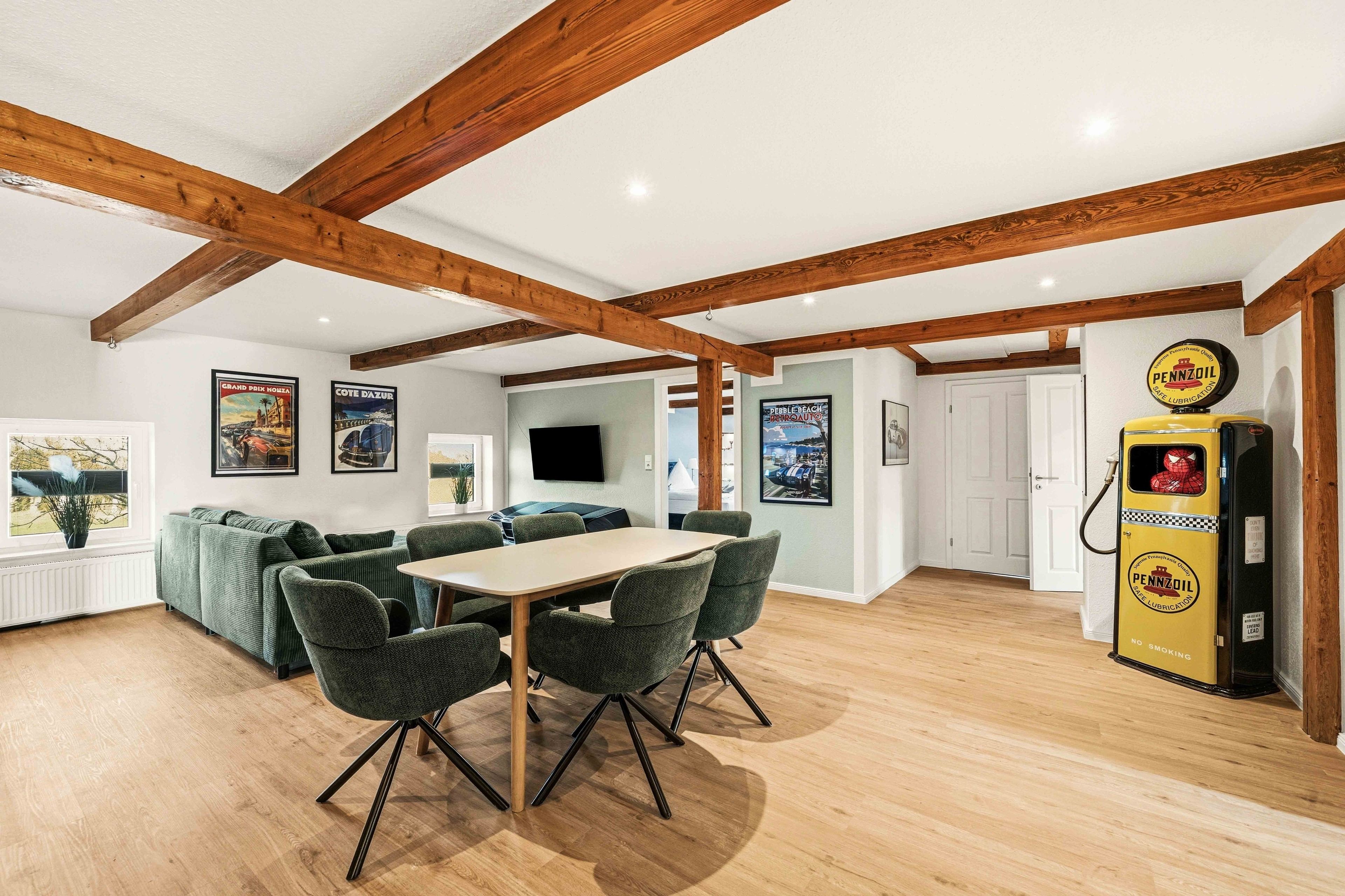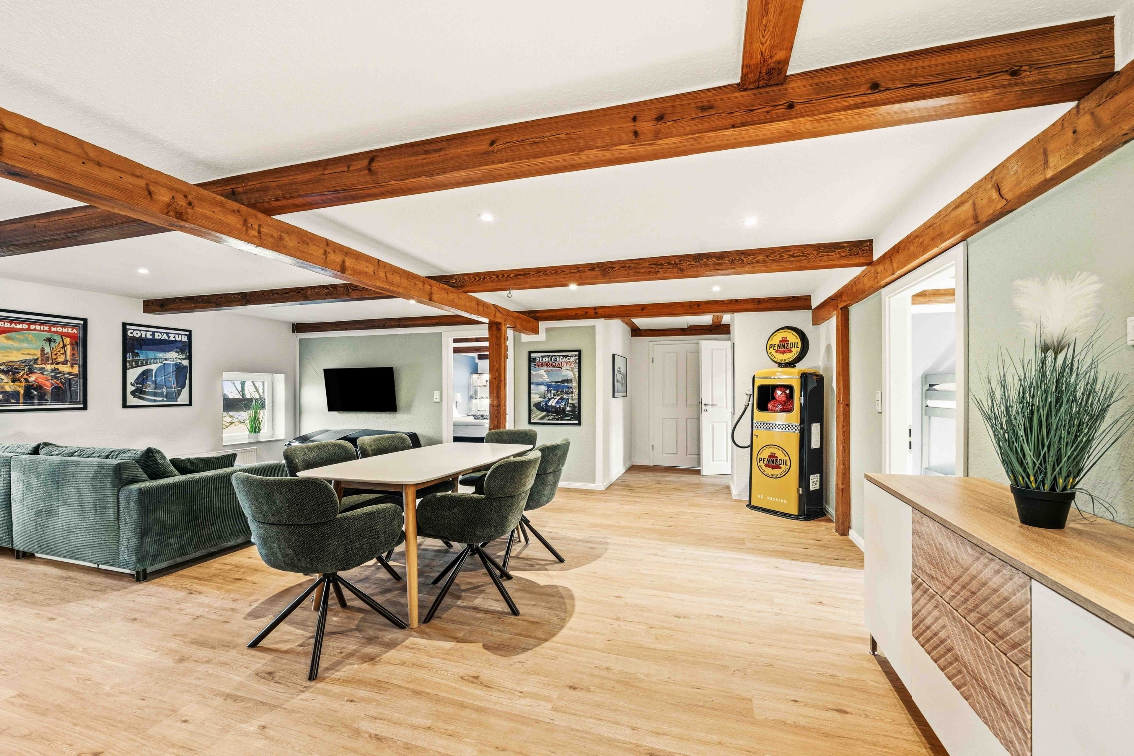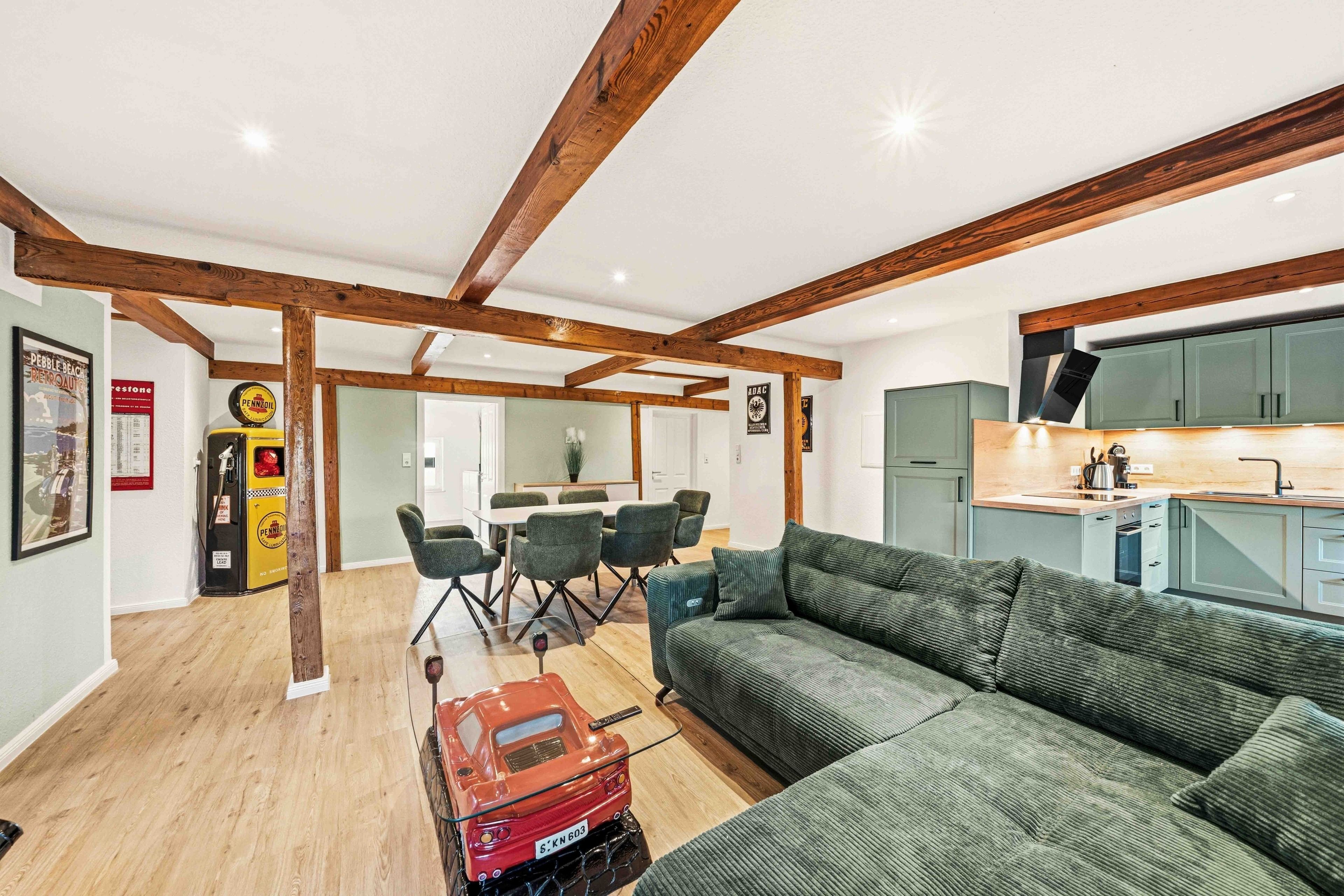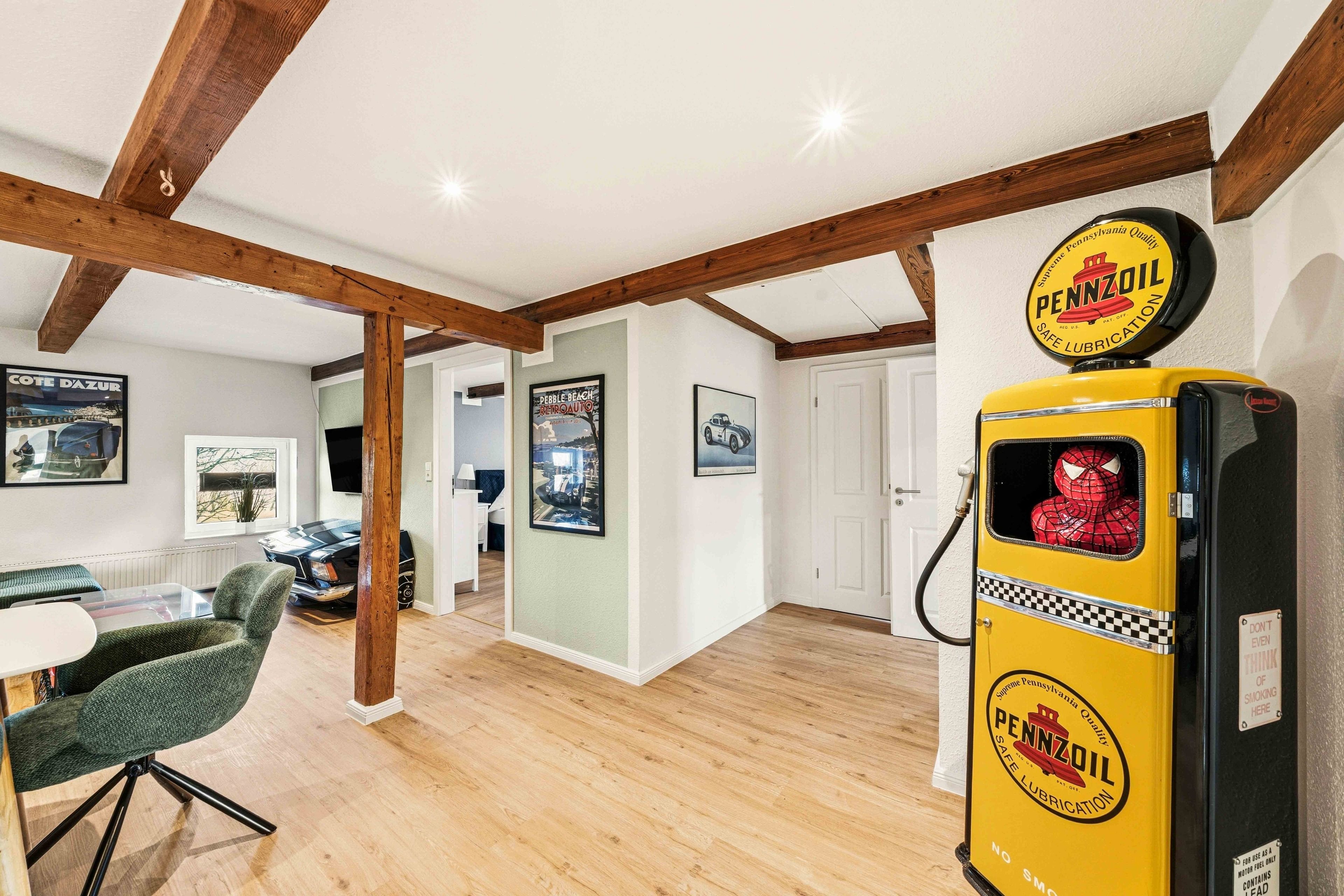 Die Ferienwohnung „Boxenstop“ in Norddeich ist weit mehr als eine gewöhnliche Unterkunft – sie ist ein liebevoll gestaltetes Erlebnis für alle, die ein besonderes Ambiente schätzen. Gelegen in der Ostermarscher Straße 29, direkt über dem Automuseum, greift die Wohnung ihre außergewöhnliche Lage thematisch auf: Die gesamte Einrichtung und Dekoration ist mit viel Liebe zum Detail im automobilen Stil gestaltet und macht den Aufenthalt zu etwas ganz Besonderem. Die im Obergeschoss gelegene Wohnung bietet auf großzügigen 100qm reichlich Platz für Familien oder Freunde. Drei Schlafzimmer sorgen für komfortable Übernachtungsmöglichkeiten: Zwei Zimmer sind mit gemütlichen Doppelbetten ausgestattet, während das dritte Schlafzimmer mit einem Hochbett besonders bei Kindern sehr beliebt ist. Das moderne Tageslichtbad überzeugt mit einer ebenerdigen Dusche, einem Doppelwaschbecken und viel Platz für einen entspannten Start in den Tag. Ein zusätzlicher Abstellraum bietet praktischen Stauraum für Gepäck und persönliche Dinge. Das Herzstück der Wohnung ist der großzügige Wohn- und Essbereich. Die sichtbaren Holzbalken verleihen dem Raum eine warme und gemütliche Atmosphäre. Hier finden Sie eine hochwertige Küchenzeile, eine komfortable Sofalandschaft zum Entspannen sowie einen großen Esstisch für gemeinsame Mahlzeiten. Auch in diesem Bereich wird das Automobil-Thema durch besondere Design-Elemente und liebevolle Details stilvoll aufgegriffen. Durch die ruhige, ländliche Lage etwas außerhalb von Norddeich ist die Ferienwohnung „Boxenstop“ der ideale Ort, um nach einem erlebnisreichen Tag zur Ruhe zu kommen – komfortabel, stilvoll und mit einem außergewöhnlichen, thematischen Konzept.