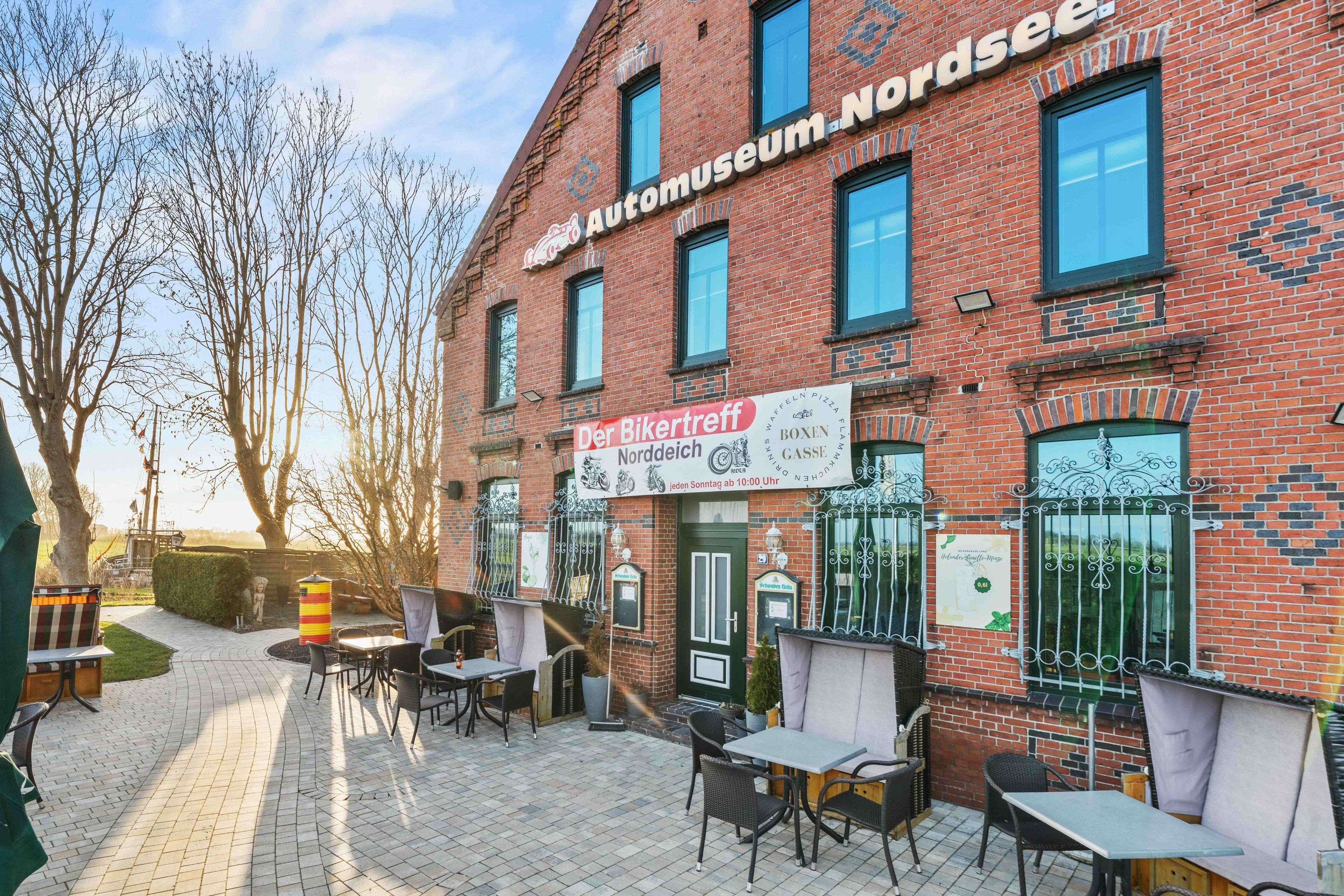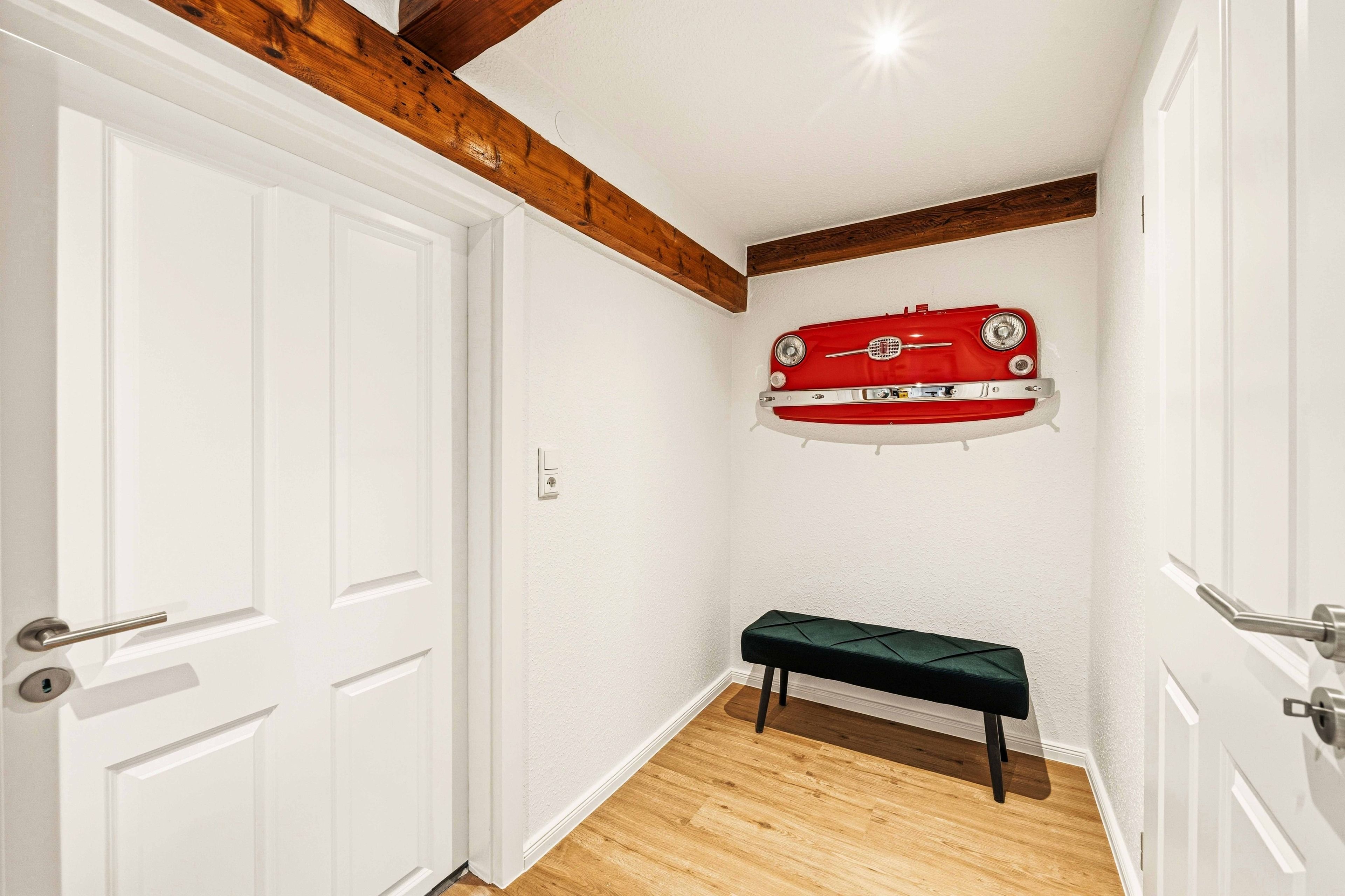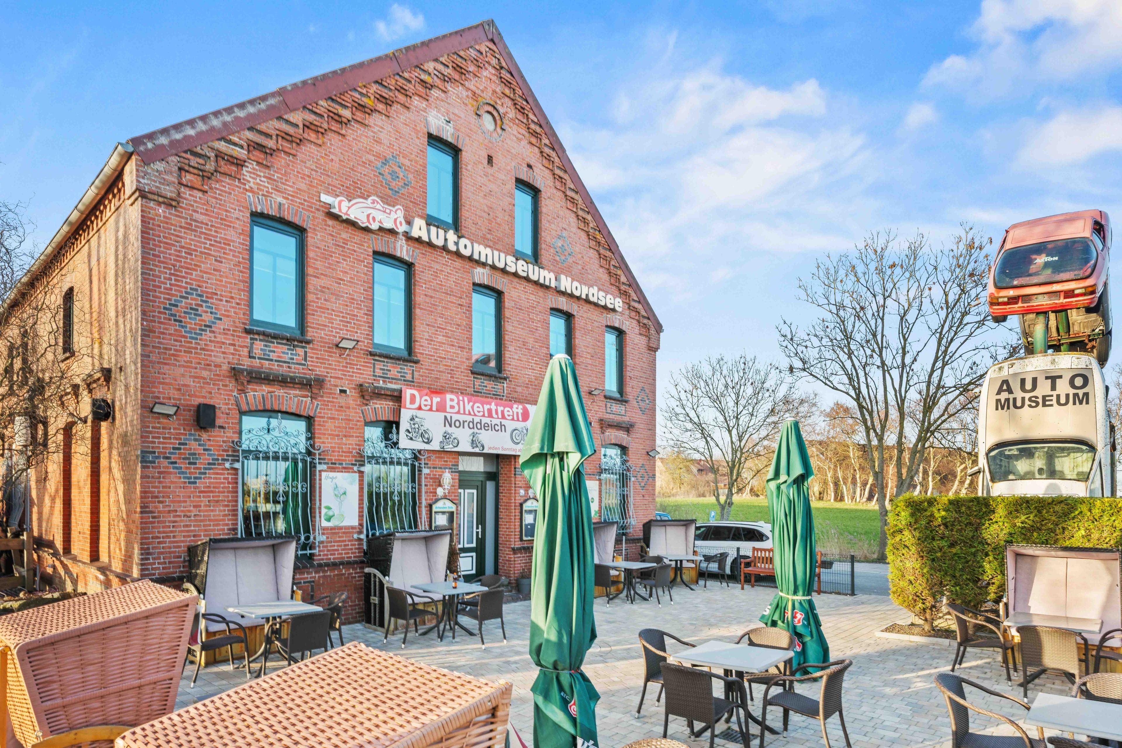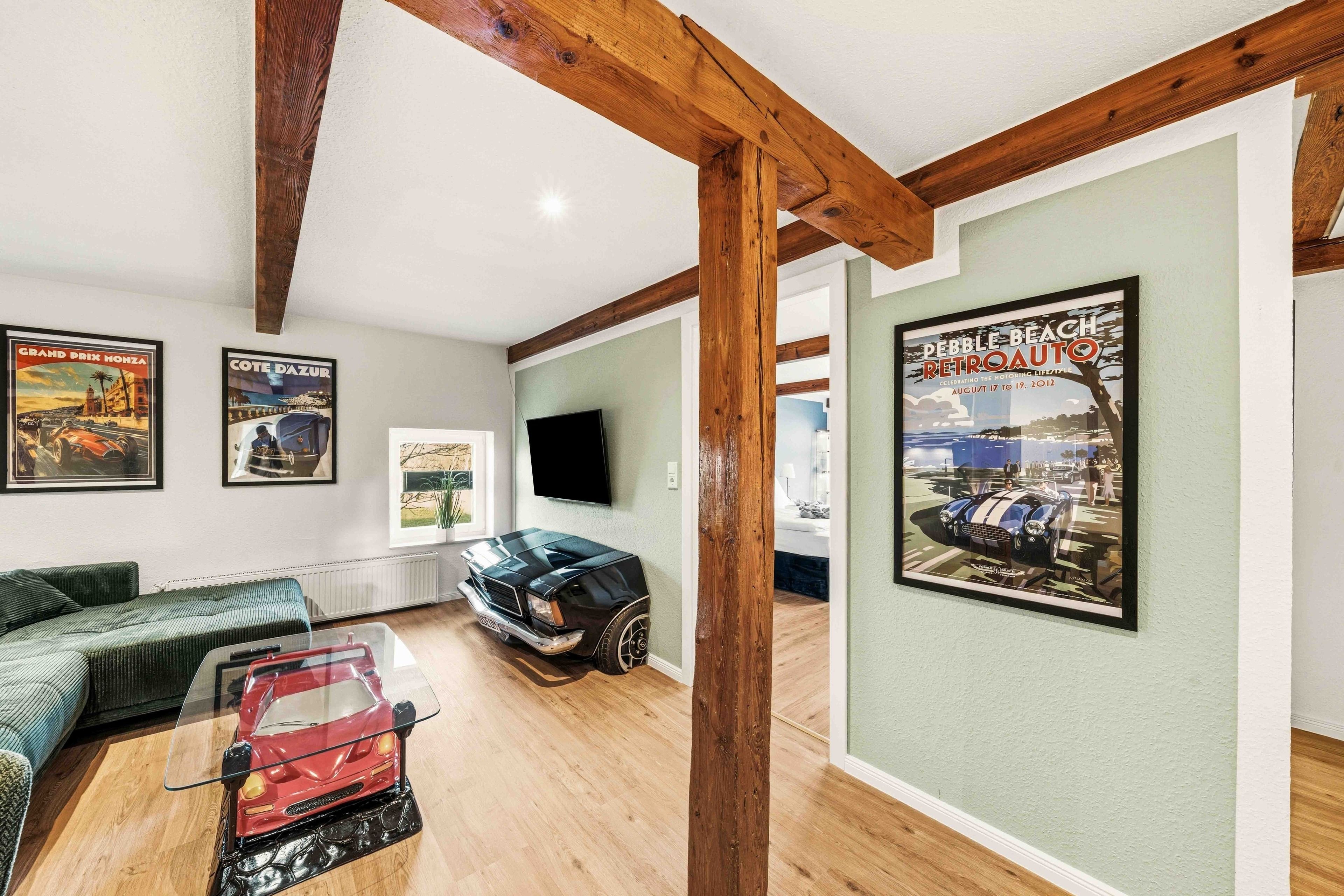 Die Ferienwohnung „Boxenstop“ in Norddeich ist weit mehr als eine gewöhnliche Unterkunft – sie ist ein liebevoll gestaltetes Erlebnis für alle, die ein besonderes Ambiente schätzen. Gelegen in der Ostermarscher Straße 29, direkt über dem Automuseum, greift die Wohnung ihre außergewöhnliche Lage thematisch auf: Die gesamte Einrichtung und Dekoration ist mit viel Liebe zum Detail im automobilen Stil gestaltet und macht den Aufenthalt zu etwas ganz Besonderem. Die im Obergeschoss gelegene Wohnung bietet auf großzügigen 100qm reichlich Platz für Familien oder Freunde. Drei Schlafzimmer sorgen für komfortable Übernachtungsmöglichkeiten: Zwei Zimmer sind mit gemütlichen Doppelbetten ausgestattet, während das dritte Schlafzimmer mit einem Hochbett besonders bei Kindern sehr beliebt ist. Das moderne Tageslichtbad überzeugt mit einer ebenerdigen Dusche, einem Doppelwaschbecken und viel Platz für einen entspannten Start in den Tag. Ein zusätzlicher Abstellraum bietet praktischen Stauraum für Gepäck und persönliche Dinge. Das Herzstück der Wohnung ist der großzügige Wohn- und Essbereich. Die sichtbaren Holzbalken verleihen dem Raum eine warme und gemütliche Atmosphäre. Hier finden Sie eine hochwertige Küchenzeile, eine komfortable Sofalandschaft zum Entspannen sowie einen großen Esstisch für gemeinsame Mahlzeiten. Auch in diesem Bereich wird das Automobil-Thema durch besondere Design-Elemente und liebevolle Details stilvoll aufgegriffen. Durch die ruhige, ländliche Lage etwas außerhalb von Norddeich ist die Ferienwohnung „Boxenstop“ der ideale Ort, um nach einem erlebnisreichen Tag zur Ruhe zu kommen – komfortabel, stilvoll und mit einem außergewöhnlichen, thematischen Konzept.