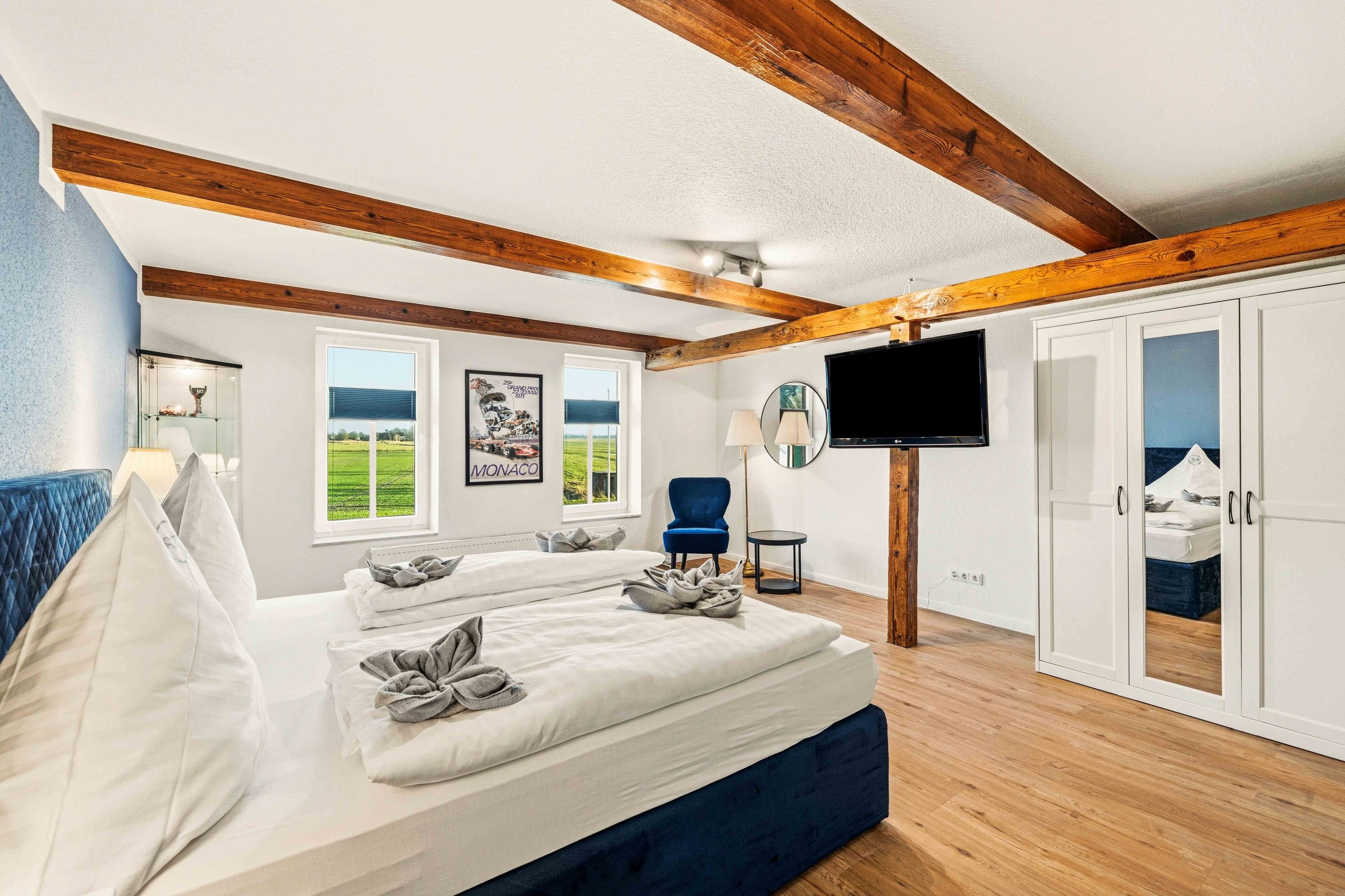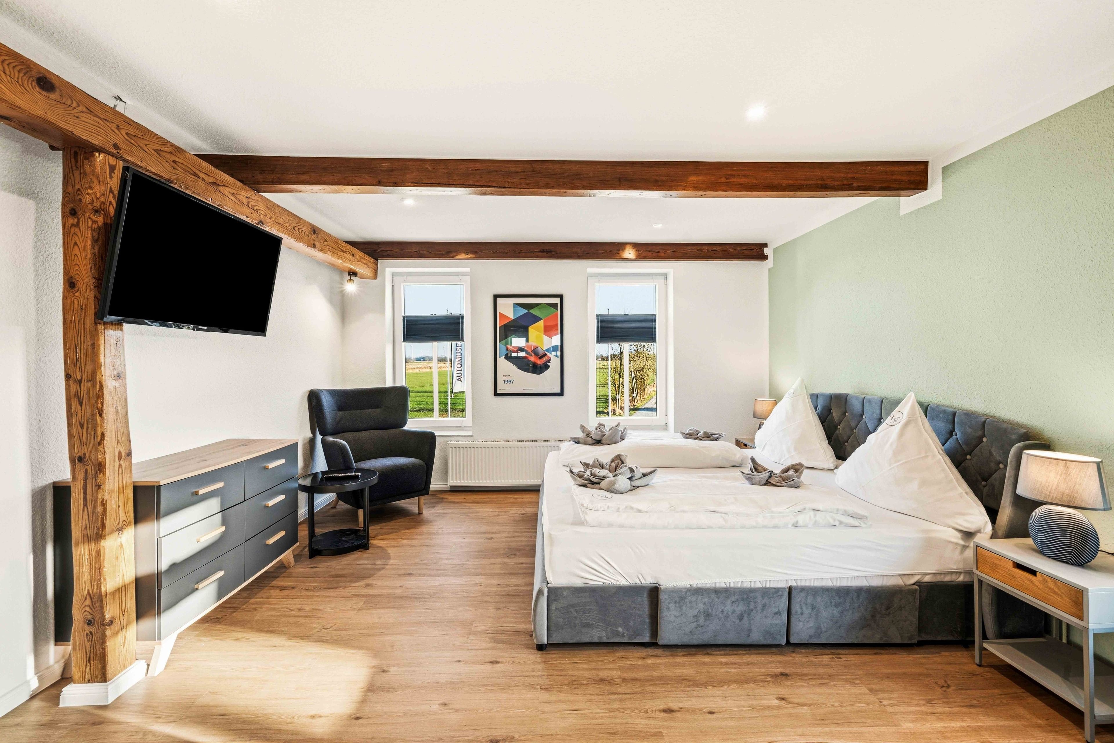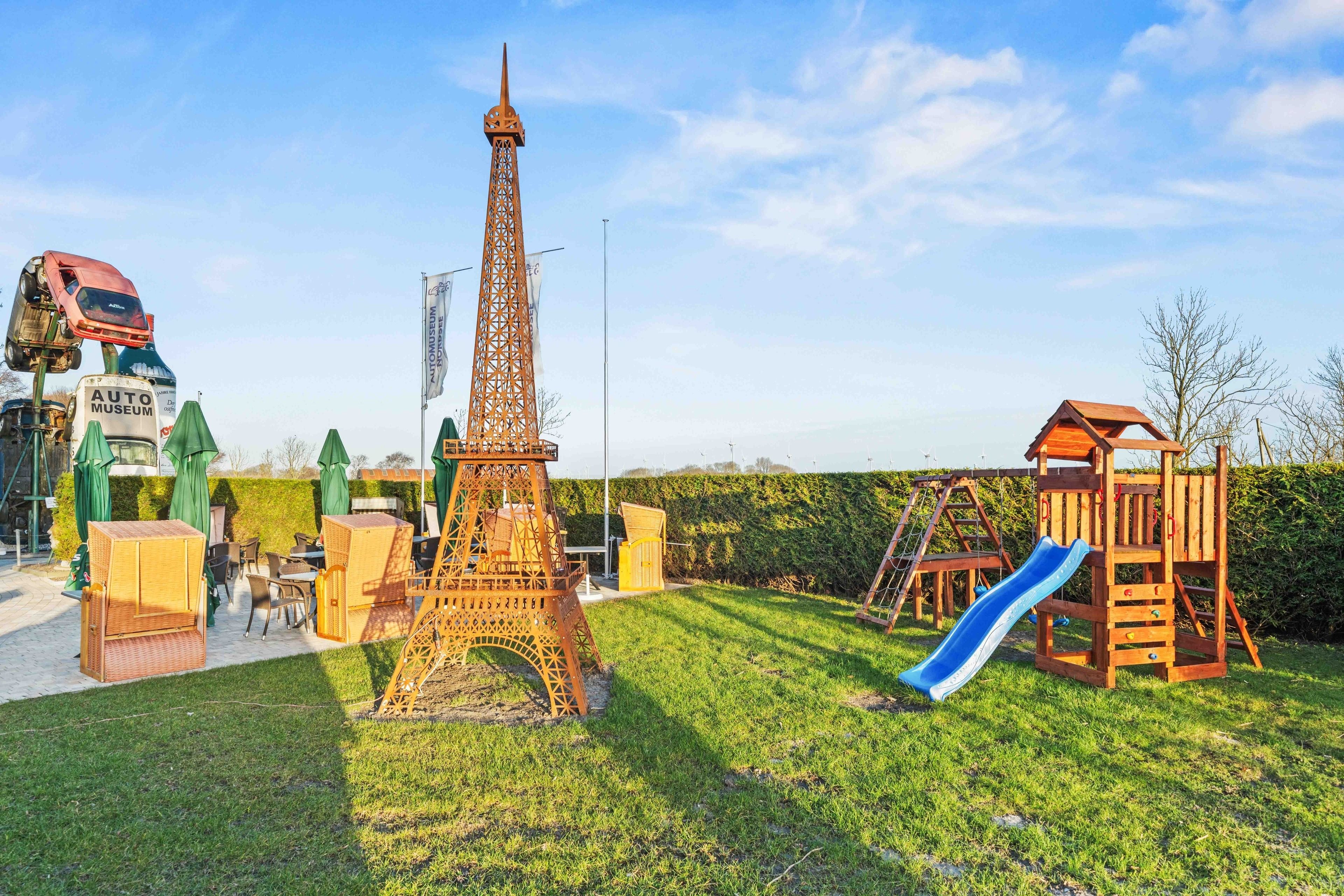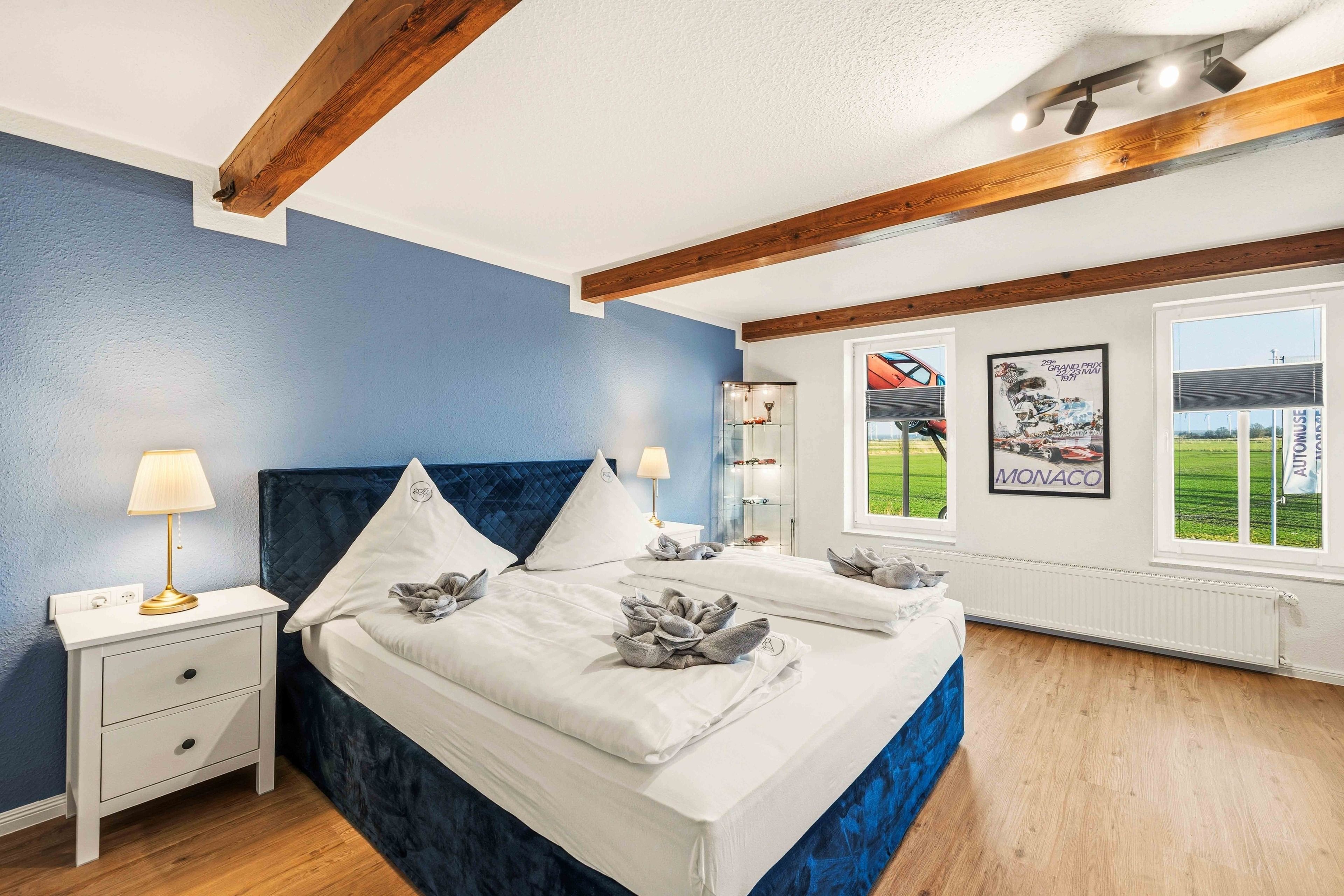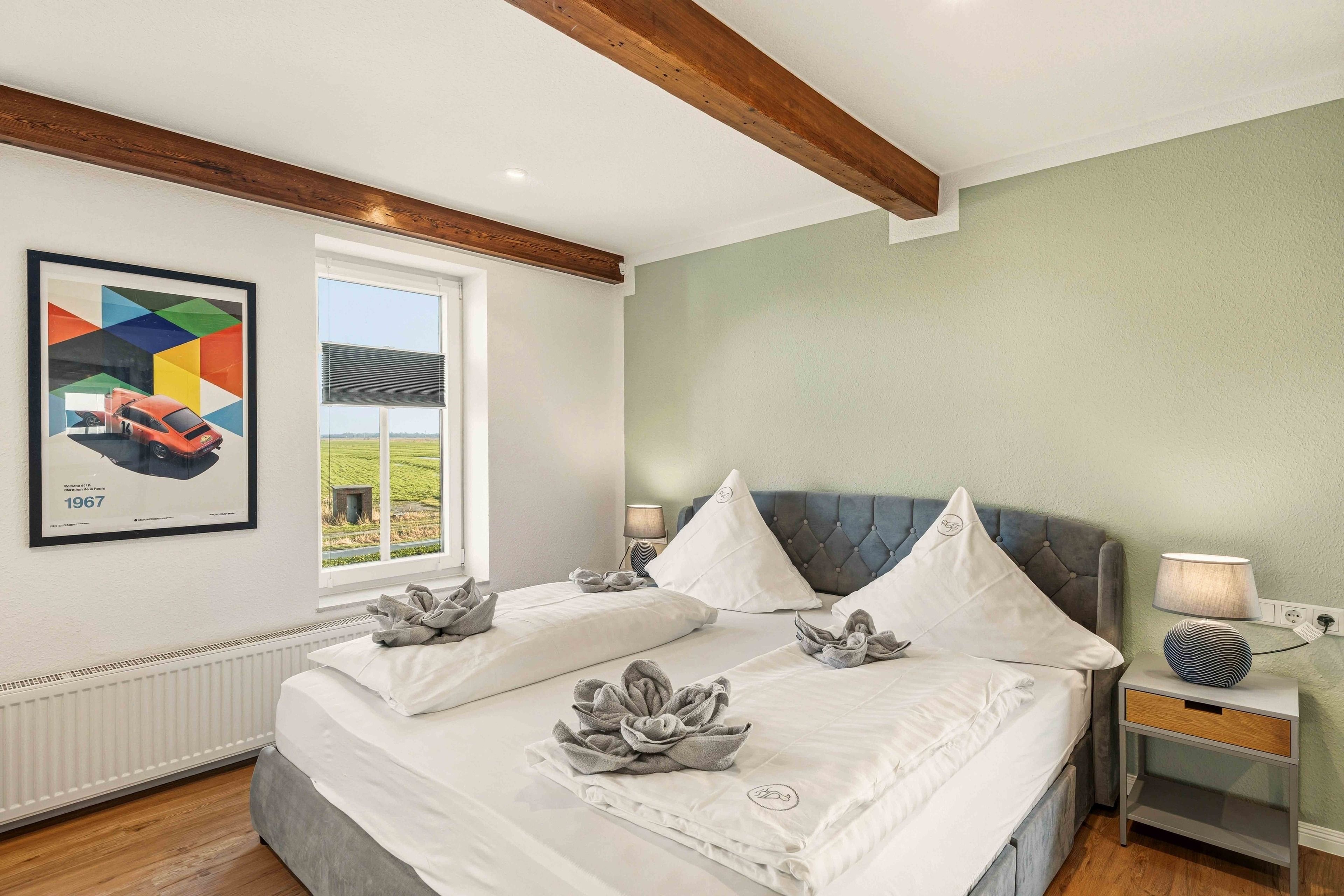 Die Ferienwohnung „Boxenstop“ in Norddeich ist weit mehr als eine gewöhnliche Unterkunft – sie ist ein liebevoll gestaltetes Erlebnis für alle, die ein besonderes Ambiente schätzen. Gelegen in der Ostermarscher Straße 29, direkt über dem Automuseum, greift die Wohnung ihre außergewöhnliche Lage thematisch auf: Die gesamte Einrichtung und Dekoration ist mit viel Liebe zum Detail im automobilen Stil gestaltet und macht den Aufenthalt zu etwas ganz Besonderem. Die im Obergeschoss gelegene Wohnung bietet auf großzügigen 100qm reichlich Platz für Familien oder Freunde. Drei Schlafzimmer sorgen für komfortable Übernachtungsmöglichkeiten: Zwei Zimmer sind mit gemütlichen Doppelbetten ausgestattet, während das dritte Schlafzimmer mit einem Hochbett besonders bei Kindern sehr beliebt ist. Das moderne Tageslichtbad überzeugt mit einer ebenerdigen Dusche, einem Doppelwaschbecken und viel Platz für einen entspannten Start in den Tag. Ein zusätzlicher Abstellraum bietet praktischen Stauraum für Gepäck und persönliche Dinge. Das Herzstück der Wohnung ist der großzügige Wohn- und Essbereich. Die sichtbaren Holzbalken verleihen dem Raum eine warme und gemütliche Atmosphäre. Hier finden Sie eine hochwertige Küchenzeile, eine komfortable Sofalandschaft zum Entspannen sowie einen großen Esstisch für gemeinsame Mahlzeiten. Auch in diesem Bereich wird das Automobil-Thema durch besondere Design-Elemente und liebevolle Details stilvoll aufgegriffen. Durch die ruhige, ländliche Lage etwas außerhalb von Norddeich ist die Ferienwohnung „Boxenstop“ der ideale Ort, um nach einem erlebnisreichen Tag zur Ruhe zu kommen – komfortabel, stilvoll und mit einem außergewöhnlichen, thematischen Konzept.