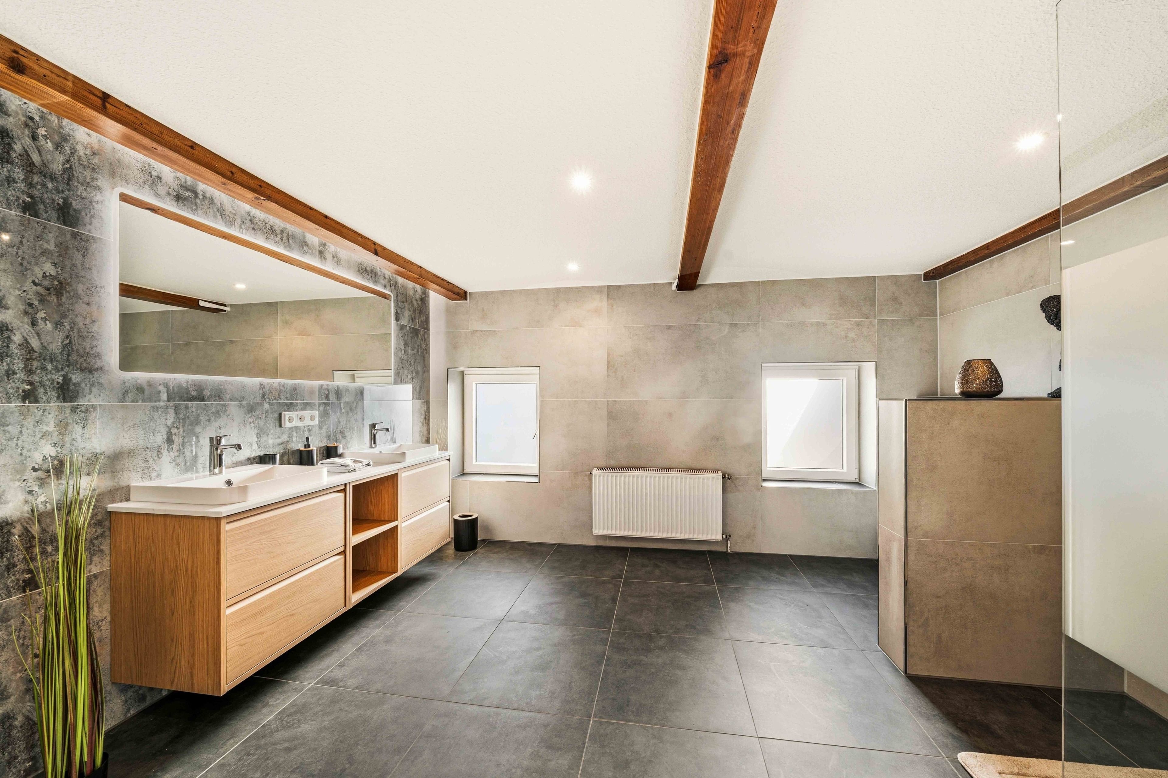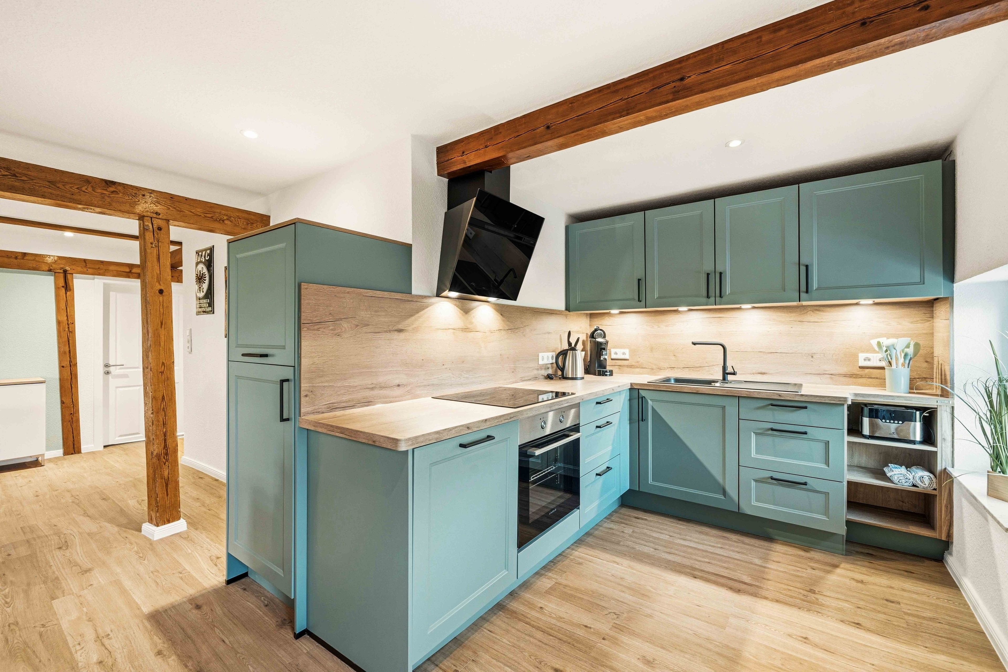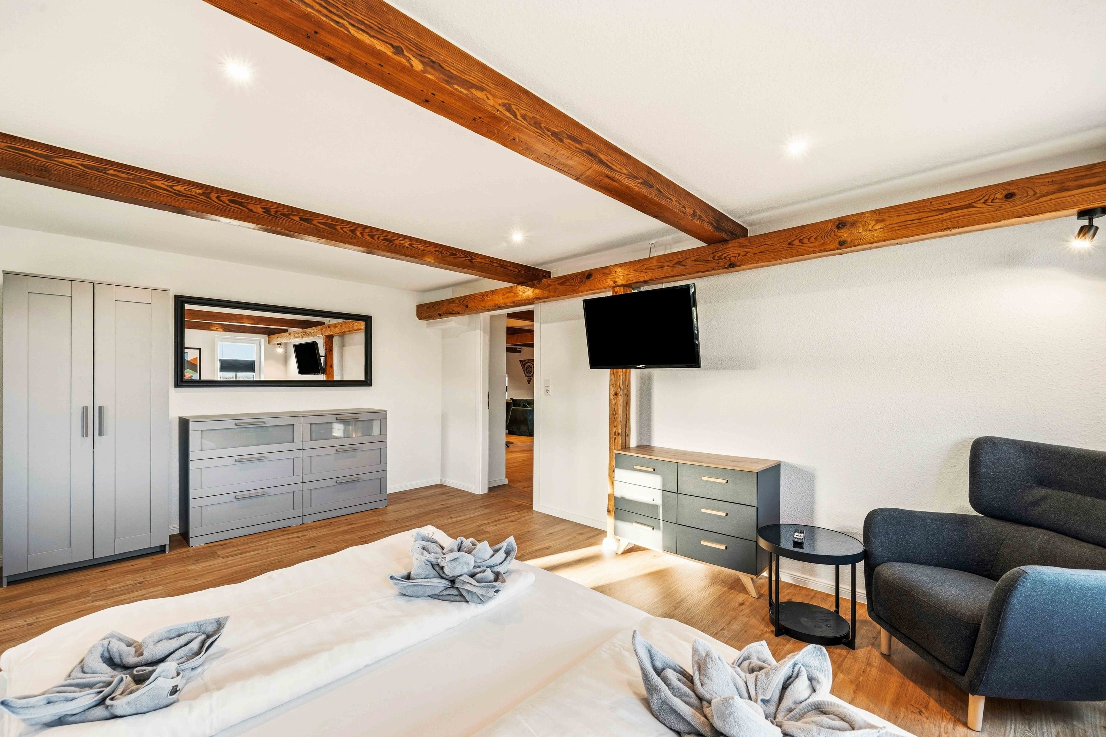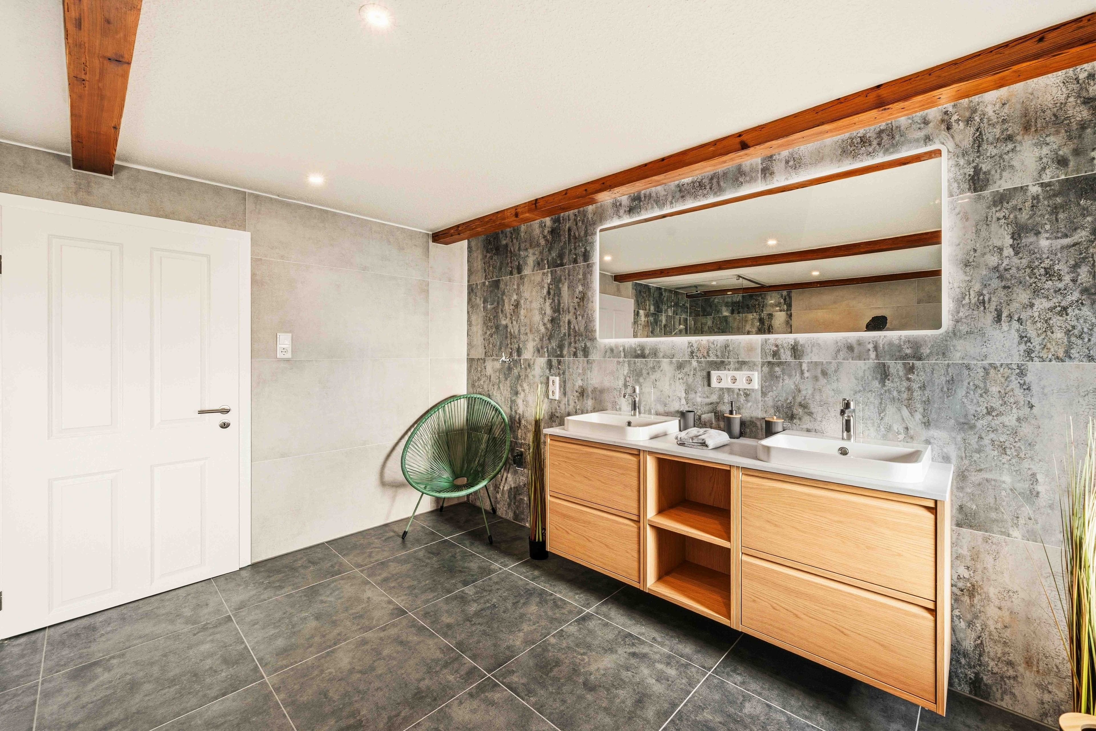 Die Ferienwohnung „Boxenstop“ in Norddeich ist weit mehr als eine gewöhnliche Unterkunft – sie ist ein liebevoll gestaltetes Erlebnis für alle, die ein besonderes Ambiente schätzen. Gelegen in der Ostermarscher Straße 29, direkt über dem Automuseum, greift die Wohnung ihre außergewöhnliche Lage thematisch auf: Die gesamte Einrichtung und Dekoration ist mit viel Liebe zum Detail im automobilen Stil gestaltet und macht den Aufenthalt zu etwas ganz Besonderem. Die im Obergeschoss gelegene Wohnung bietet auf großzügigen 100qm reichlich Platz für Familien oder Freunde. Drei Schlafzimmer sorgen für komfortable Übernachtungsmöglichkeiten: Zwei Zimmer sind mit gemütlichen Doppelbetten ausgestattet, während das dritte Schlafzimmer mit einem Hochbett besonders bei Kindern sehr beliebt ist. Das moderne Tageslichtbad überzeugt mit einer ebenerdigen Dusche, einem Doppelwaschbecken und viel Platz für einen entspannten Start in den Tag. Ein zusätzlicher Abstellraum bietet praktischen Stauraum für Gepäck und persönliche Dinge. Das Herzstück der Wohnung ist der großzügige Wohn- und Essbereich. Die sichtbaren Holzbalken verleihen dem Raum eine warme und gemütliche Atmosphäre. Hier finden Sie eine hochwertige Küchenzeile, eine komfortable Sofalandschaft zum Entspannen sowie einen großen Esstisch für gemeinsame Mahlzeiten. Auch in diesem Bereich wird das Automobil-Thema durch besondere Design-Elemente und liebevolle Details stilvoll aufgegriffen. Durch die ruhige, ländliche Lage etwas außerhalb von Norddeich ist die Ferienwohnung „Boxenstop“ der ideale Ort, um nach einem erlebnisreichen Tag zur Ruhe zu kommen – komfortabel, stilvoll und mit einem außergewöhnlichen, thematischen Konzept.