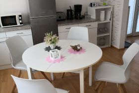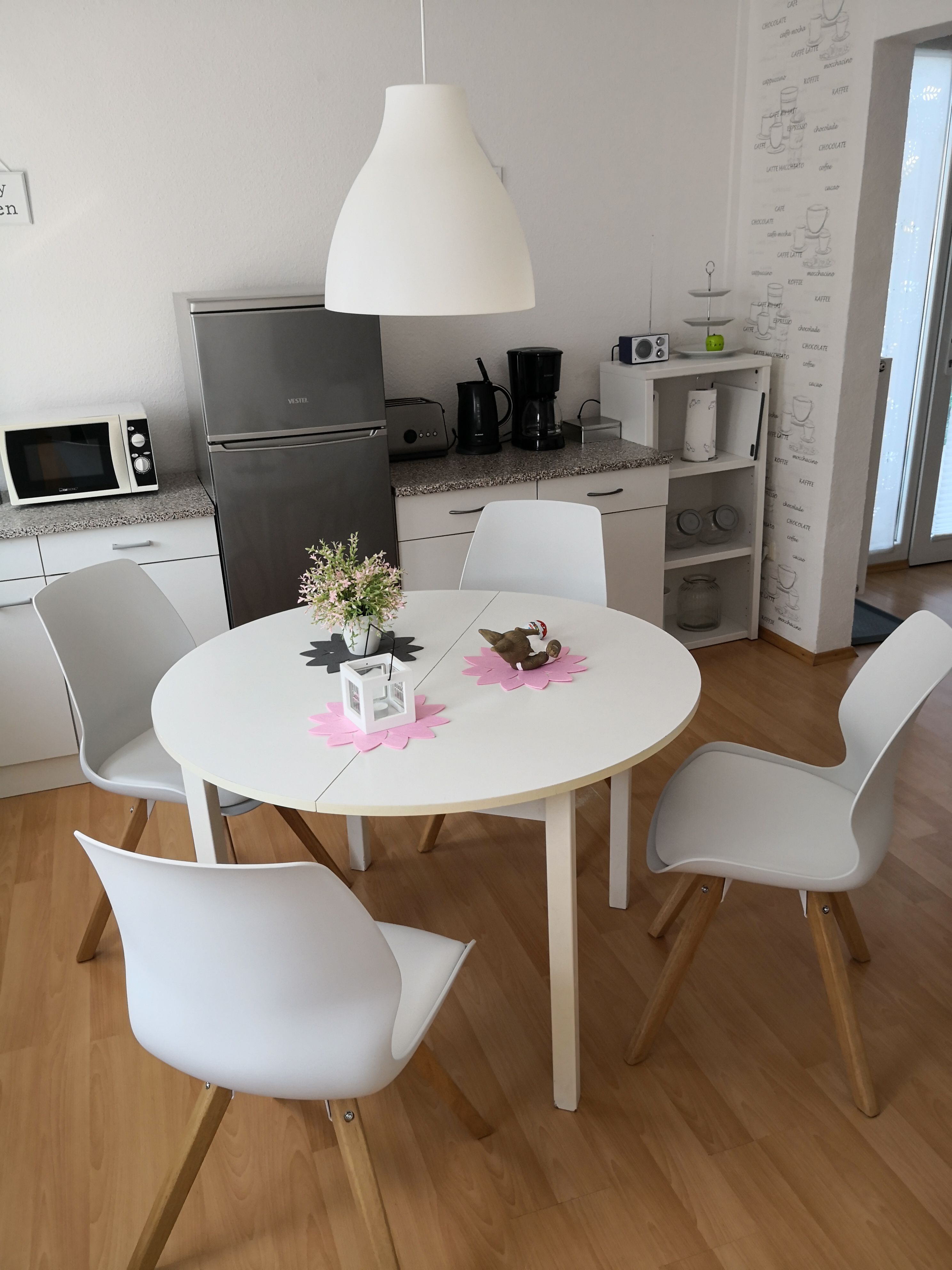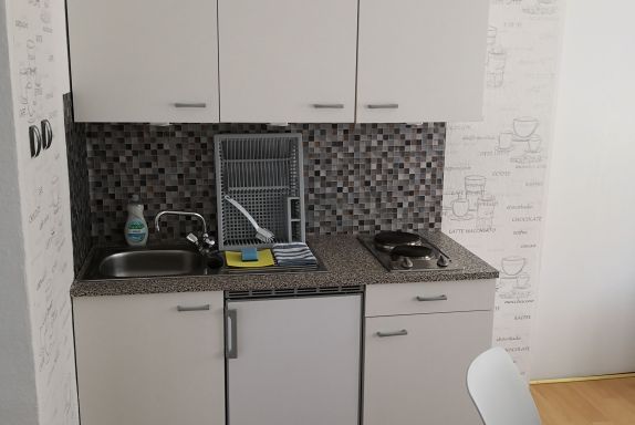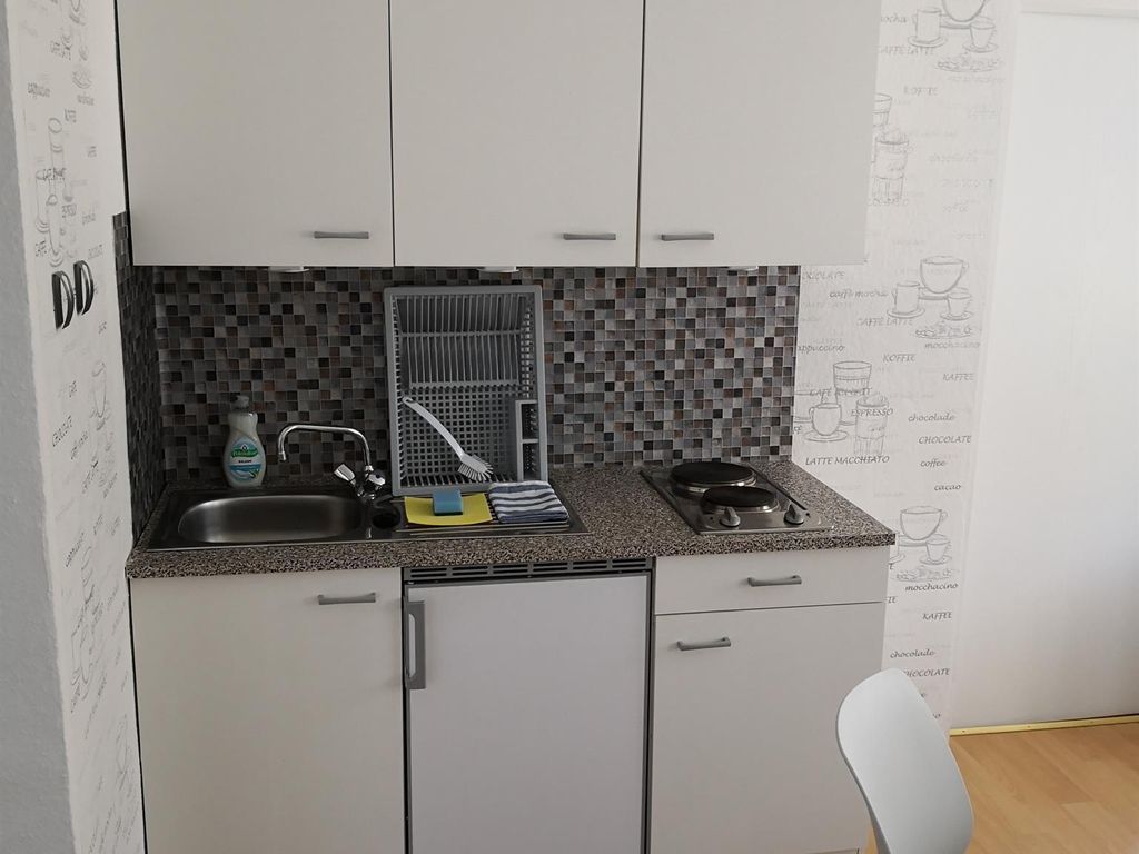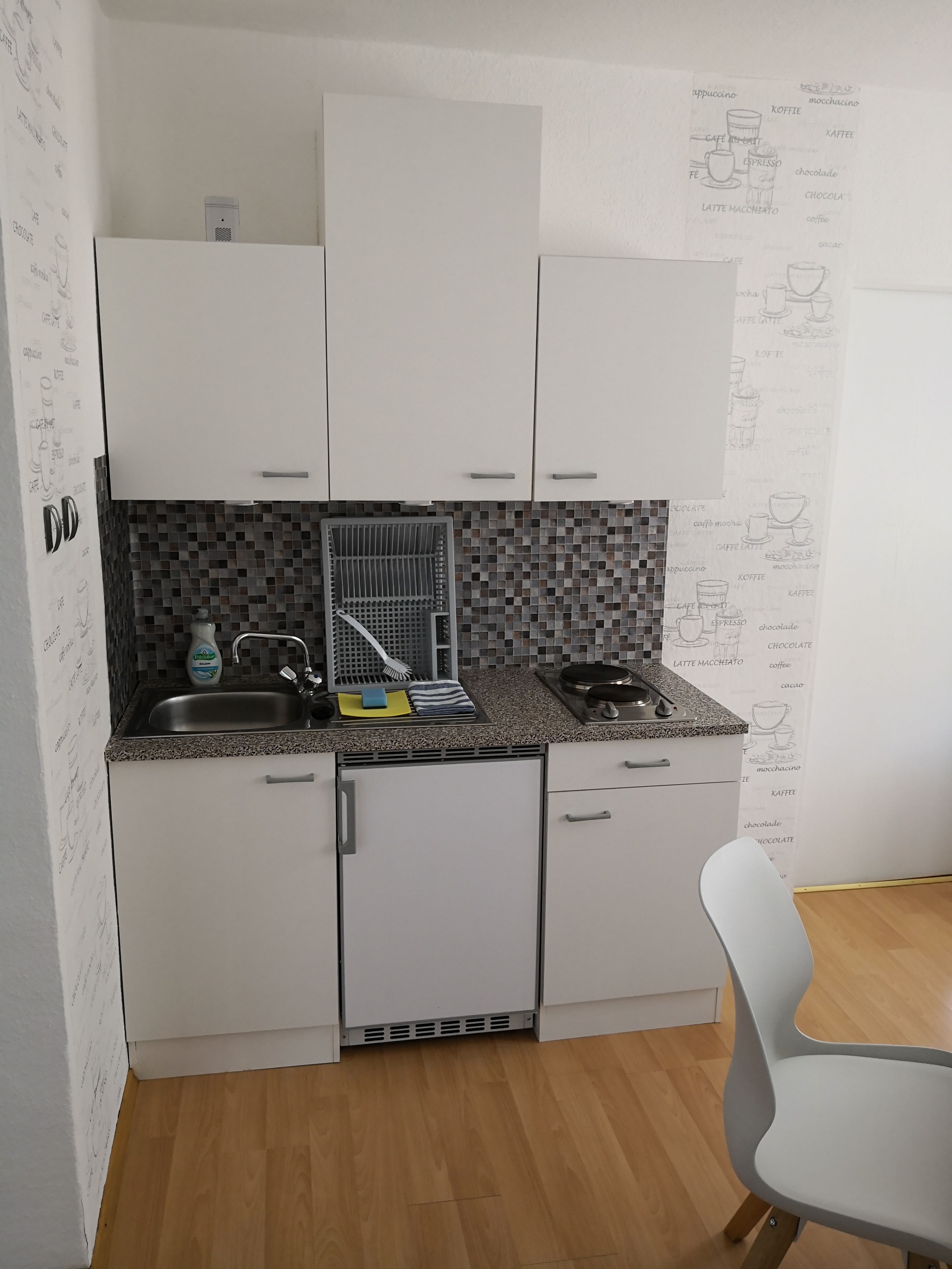 Die Ferienwohnung verfügt über eine Küche mit zwei Herdplatten, Kühlschrank, Mikrowelle, Toaster, Kaffeemaschine, Geschirr, usw.