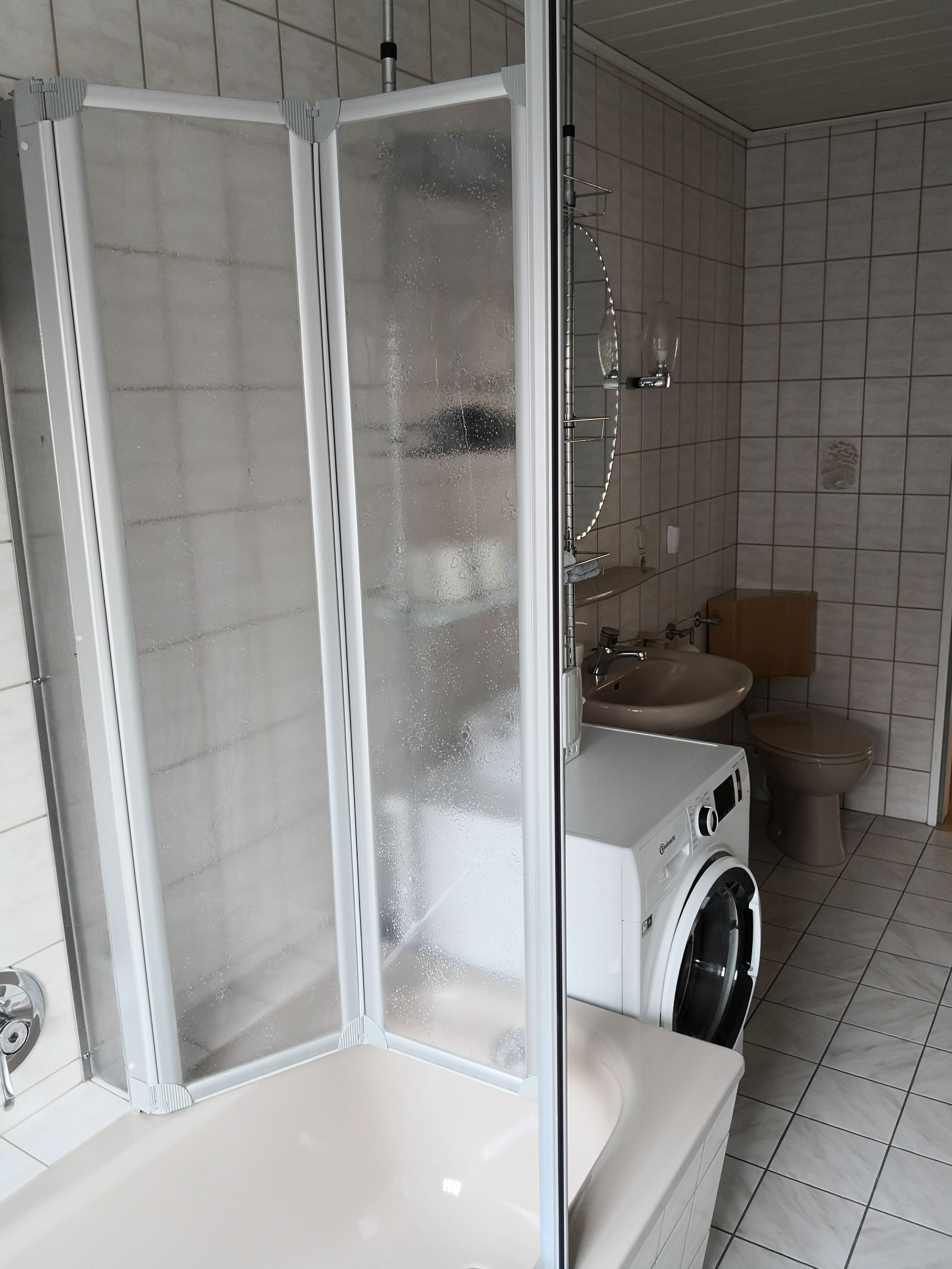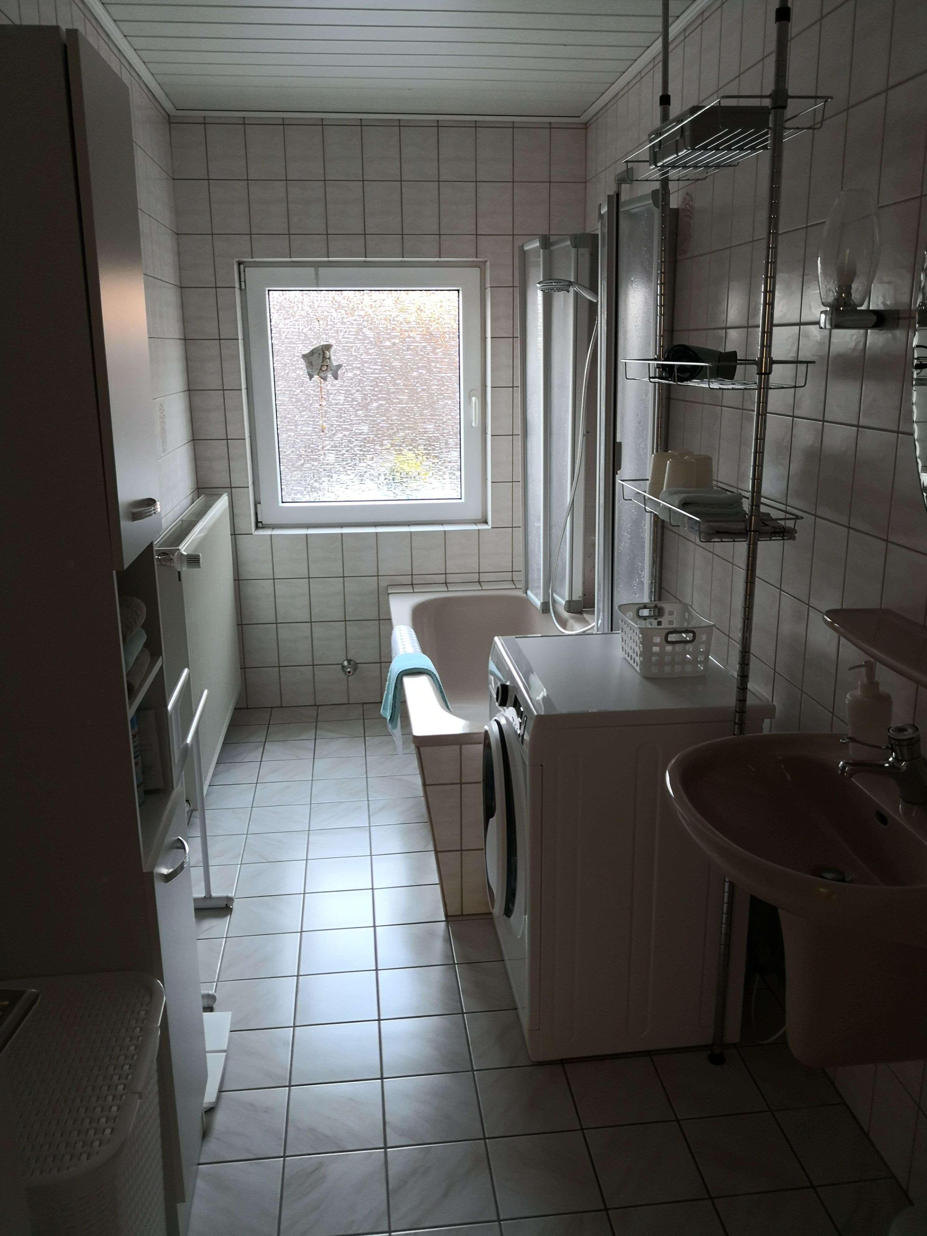 1 Badezimmer mit Badewanne incl. Dusche, WC und Wasch-/Trockner.
