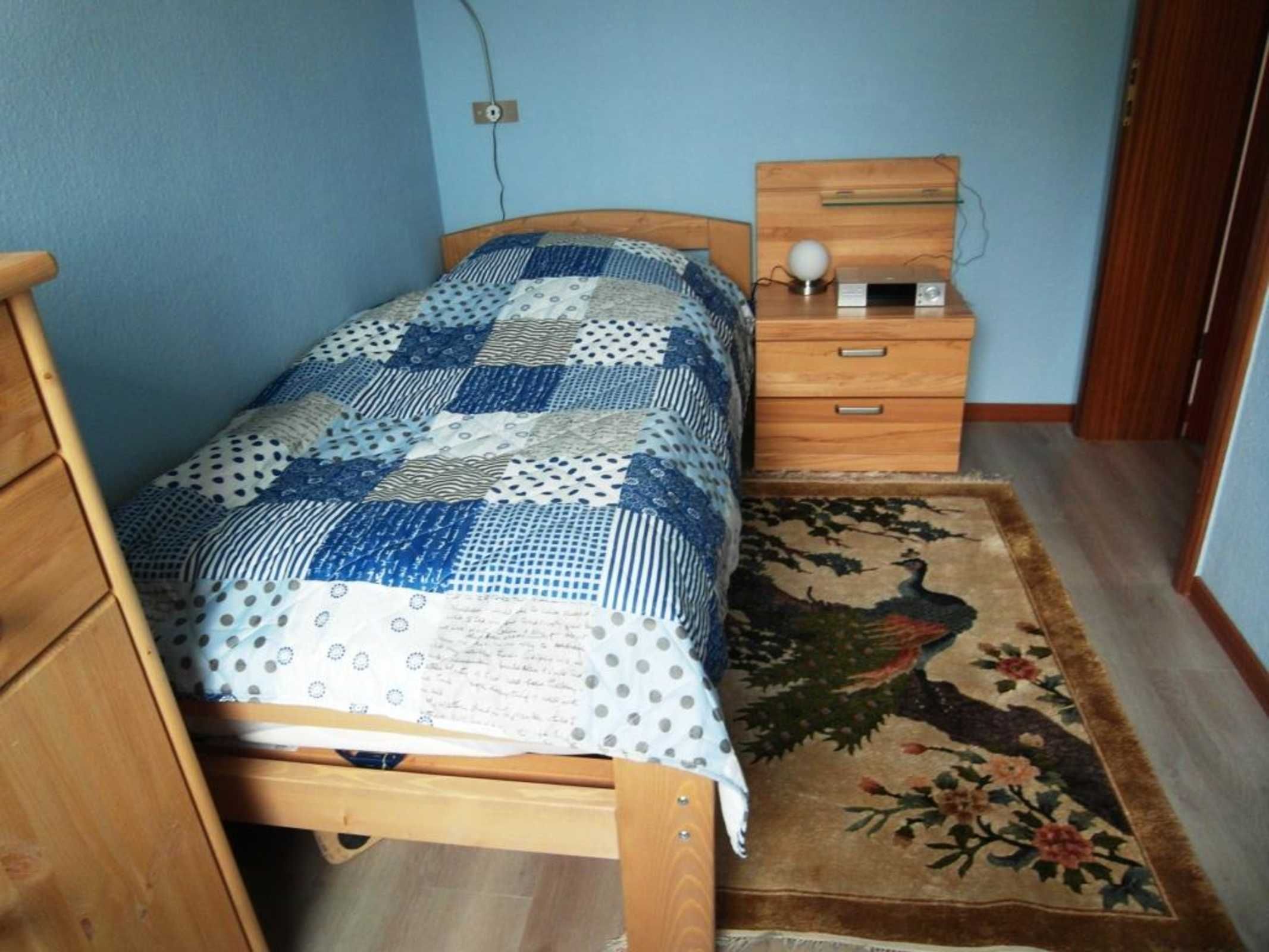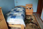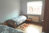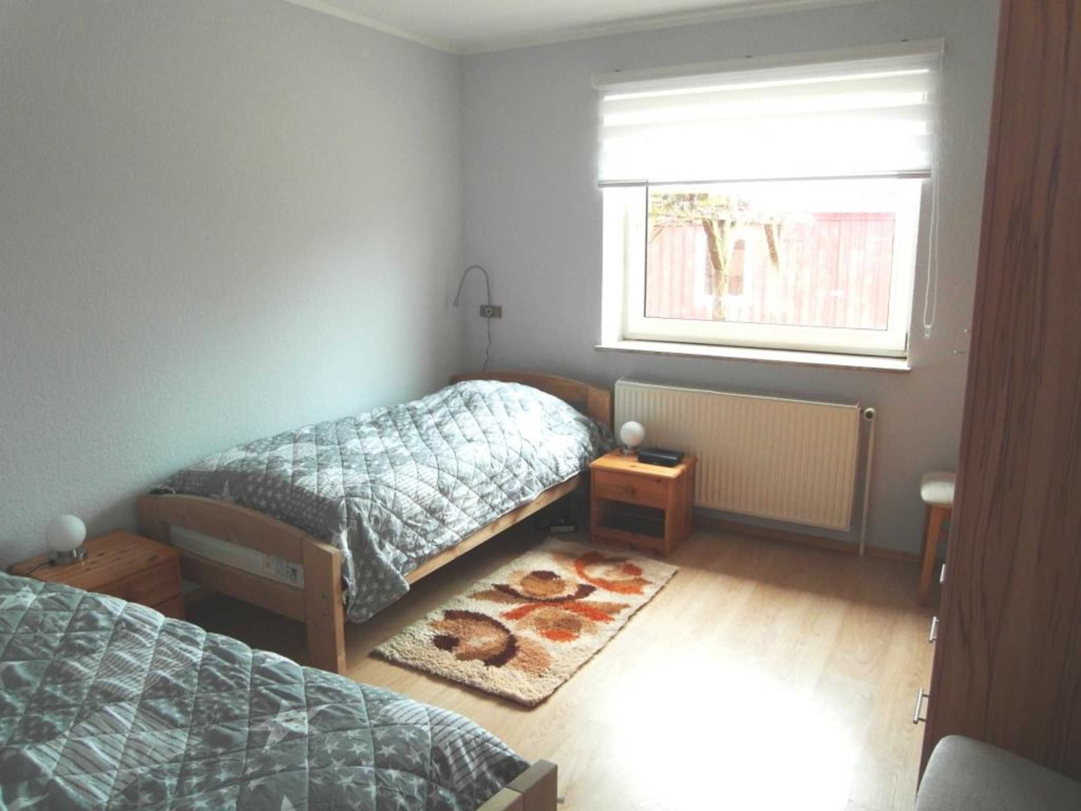 ein Schlafzimmer mit zwei Betten, Nachttischen, Kleiderschrank, Radiowecker