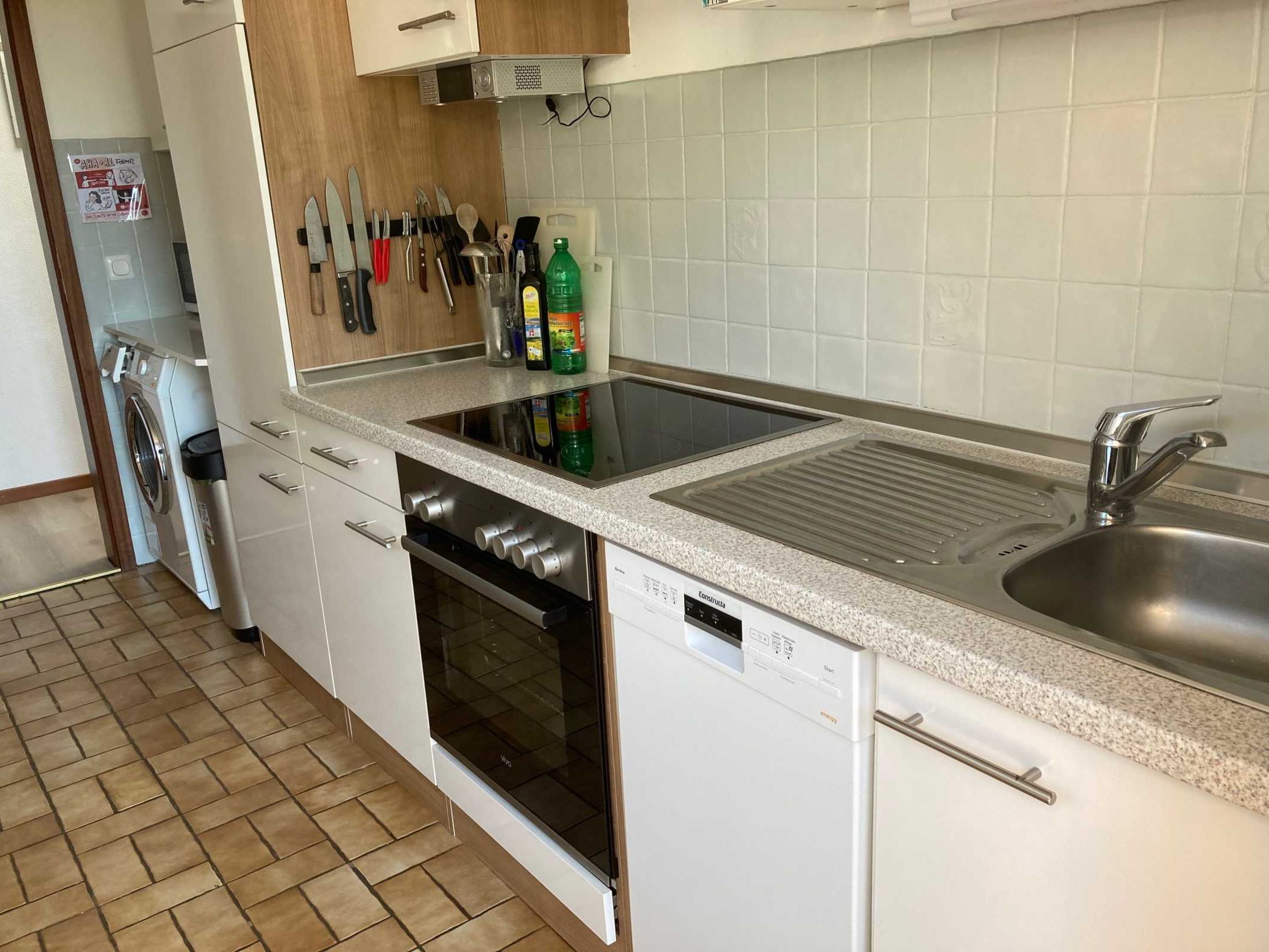 Küche: Herd mit Backofen, Mikrowelle, Kühlschrank mit Gefrierfach, Geschirrspülmaschine, Waschmaschine, Kaffeemaschine, Wasserkocher, Eierkocher, Toaster, Radio