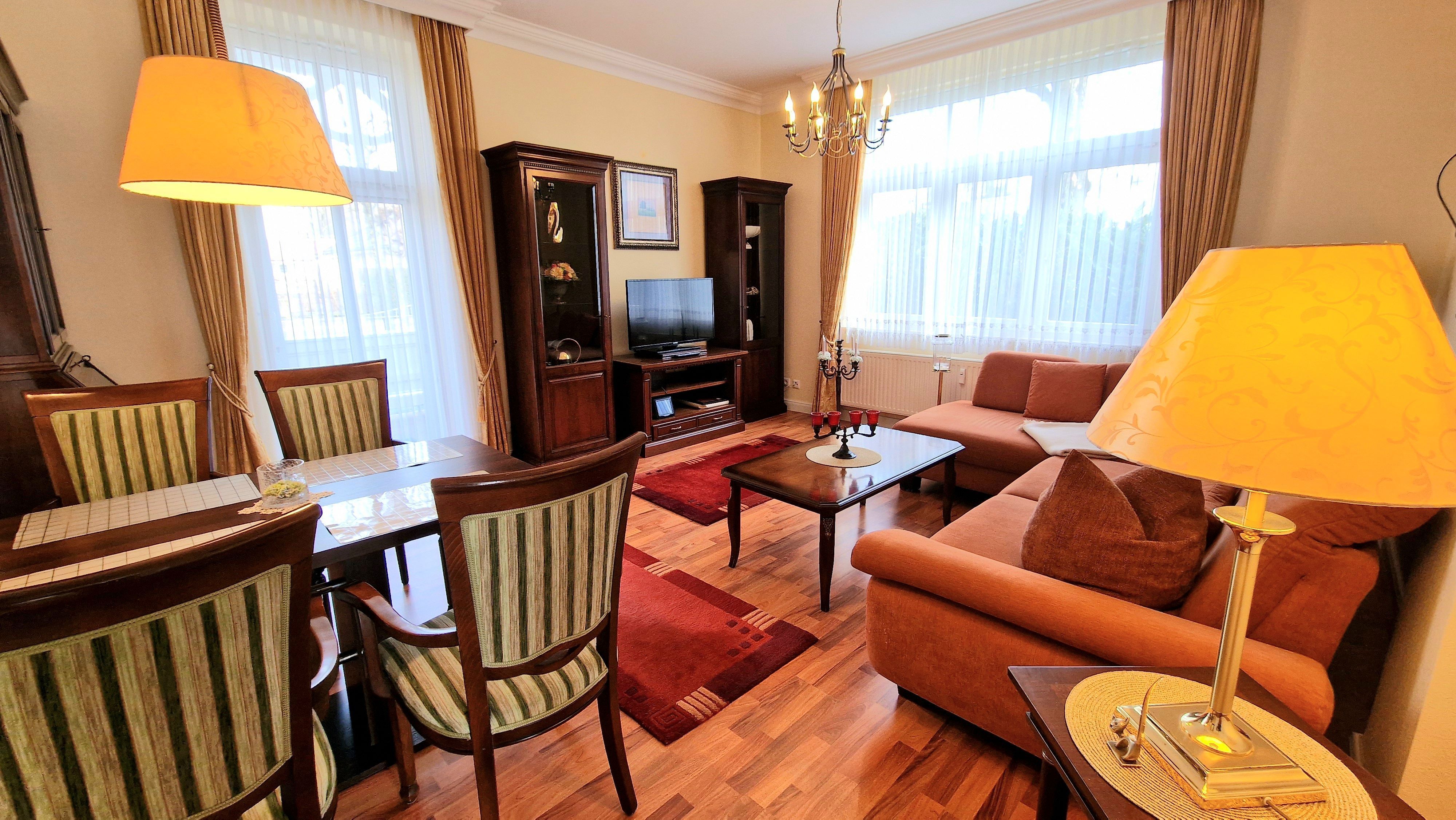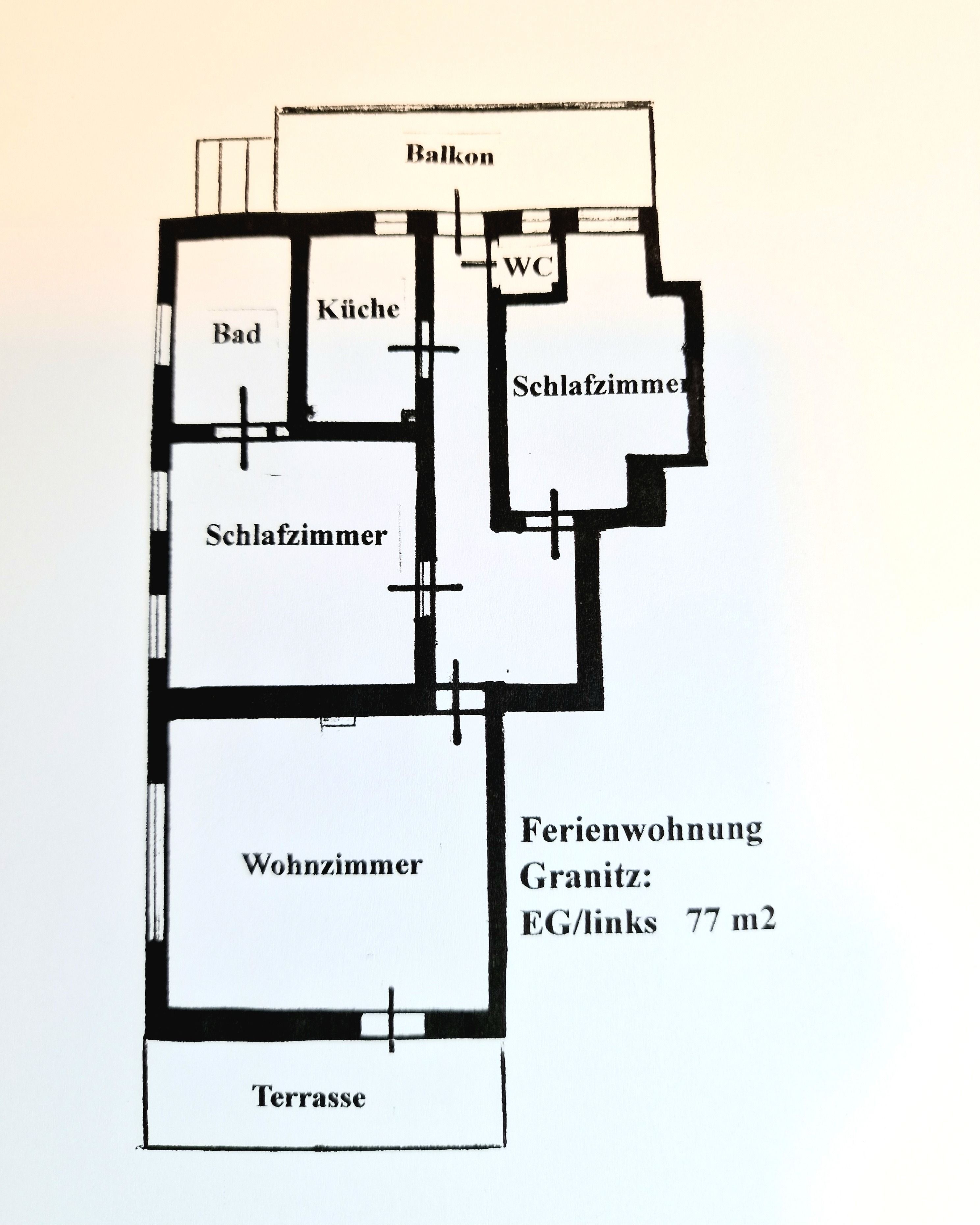 3-Raum-Ferienwohnung mit Balkon und Terrasse. 2 Schlafzimmer, ca. 77 qm, Du/WC und Wannenbad, Nichtraucherwohnung, bis 3 Personen, separate Küche, 1. Schlafzimmer mit Doppelbett, 2. Schlafzimmer große Schlafcouch. Das Mitbringen von Haustieren ist nicht gestattet