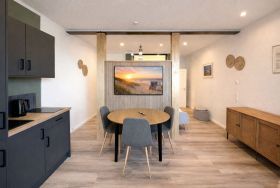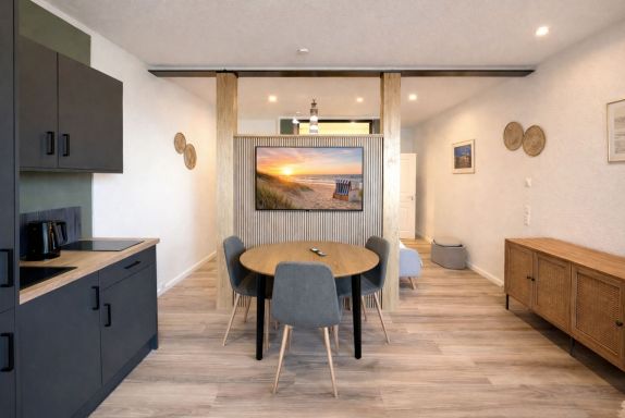 Im großzügigen Wohnbereich können Sie nach einem Tag am Meer die Füße hochlegen, ein gutes Buch lesen oder gemeinsam den nächsten Ausflug planen. Für den perfekten Start in den Tag oder die kleine Pause zwischendurch steht Ihnen eine praktische Küchenzeile zur Verfügung. Sie ist ideal ausgestattet für ein gemütliches Frühstück, kleine Snacks oder die Zubereitung von Tee und Kaffee - so gestalten Sie Ihren Urlaub ganz nach Ihren Wünschen und sind völlig unabhängig. Am Esstisch genießen Sie Ihre Mahlzeiten und lassen den Tag entspannt ausklingen.