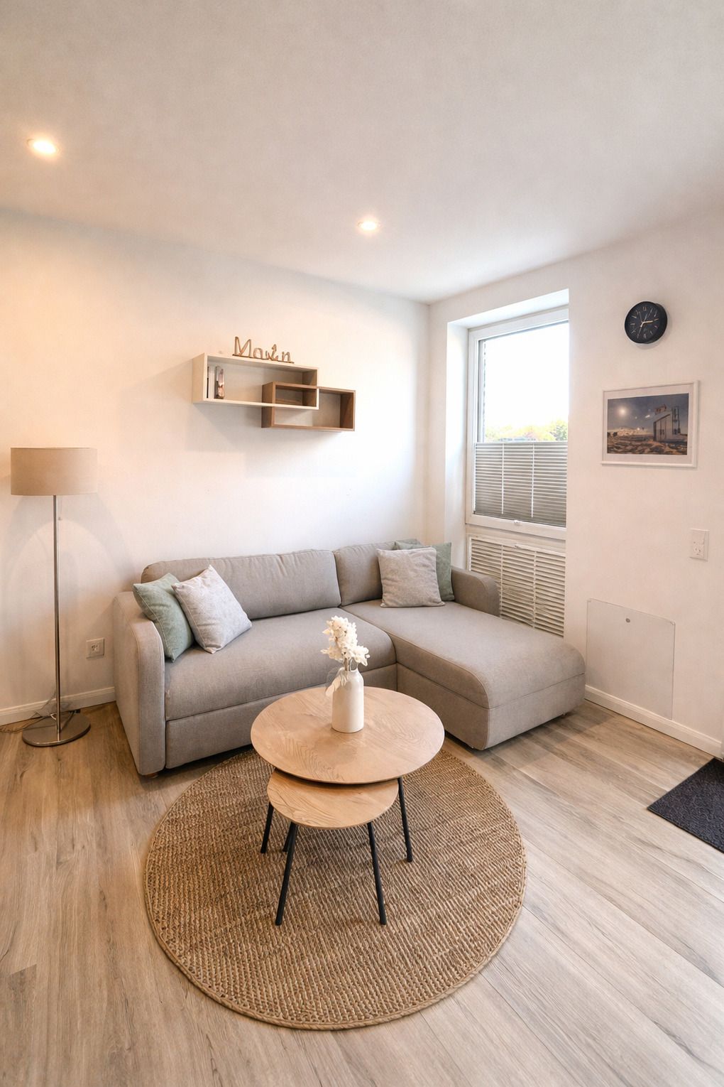 Heller Wohnbereich mit gemütlicher Sitzecke und TV