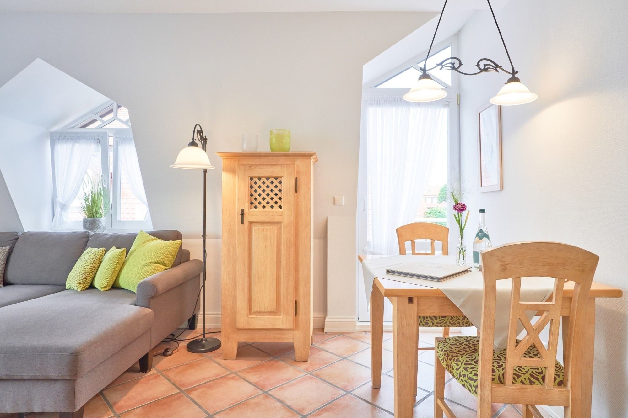 In dieser Ferienwohnung handelt es sich um eine Ferienwohnung für 2 Personen im 1. OG. Auf ca. 43 qm verteilen sich Wohnzimmer mit geräumiger, integrierter Küche und Essplatz. Sie haben von hier aus Zugang zu zwei Balkonen. Das Badezimmer präsentiert sich modern und in hellen Farben mit Dusche, Toilette und Waschbecken. Ebenfalls hier zu finden ist das gemütliche Schlafzimmer mit Doppelbett.