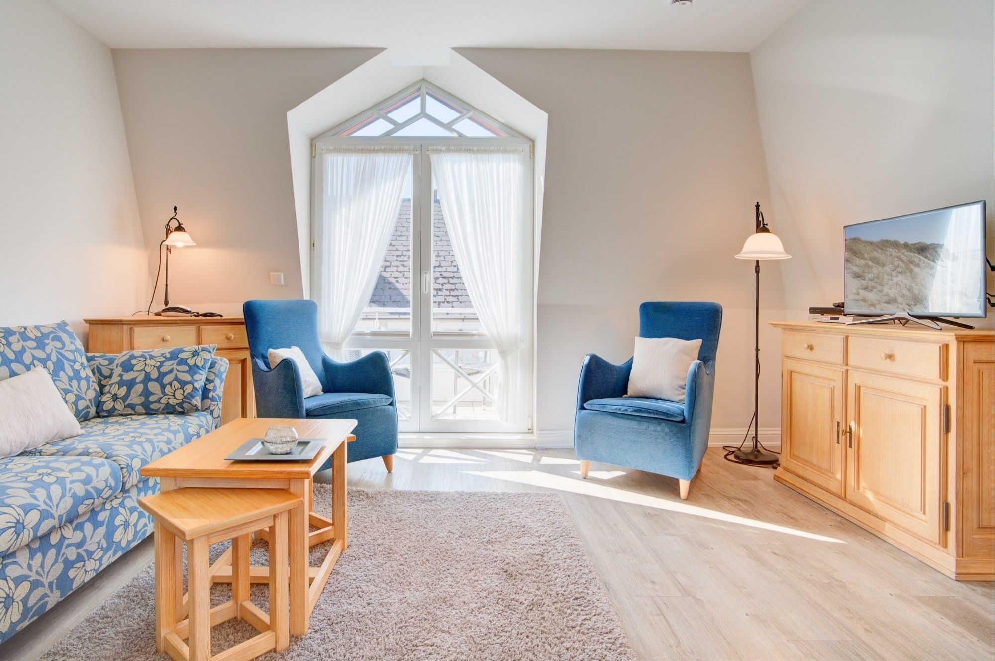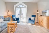 Diese Ferienwohnung bietet Platz für 2-3 Personen. Auf ca. 56 qm verteilen sich Wohnzimmer mit geräumiger, integrierter Küche und Essplatz, ein Doppelbettschlafzimmer, zwei Duschbäder und ein Balkon.