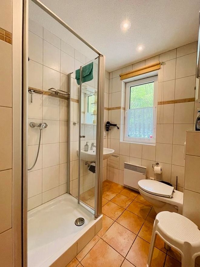- Ein modernes Badezimmer mit Dusche und WC