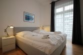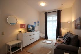 Im Wohnraum befindet sich eine komplett ausgestattete Küchenzeile mit Geschirrspüler, Backofen, Ceranfeld, Kühlschrank, Mikrowelle, Kaffeemaschine, Wasserkocher und Toaster. Im separaten Schlafraum finden Sie ein Doppelbett und einen Kleiderschrank. Vom vorgelagerten Flur aus erreichen Sie das Duschbad mit Waschtisch und WC. Im Wohnraum gibt es eine Sitz- und Essecke, ein Schlafsofa, einen WLAN-Zugang sowie ein TV-Gerät.