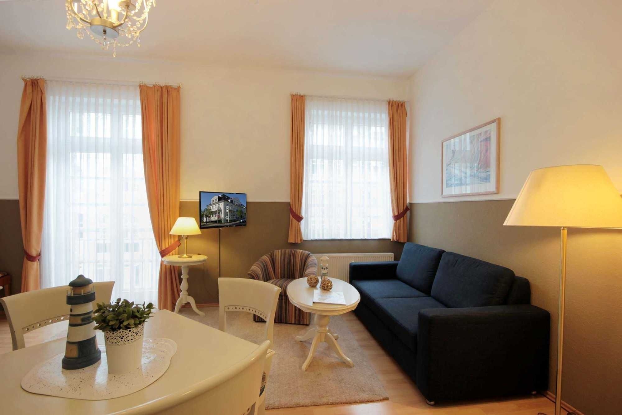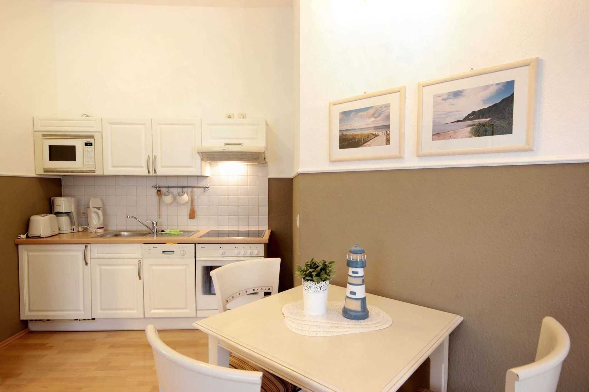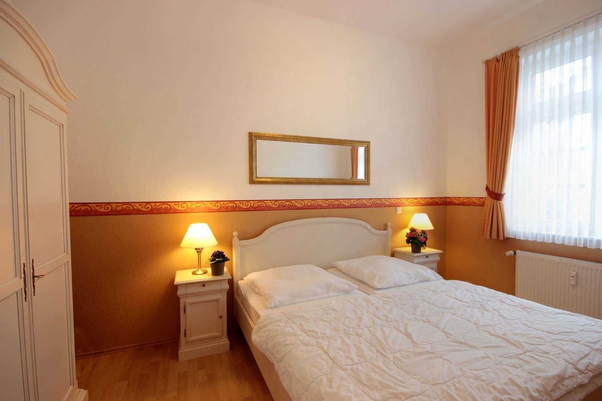 Im Wohnraum befindet sich eine komplett ausgestattete Küchenzeile mit Geschirrspüler, Backofen, Ceranfeld, Kühlschrank, Mikrowelle, Kaffeemaschine, Wasserkocher und Toaster. Im separaten Schlafraum finden Sie ein Doppelbett und einen Kleiderschrank. Vom vorgelagerten Flur aus erreichen Sie das Duschbad mit Waschtisch und WC. Im Wohnraum gibt es eine Sitz- und Essecke, ein Schlafsofa sowie ein TV-Gerät und Radio. Für die bequeme Erreichbarkeit ist ein Aufzug vorhanden. Ein PKW-Stellplatz steht Ihnen auf dem Parkplatz Zentrum ( ca. 400m vom Objekt entfernt ) zur Verfügung. All unseren Gästen steht ein kostenfreier WLAN Zugang zur Verfügung.