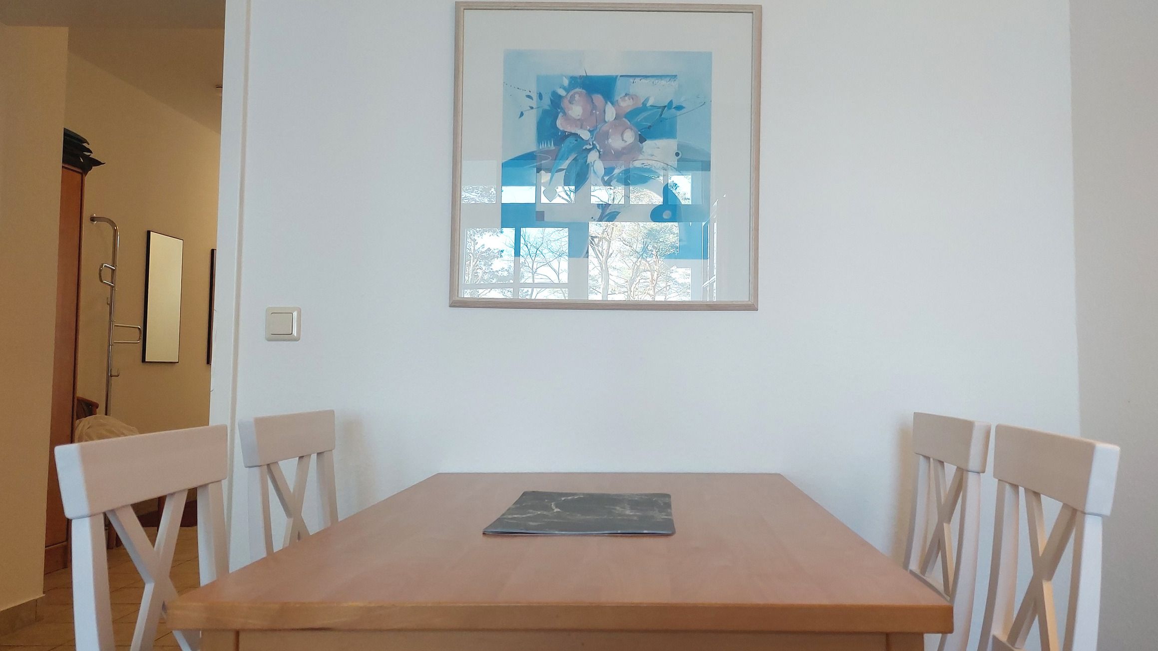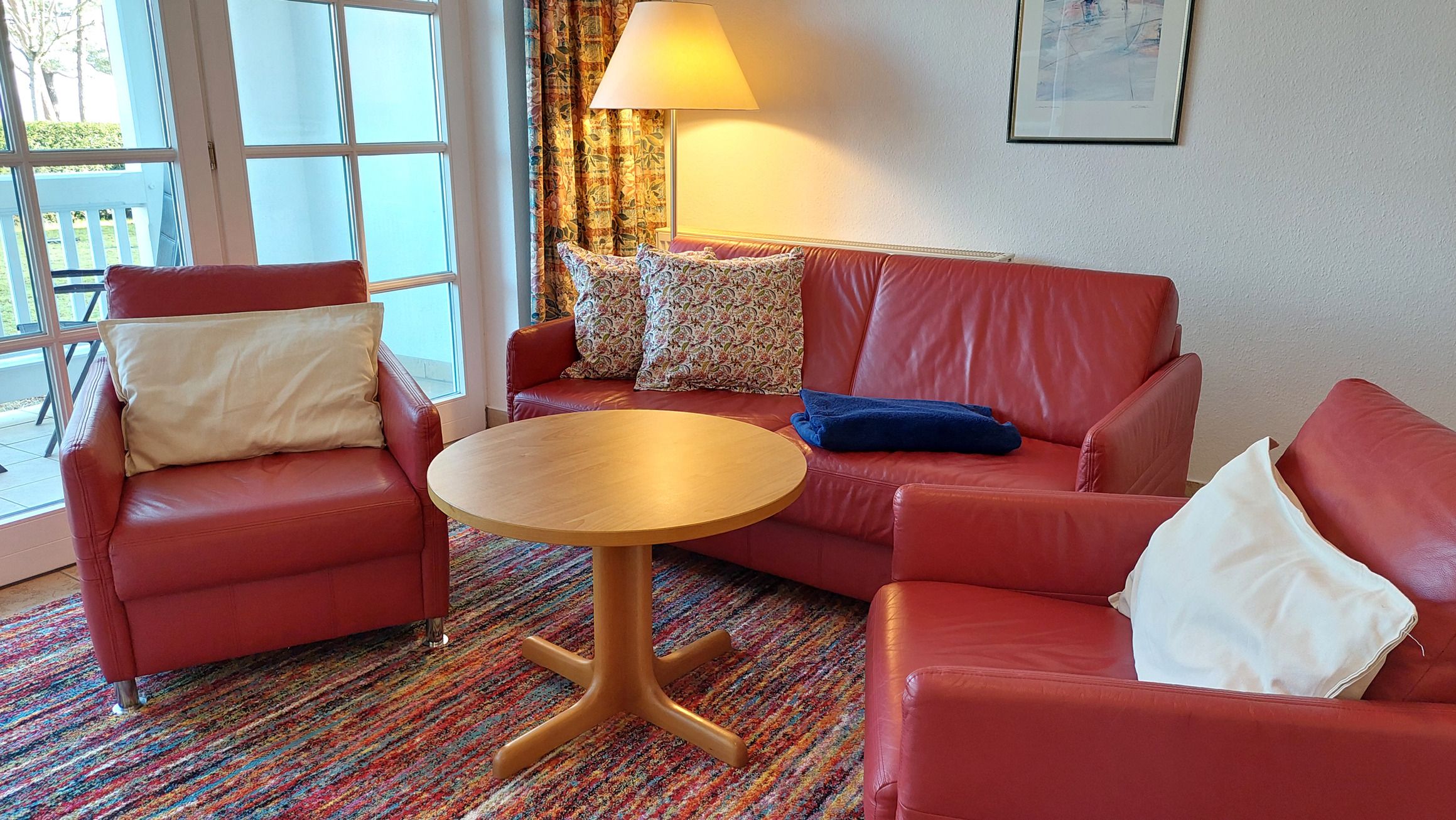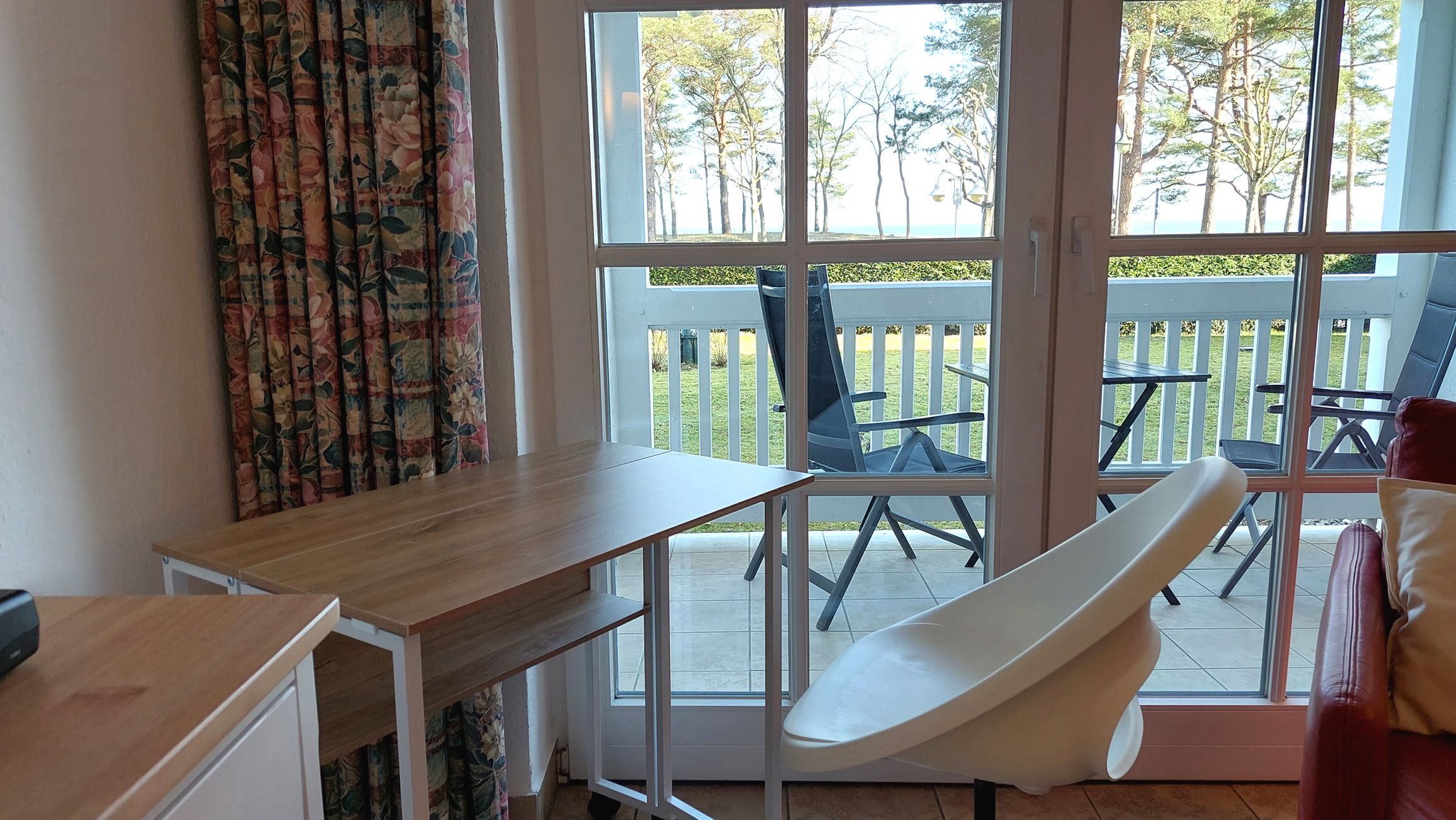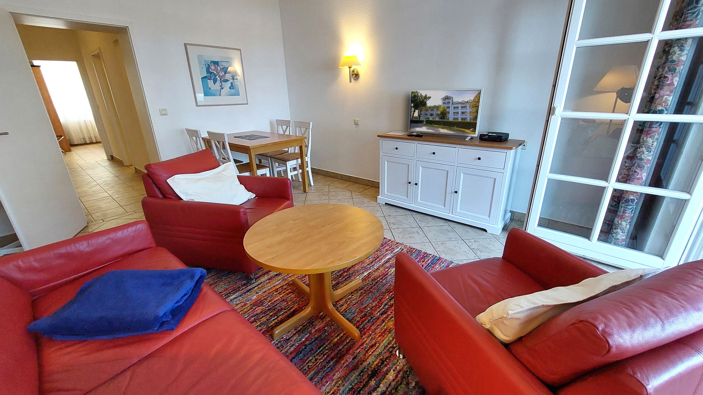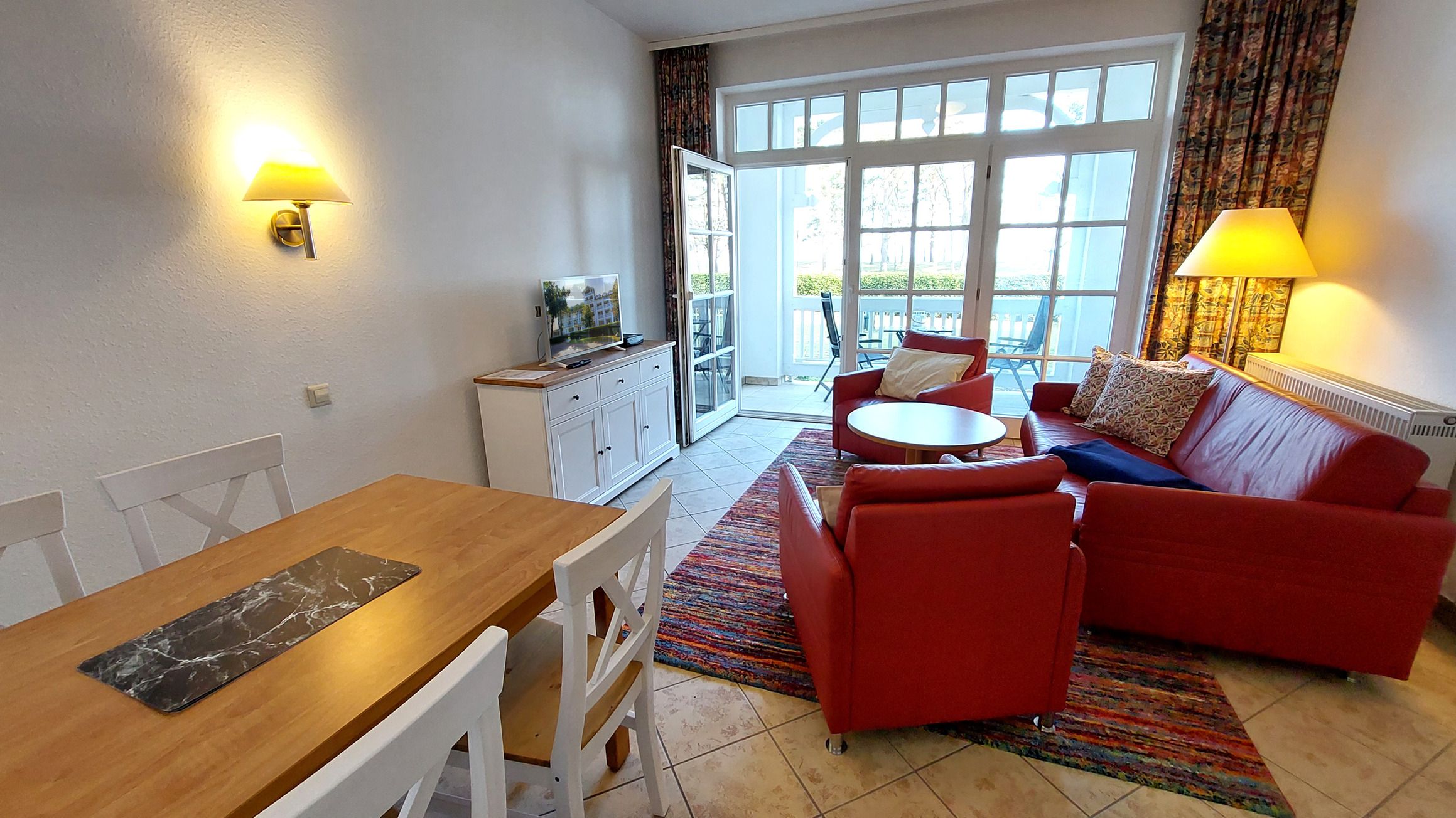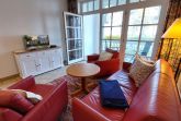 Das Wohnzimmer verfügt über einen Essbereich mit 4 Sitzgelegenheiten. Die gemütliche Sitzlandschaft, samt 2 Sesseln, läd zum Verweilen ein und bietet bei Bedarf auch eine Schlaffunktion für zwei weitere Personen. Zudem garantiert der Smart-TV gute Unterhaltung für jede Wetterlage. Falls doch einmal Homeoffice ansteht, bietet die Wohnung neben schnellem WLAN auch einen ausklappbaren und mobilen Schreibtisch, welcher Workation sogar mit Meerblick möglich macht.
