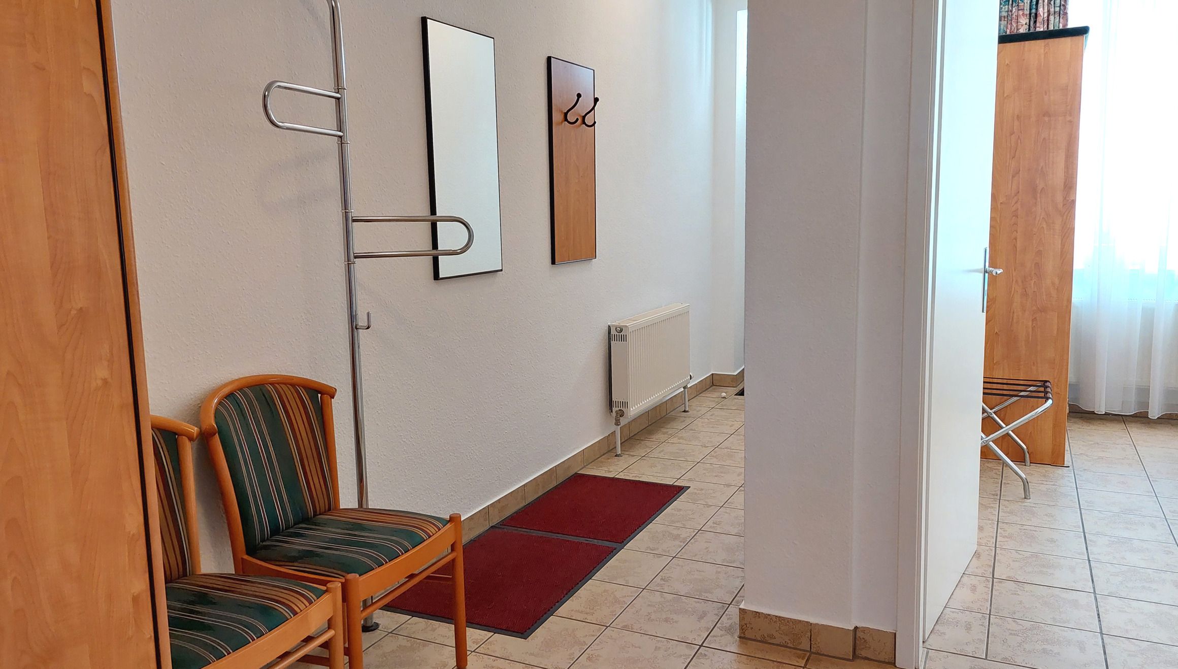 Der Flurbereich bietet ausreichend Stauraum im Kleiderschrank (samt Safe) und dem kleinen Abstellraum. Von dort haben Sie Zugang zum Wohnzimmer, Bad, Schlafzimmer und zur separaten Küche.