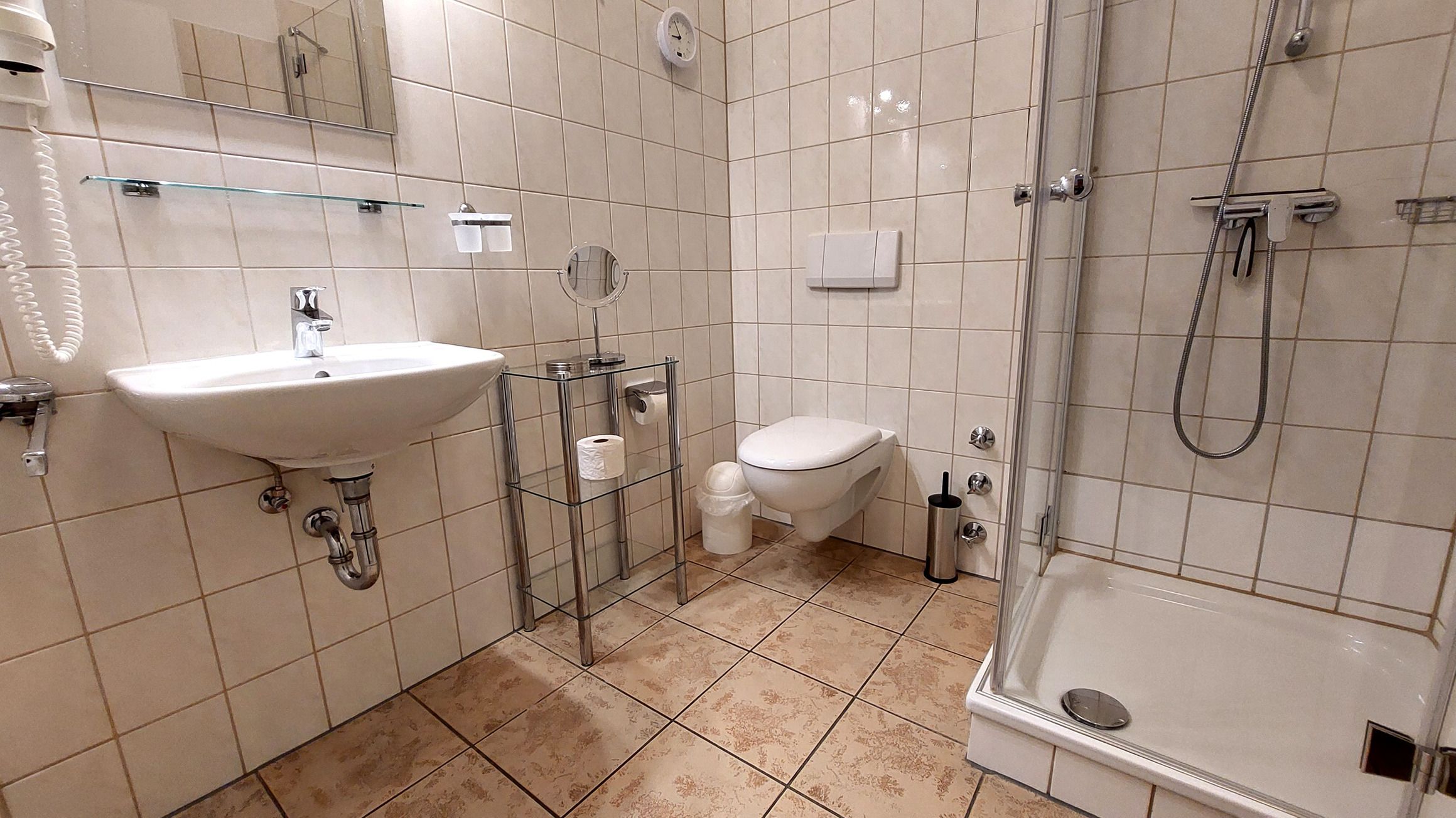 Das geräumige Badezimmer verfügt über eine Dusche, WC und Waschtisch sowie über einen Kosmetikspiegel und einen Fön.