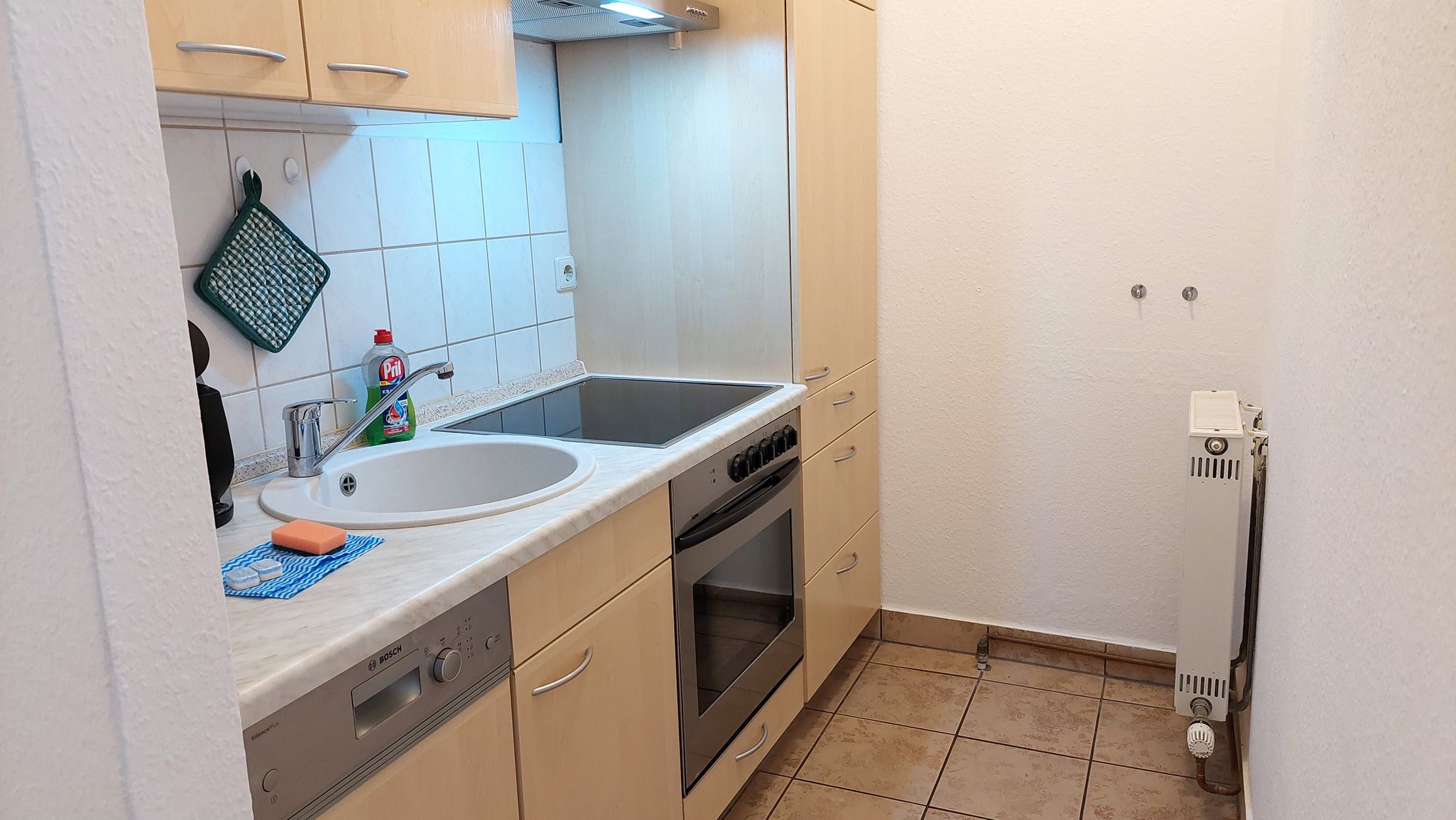 Im Kochbereich finden Sie ein Cerankochfeld, ein Backofen, einen Geschirrspüler, einen Kühlschrank mit Gefrierfach und viele weitere nützliche Küchenhelfer.