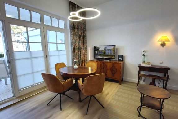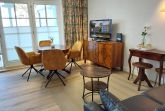 Das Wohnzimmer verfügt über einen hochwertigen Essbereich, 2 Sessel, Smart-TV und ein gemütliches Sofa (mit Schlaffunktion für 2 weitere Personen).