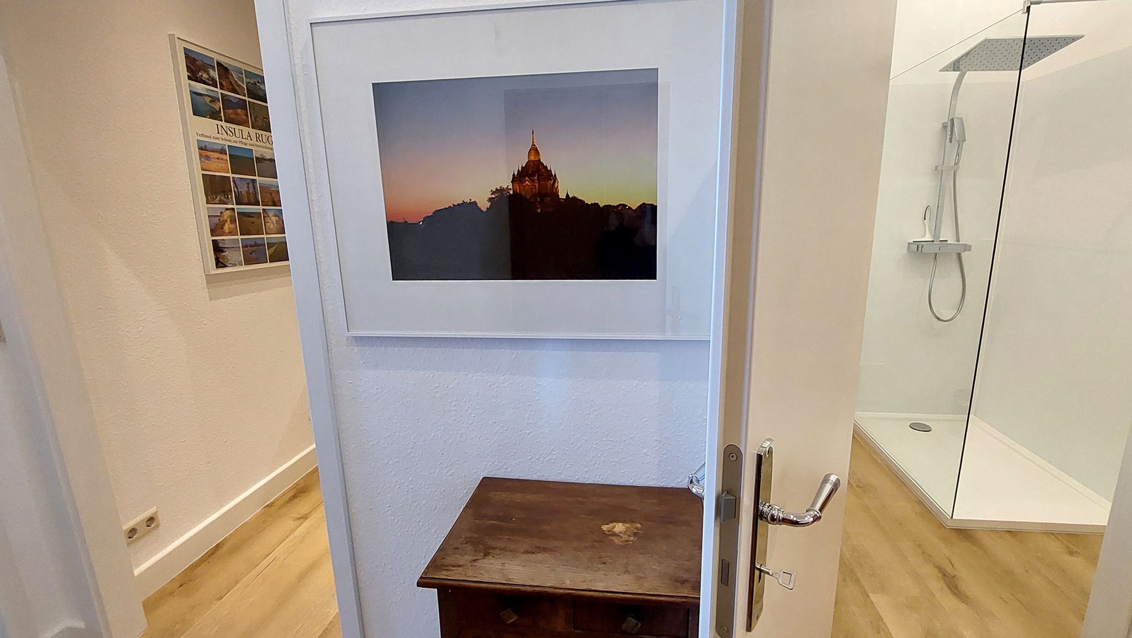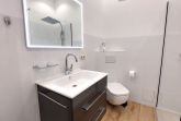 Das geräumige Badezimmer verfügt über eine Dusche, WC und Waschtisch sowie über einen Hocker, einen Fön und viel Ablagefläche.