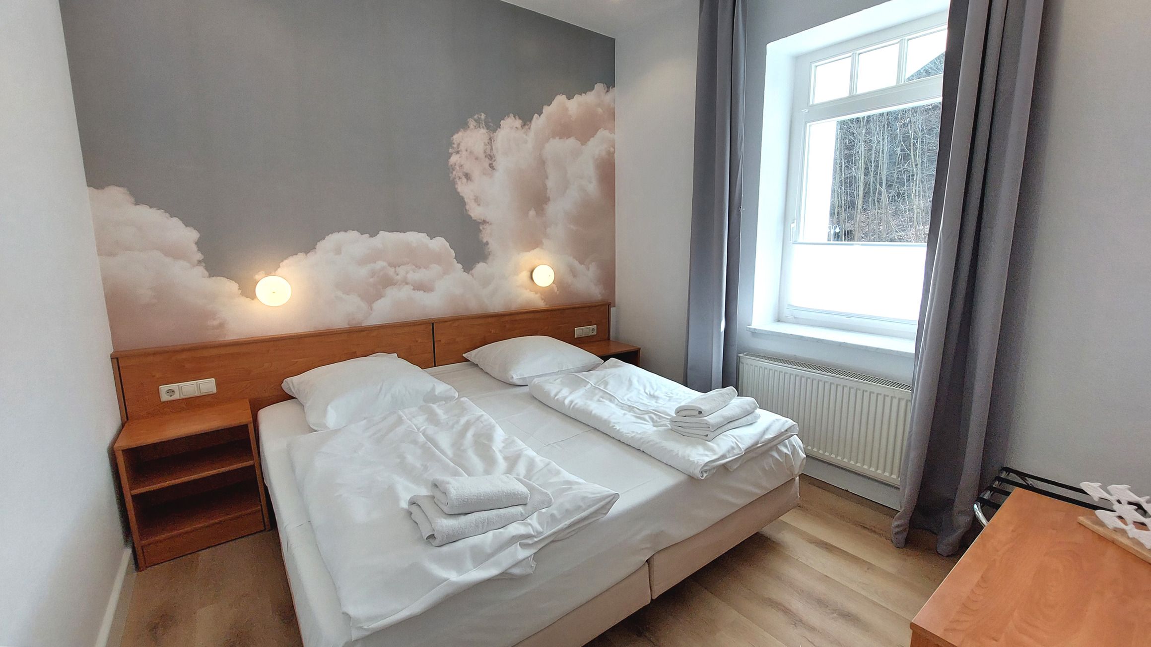 Im Schlafzimmer finden Sie ein Doppelbett samt Nachttischen.