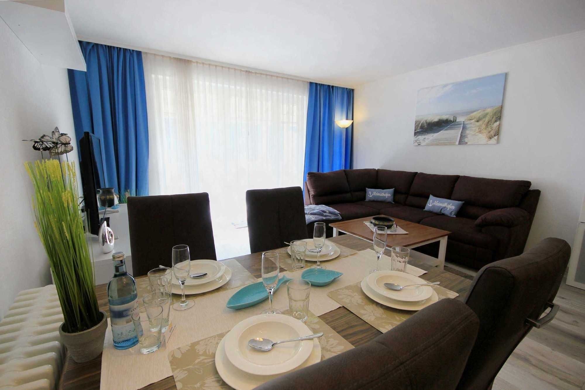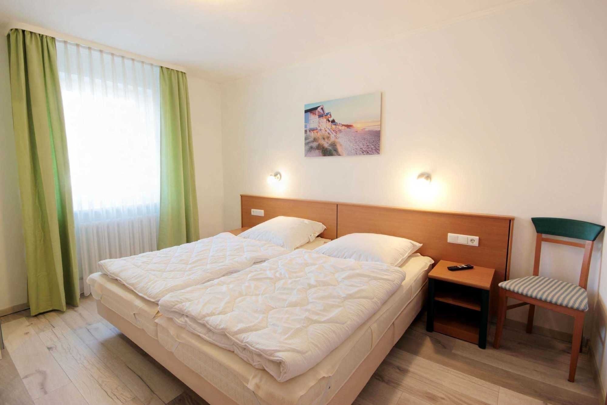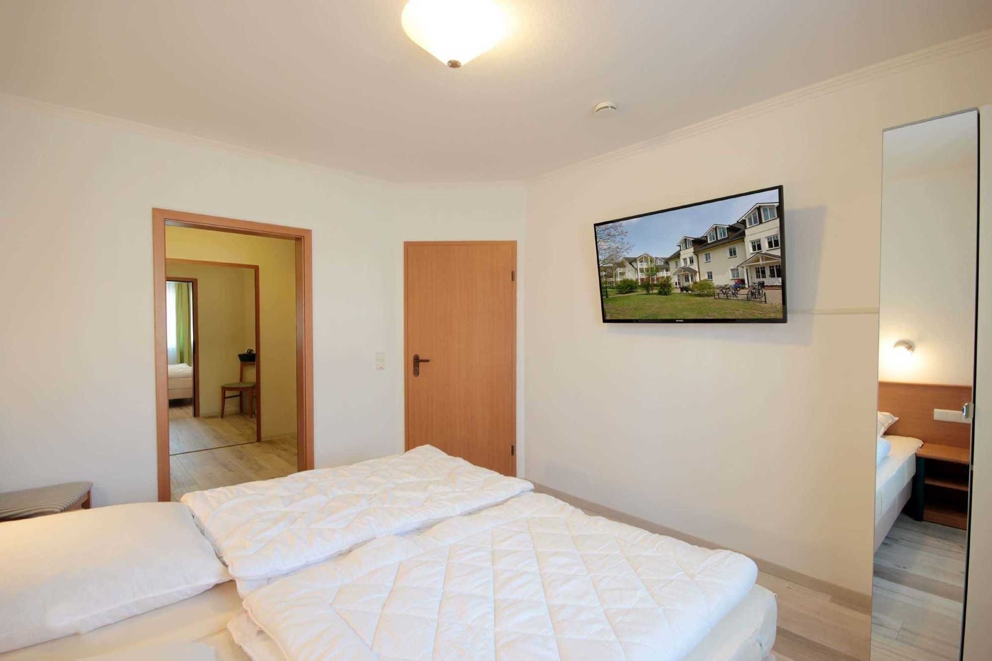 Ihre modern eingerichtete 2-Raum Ferienwohnung 16RB104 hat eine Größe von ca. 62 qm und ist für max. 4 Personen eingerichtet. Sie befindet sich 1. Obergeschoss und verfügt über einen überdachten Südbalkon. Der Wohnraum teilt sich in eine Küchenzeile mit Mikrowelle, Kühlschrank, Geschirrspüler, Kaffeemaschine, Toaster und andere Küchenhelfer sowie einen gemütlichen Essplatz und Wohnbereich mit Flachbild-TV, Stereoanlage und Blu-ray DVD-Player. Die Couch kann für 2 Personen zum Schlafen schnell ausgezogen werden, zudem verfügt das Wohnzimmer über zusätzliche Verdunklungsstoffe für einen angenehmen Schlaf. Vom Wohnraum gelangen Sie auf den großen und möblierten Südbalkon, der auch für 4 Personen reichlich Platz zum Sitzen oder Sonnen bietet. Vom Schlafraum mit Doppelbett, zusätzlichem TV und Verdunklungsstoffen gelangen Sie in den Ankleideraum und von diesem ins Bad (das Bad ist auch über den Flur erreichbar). Dieses ist mit einer Fußbodenheizung versehen und exklusiv mit Granit gefliest. Dusche, Waschtisch, WC und Fön gehören zur Ausstattung. Ihre Kleidung und Koffer können Sie im separaten Ankleidezimmer verstauen. Für die kleinen Gäste ist ein Kinderreisebett sowie ein Hochstuhl vorhanden. Ein Internetzugang steht unseren Gästen zur Verfügung. Ein wohnungseigener PKW-Stellplatz steht Ihnen in der Tiefgarage zur Verfügung.
