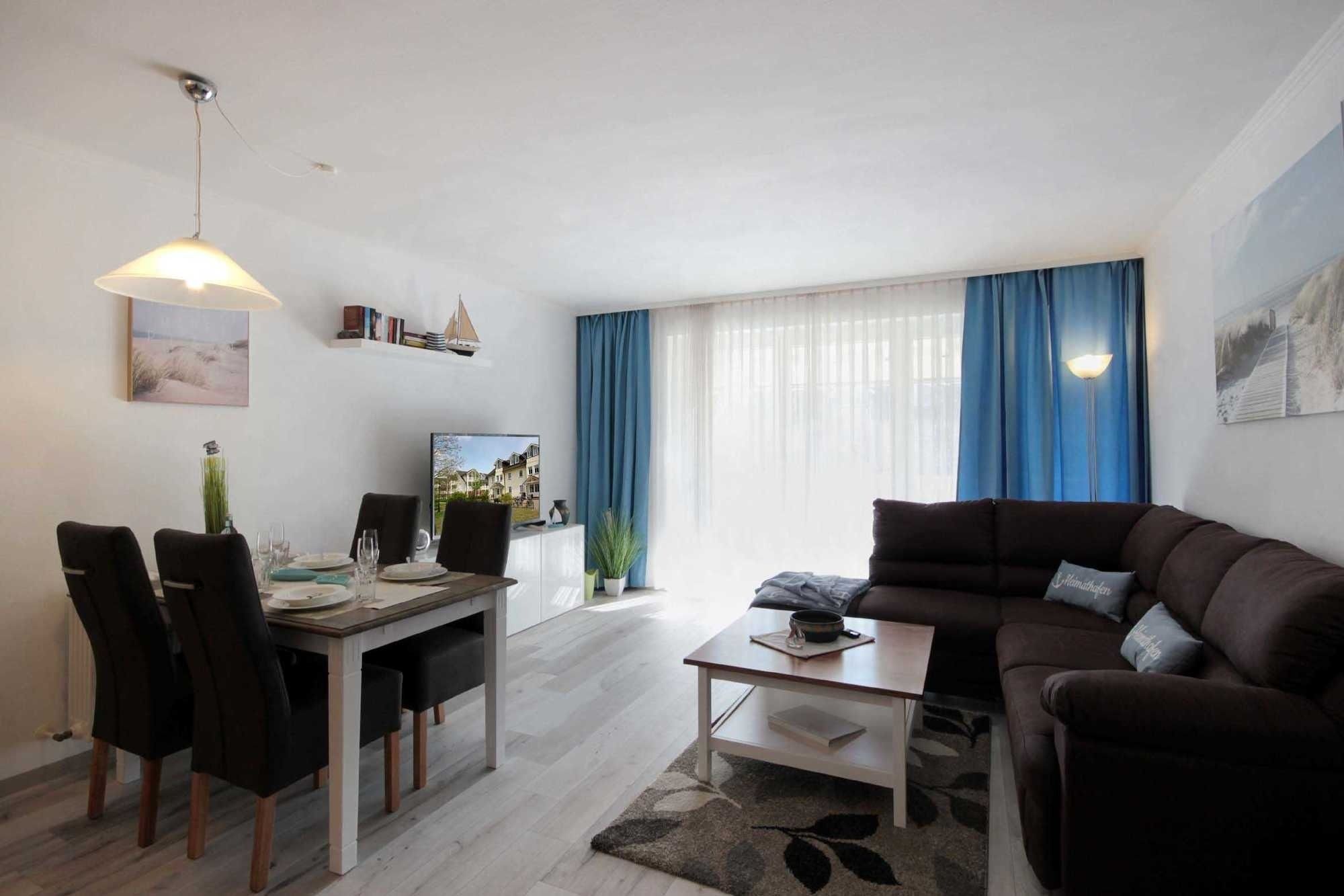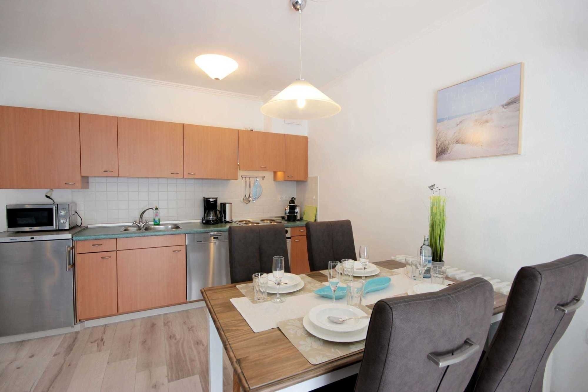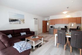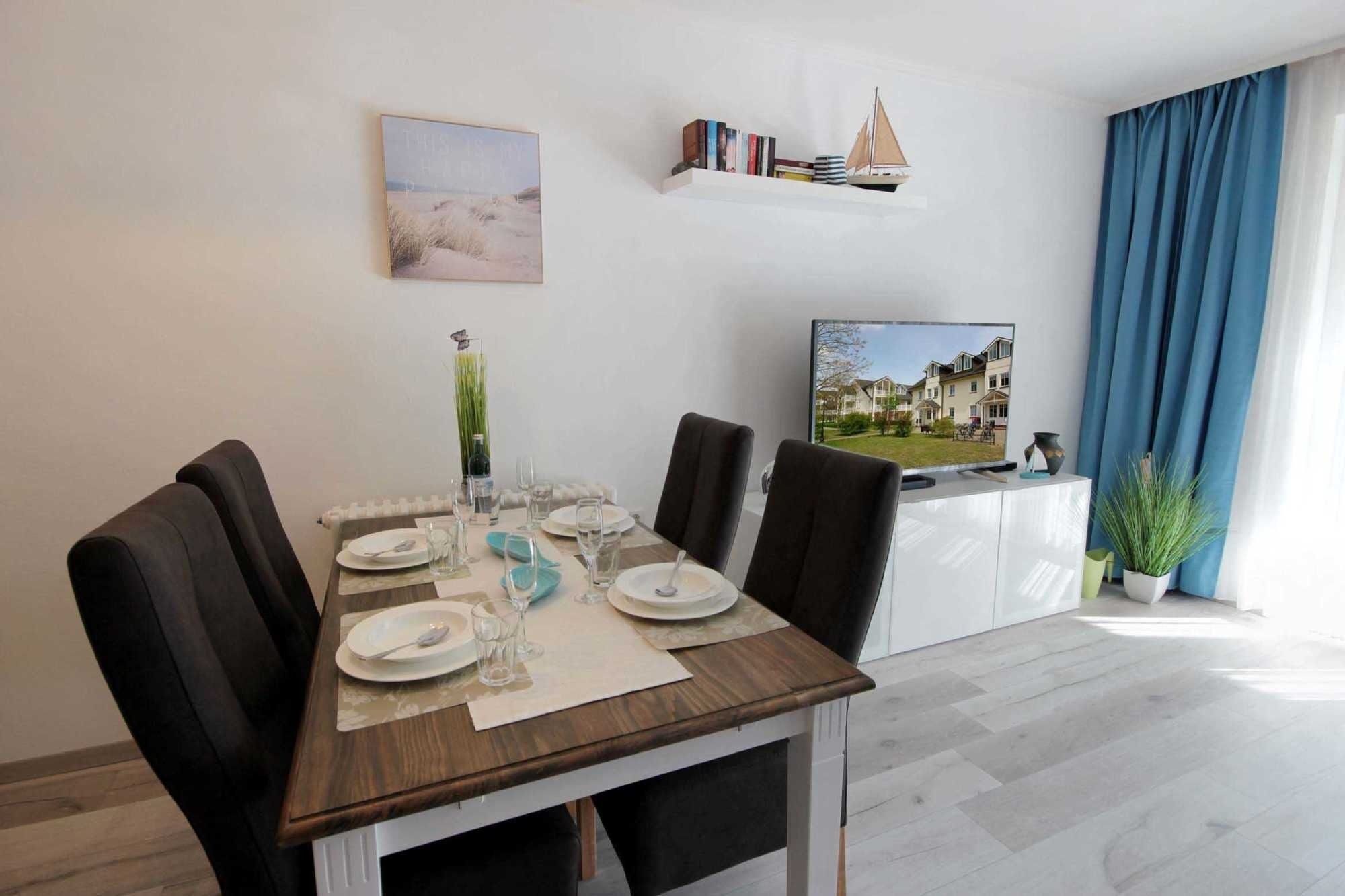 Ihre modern eingerichtete 2-Raum Ferienwohnung 16RB104 hat eine Größe von ca. 62 qm und ist für max. 4 Personen eingerichtet. Sie befindet sich 1. Obergeschoss und verfügt über einen überdachten Südbalkon. Der Wohnraum teilt sich in eine Küchenzeile mit Mikrowelle, Kühlschrank, Geschirrspüler, Kaffeemaschine, Toaster und andere Küchenhelfer sowie einen gemütlichen Essplatz und Wohnbereich mit Flachbild-TV, Stereoanlage und Blu-ray DVD-Player. Die Couch kann für 2 Personen zum Schlafen schnell ausgezogen werden, zudem verfügt das Wohnzimmer über zusätzliche Verdunklungsstoffe für einen angenehmen Schlaf. Vom Wohnraum gelangen Sie auf den großen und möblierten Südbalkon, der auch für 4 Personen reichlich Platz zum Sitzen oder Sonnen bietet. Vom Schlafraum mit Doppelbett, zusätzlichem TV und Verdunklungsstoffen gelangen Sie in den Ankleideraum und von diesem ins Bad (das Bad ist auch über den Flur erreichbar). Dieses ist mit einer Fußbodenheizung versehen und exklusiv mit Granit gefliest. Dusche, Waschtisch, WC und Fön gehören zur Ausstattung. Ihre Kleidung und Koffer können Sie im separaten Ankleidezimmer verstauen. Für die kleinen Gäste ist ein Kinderreisebett sowie ein Hochstuhl vorhanden. Ein Internetzugang steht unseren Gästen zur Verfügung. Ein wohnungseigener PKW-Stellplatz steht Ihnen in der Tiefgarage zur Verfügung.