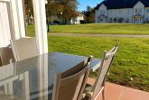 Vom Wohnzimmer aus gelangt man auf die möblierte und überdachte Terrasse mit Blick ins Grüne.