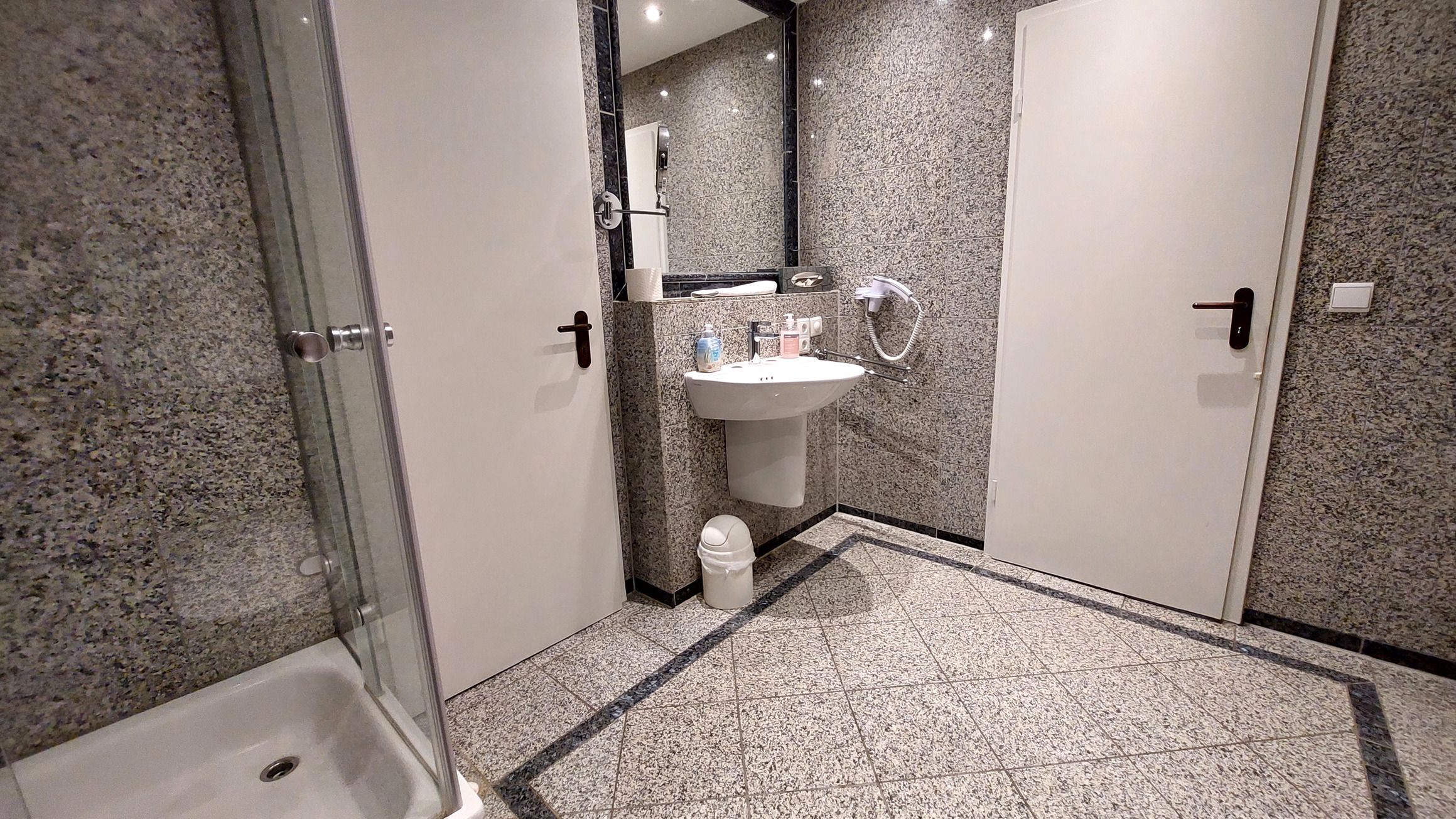 Das Badezimmer ist in Marmoroptik gehalten und verfügt über eine Toilette, einen Waschtisch, eine Dusche, einen Kosmetikspiegel, Fön und Zugang zum Ankleidezimmer mit viel Stauraum.