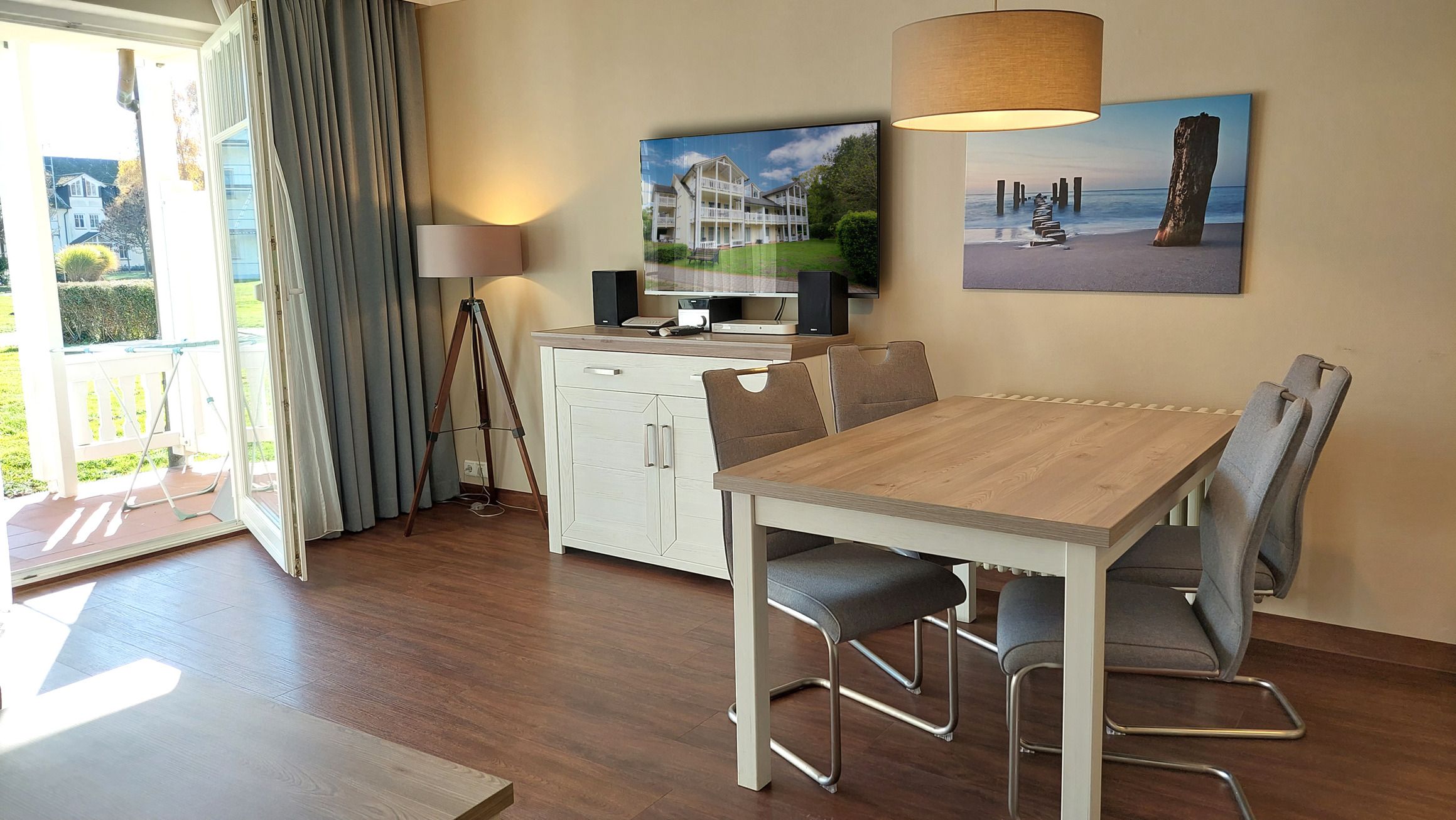 Der Wohn- und Essbereich beherbergt eine moderne Küchenzeile mit Ceran-Kochfeldern, einem Geschirrspüler, einem Kühlschrank mit Gefrierfach, einer Mikrowelle und verschiedenen Küchenutensilien. Der Essbereich bietet Platz für 4 Personen und eine gemütliche Sitzlandschaft lädt zum Verweilen ein. Zur technischen Ausstattung gehören kostenfreies WLAN, ein Smart-TV samt Blu-ray-Player und eine kleine Musikanlage.