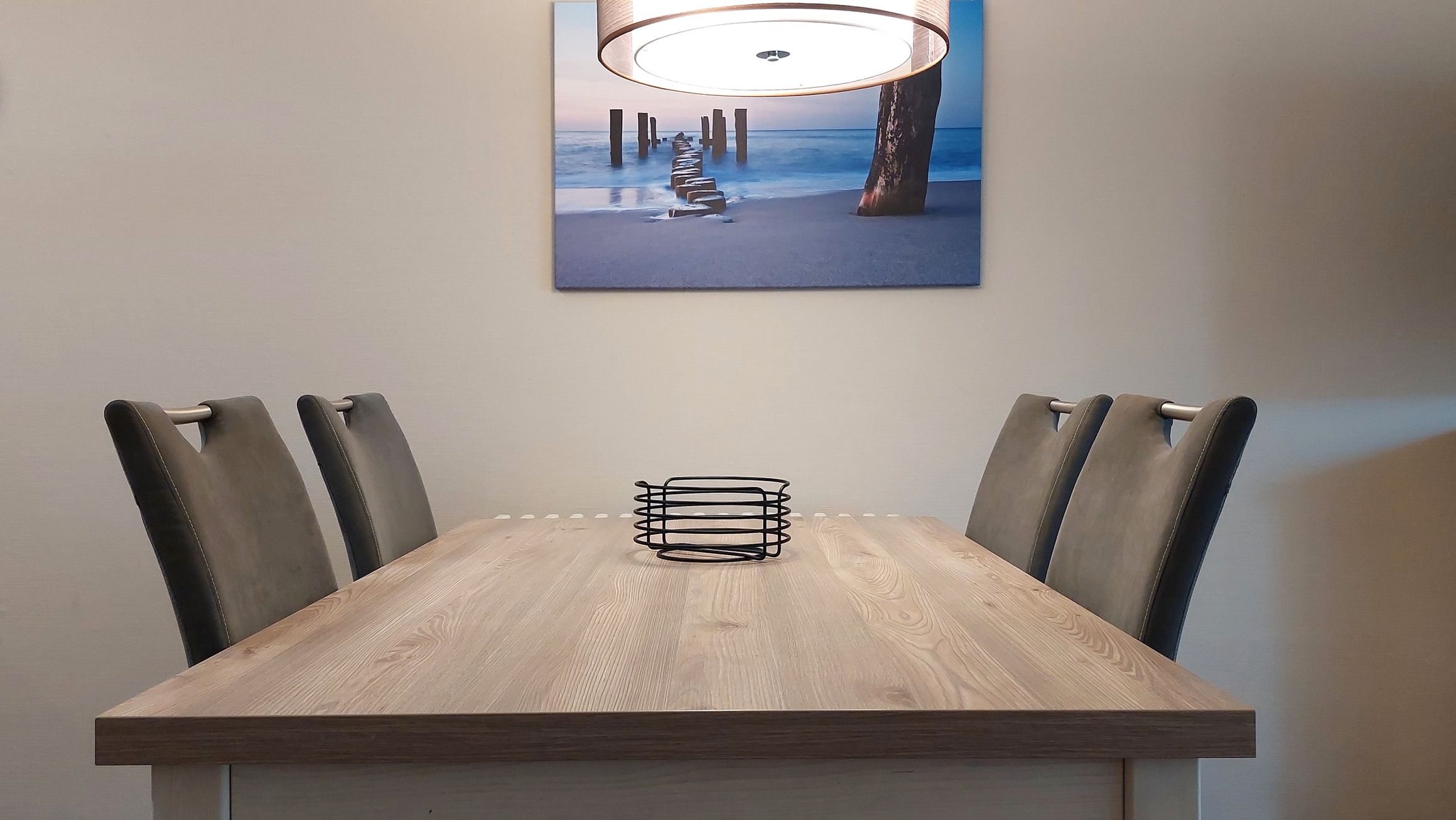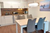 Der Wohn- und Essbereich beherbergt eine moderne Küchenzeile mit Ceran-Kochfeldern, einem Geschirrspüler, einem Kühlschrank mit Gefrierfach, einer Mikrowelle und verschiedenen Küchenutensilien. Der Essbereich bietet Platz für 4 Personen und eine gemütliche Sitzlandschaft lädt zum Verweilen ein. Zur technischen Ausstattung gehören kostenfreies WLAN, ein Smart-TV samt Blu-ray-Player und eine kleine Musikanlage.