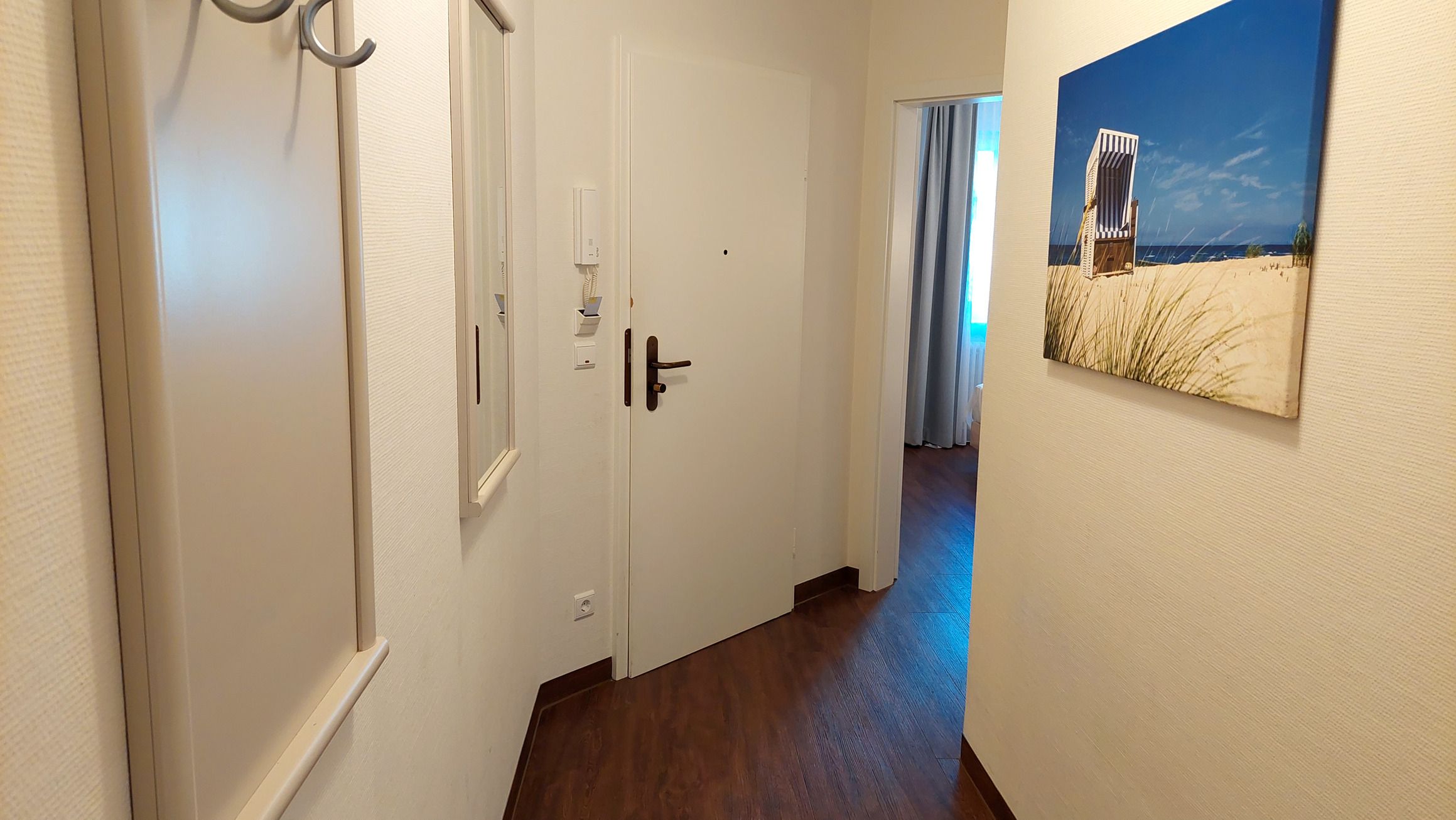 Der Flur führt zu den einzelnen Räumen, darunter das Schlafzimmer, das Badezimmer und den großen, hellen Wohnbereich.