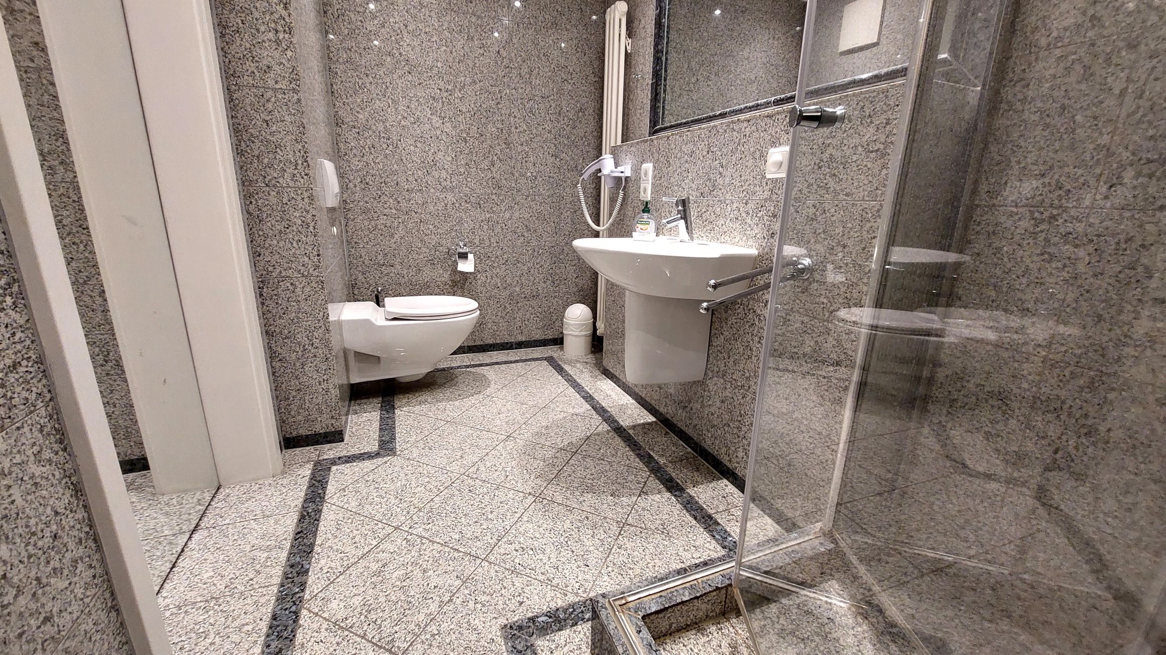 Das Badezimmer ist in Marmoroptik gehalten und verfügt über eine Toilette, einen Waschtisch, eine Dusche, einen Kosmetikspiegel, Fön und Zugang zum Ankleidezimmer mit viel Stauraum.