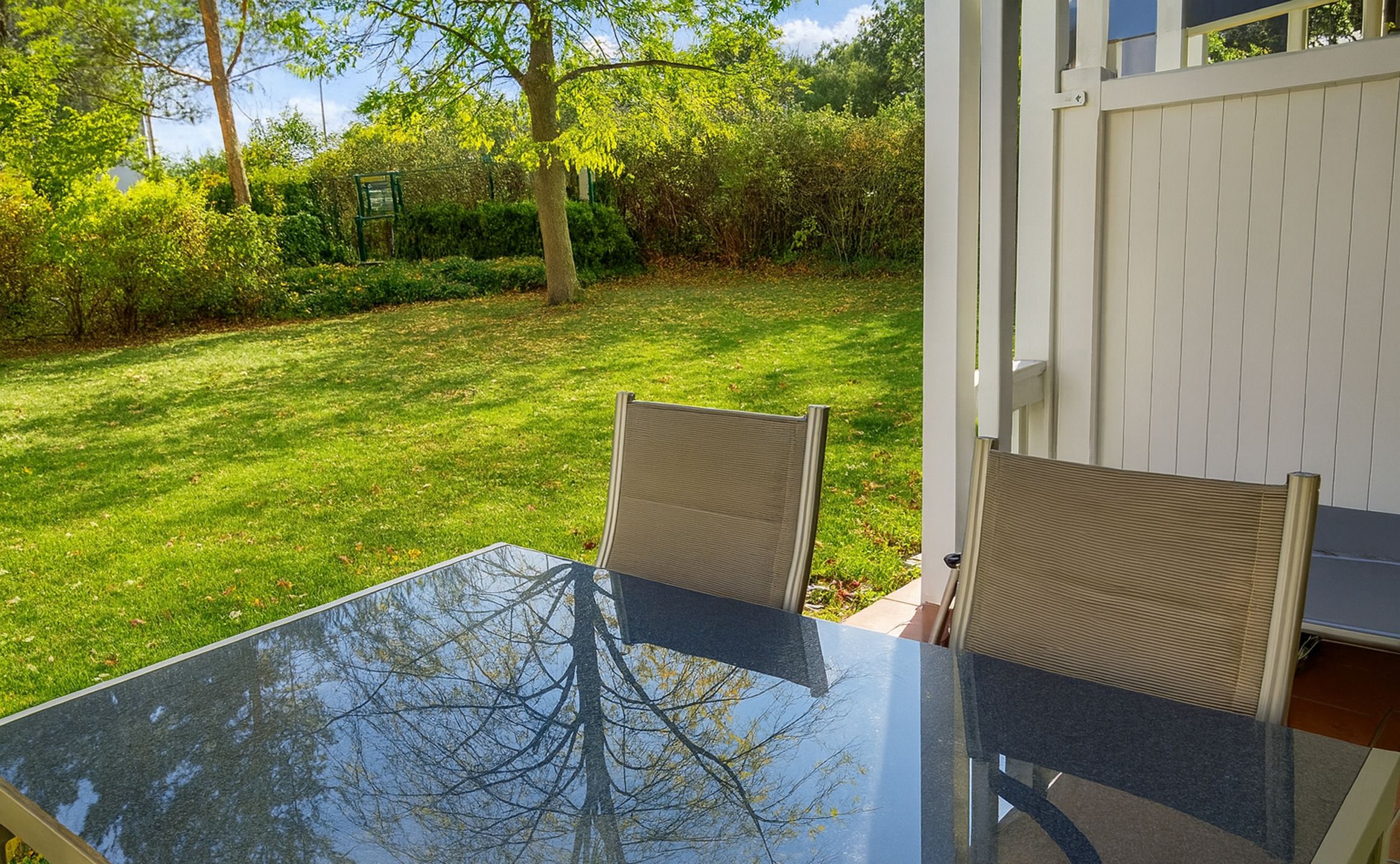 Vom Wohnzimmer aus gelangt man auf die möblierte und überdachte Terrasse mit Blick ins Grüne.